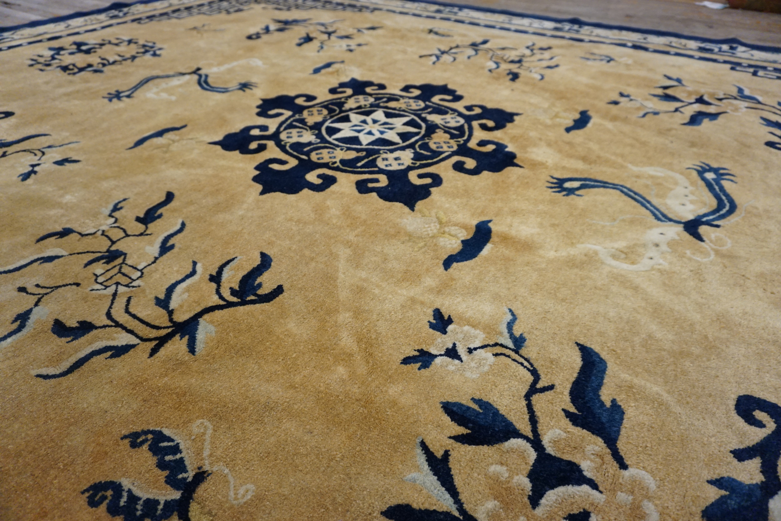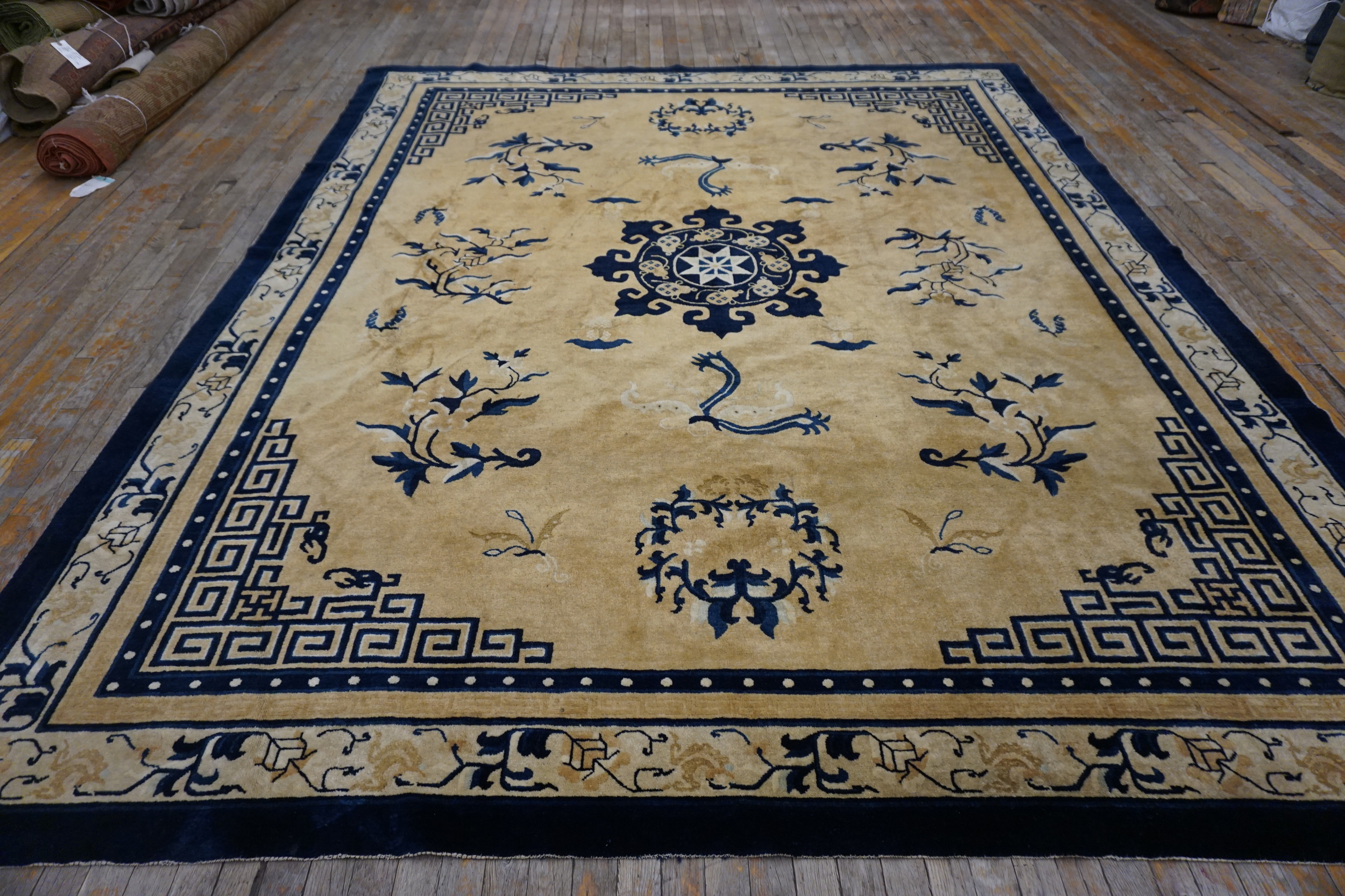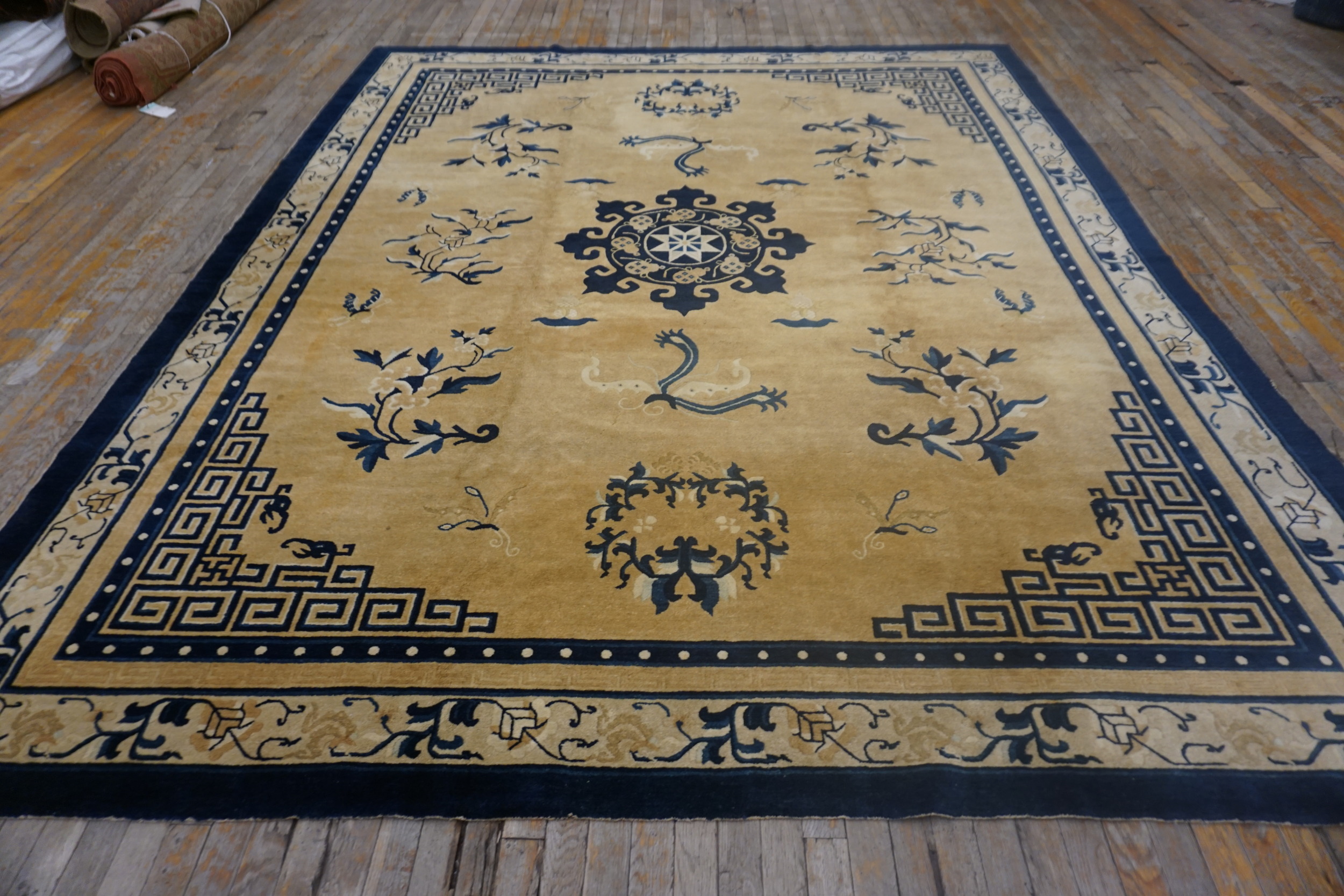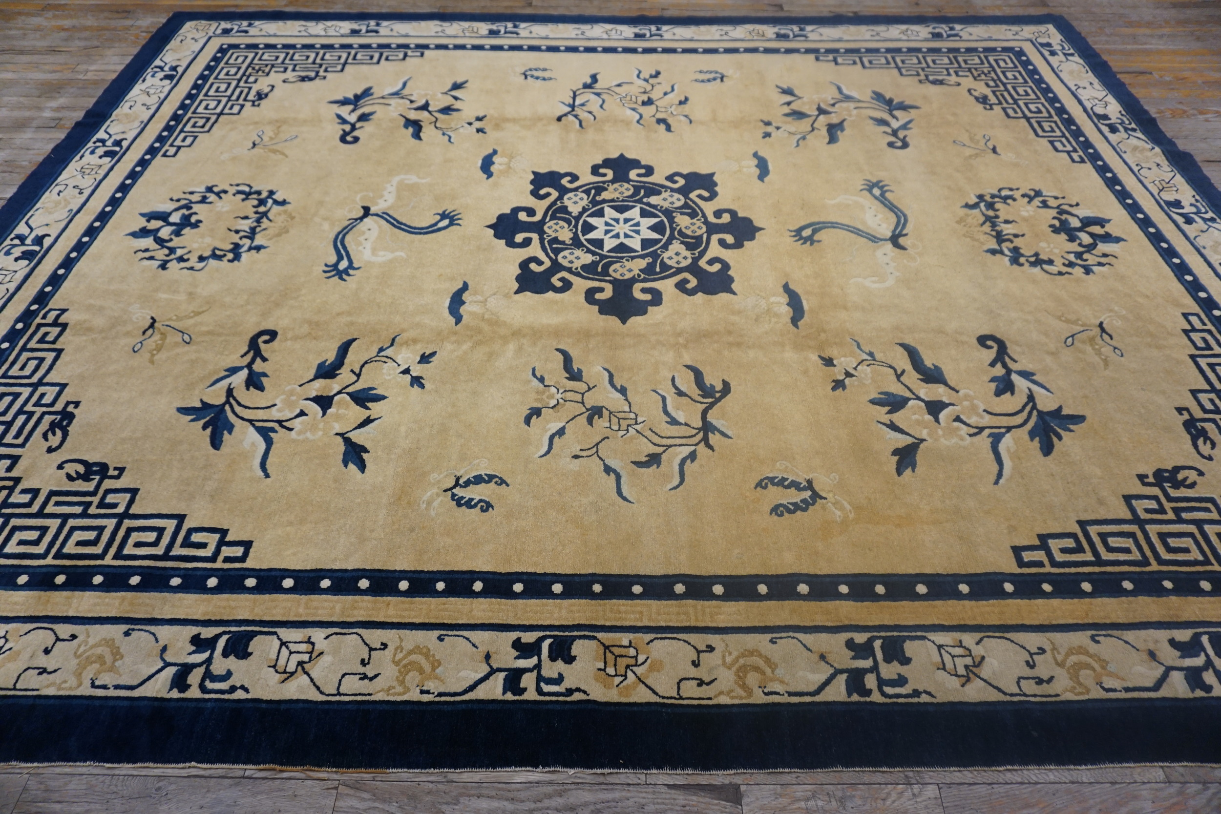 1880s Room Size Chinese Ivory Knotted Rectangle – Peking Wool Antique Rug, Circa Date: 1880s. This exceptional Chinese Peking rug, woven during the late Qing Dynasty, presents a commanding presence suitable for grand interiors. Its generous dimensions classify it among the finest room size rugs of the period, offering expansive coverage and visual impact.