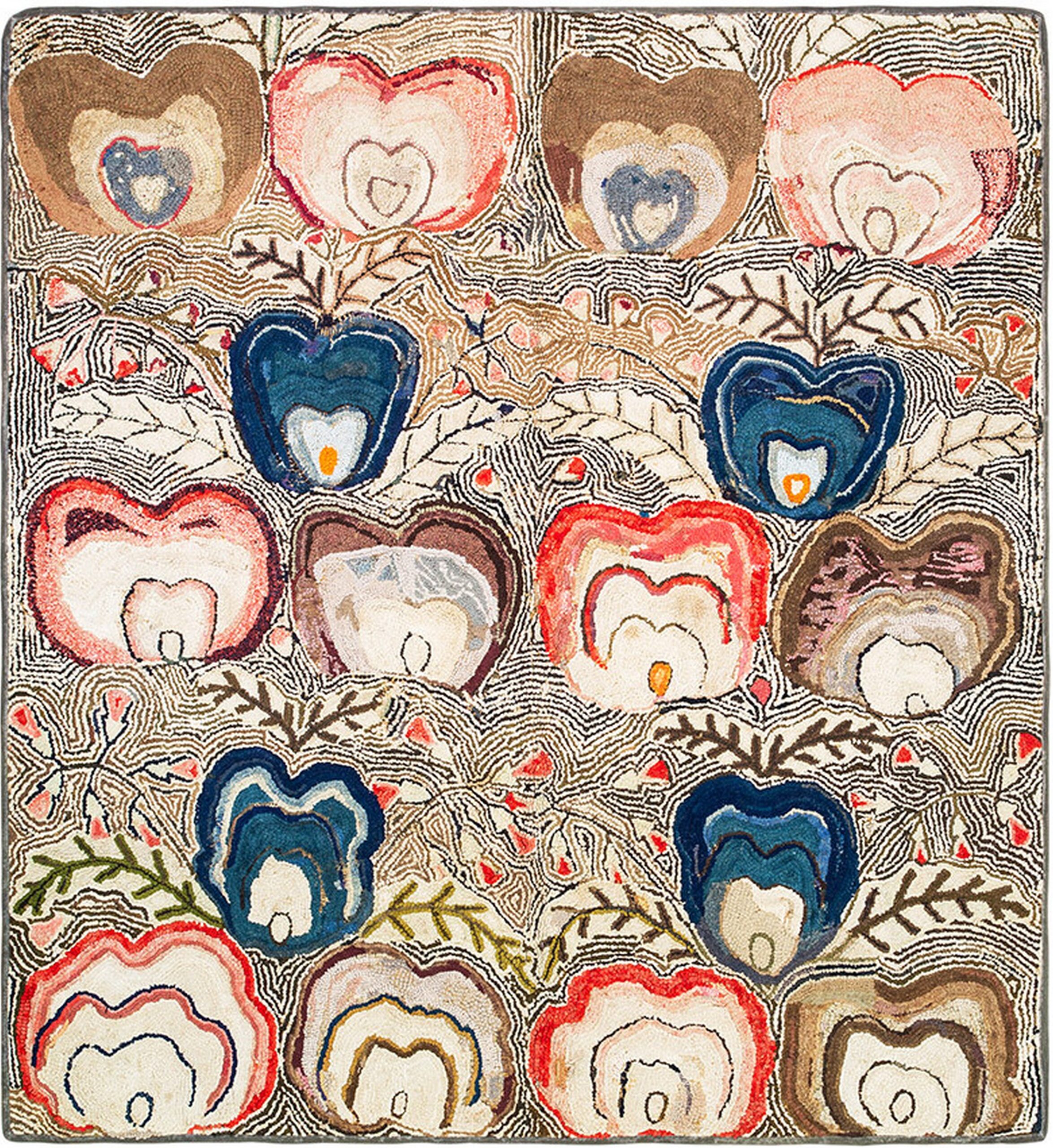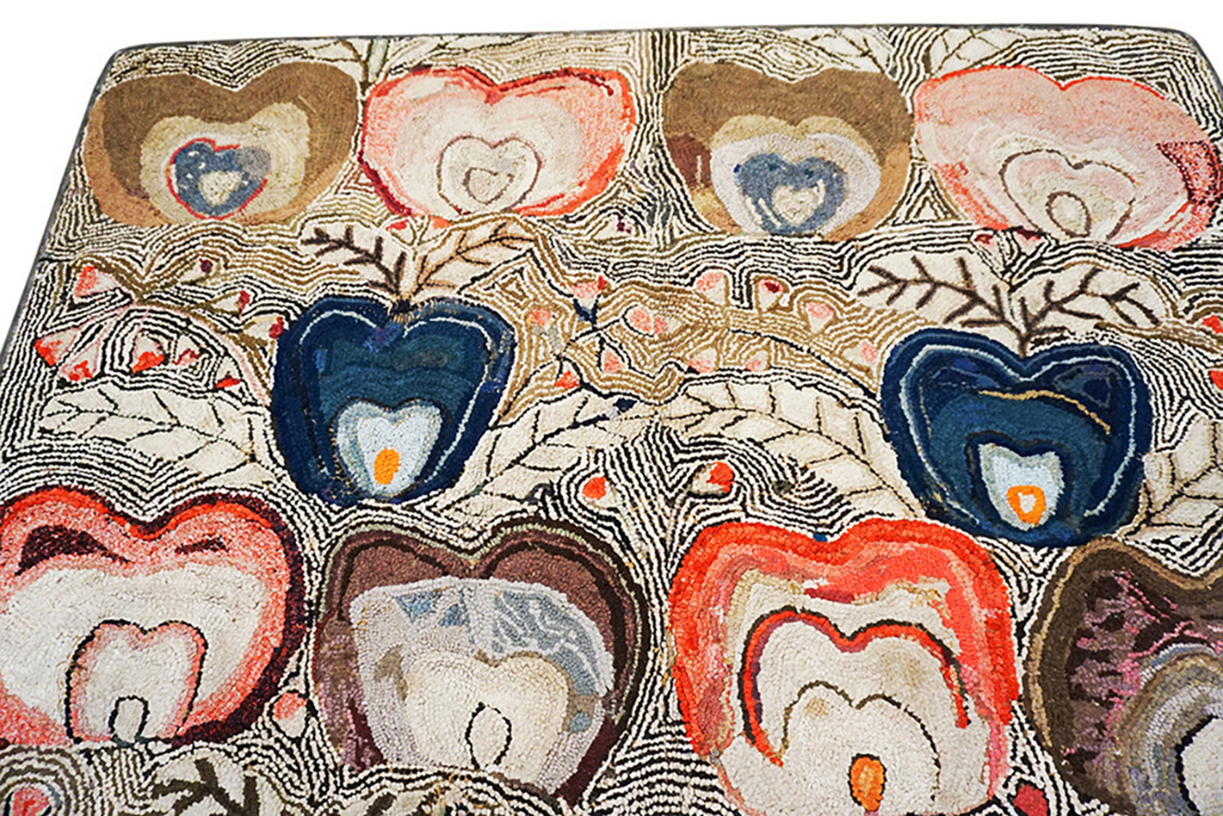 The background is intricately filled with fine, swirling lines that create a dynamic, almost topographical texture, emphasizing the three-dimensional quality of the central forms. This naive, yet sophisticated, artistry displayed in the repeating heart-like motifs elevates this piece among rare antique rugs and textiles of the era, reflecting the maker’s unique vision.