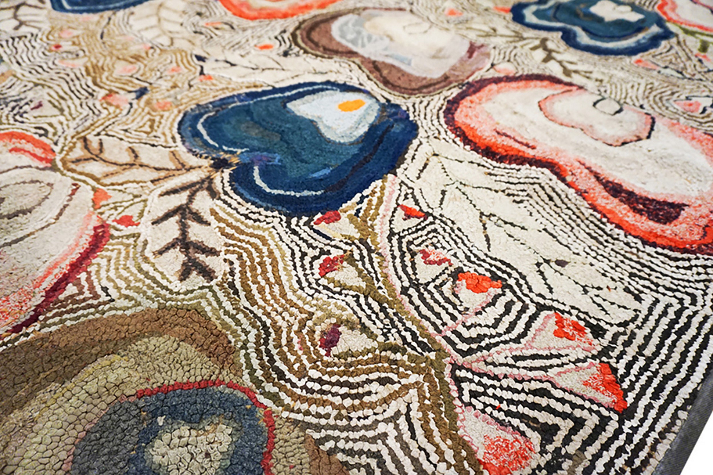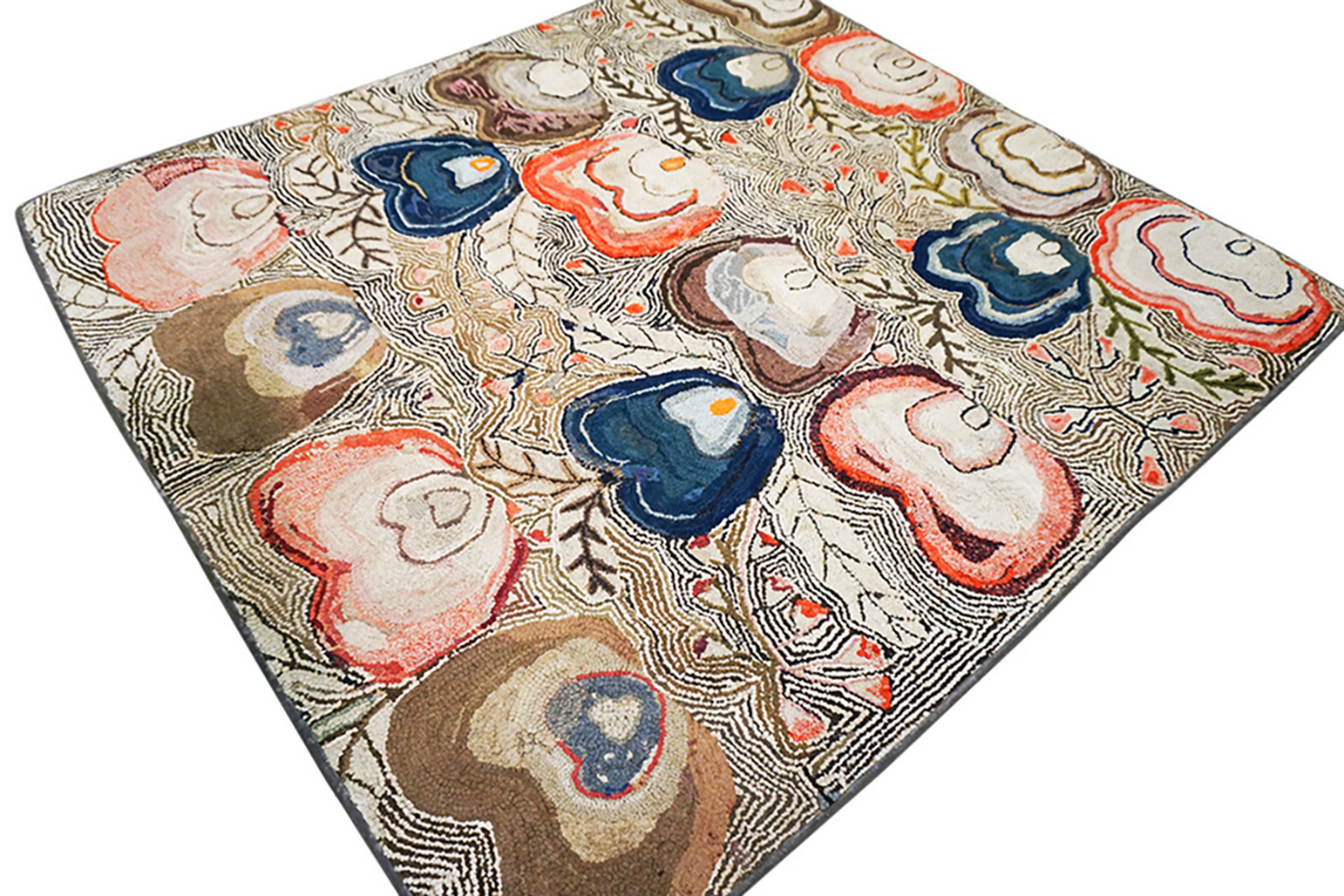The design features an all-over repeating pattern of stylized floral or heart-like motifs, rendered with a distinct contouring technique. The palette is rich and saturated, utilizing deep blues, rust reds, and earthy browns, characteristic of multicolor jewel tone rugs from the period, set against a creamy, tightly hooked ground.
