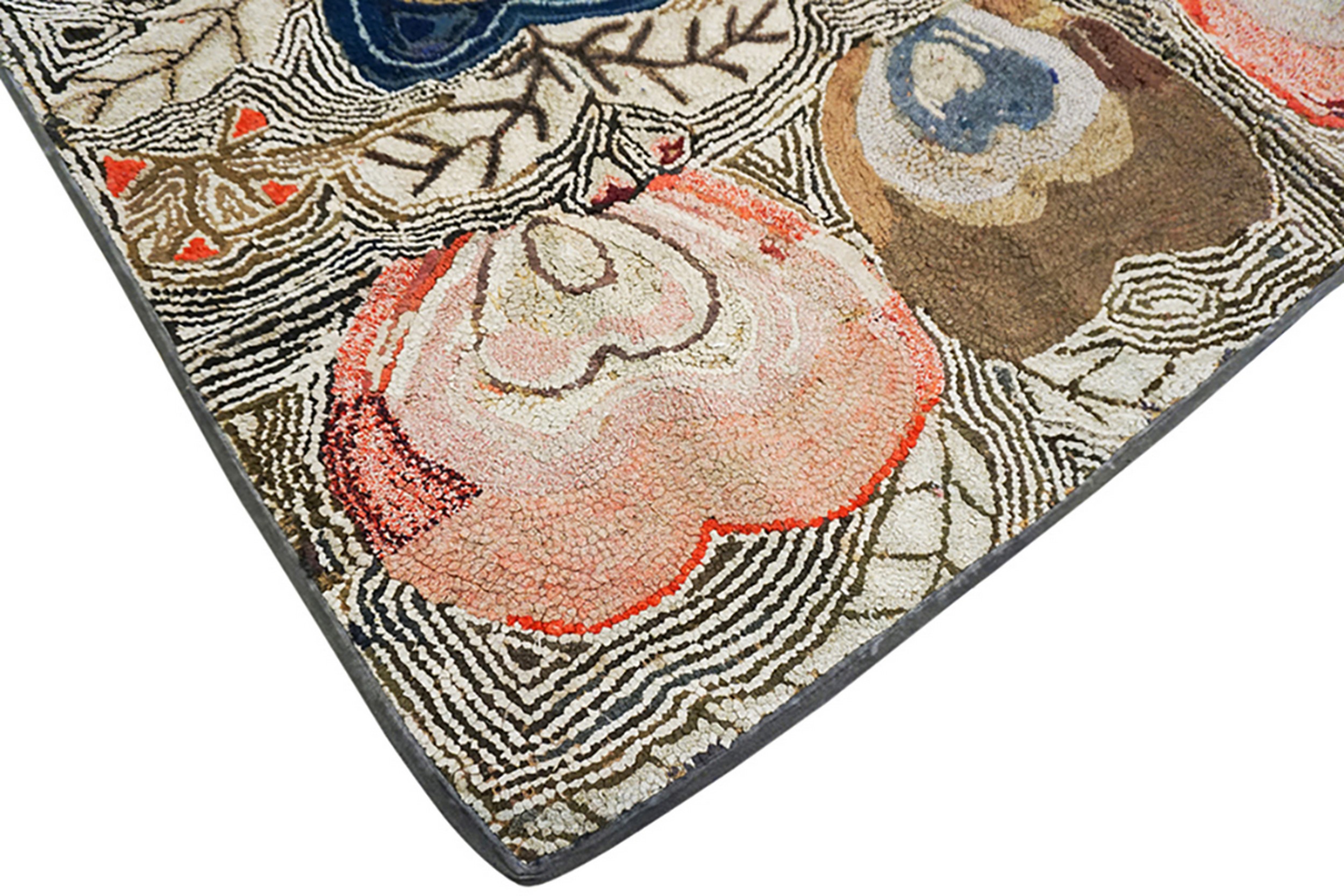 1880s Wool Antique American Hooked Multicolor Jewel Tones Rug, Circa Date: 1880s. This charming piece, crafted entirely of wool, represents the quintessential folk art tradition of the American Hooked Rug. Originating from the domestic craft movement of the late 19th century, it showcases a highly personal and expressive aesthetic that captures the spirit of the era.