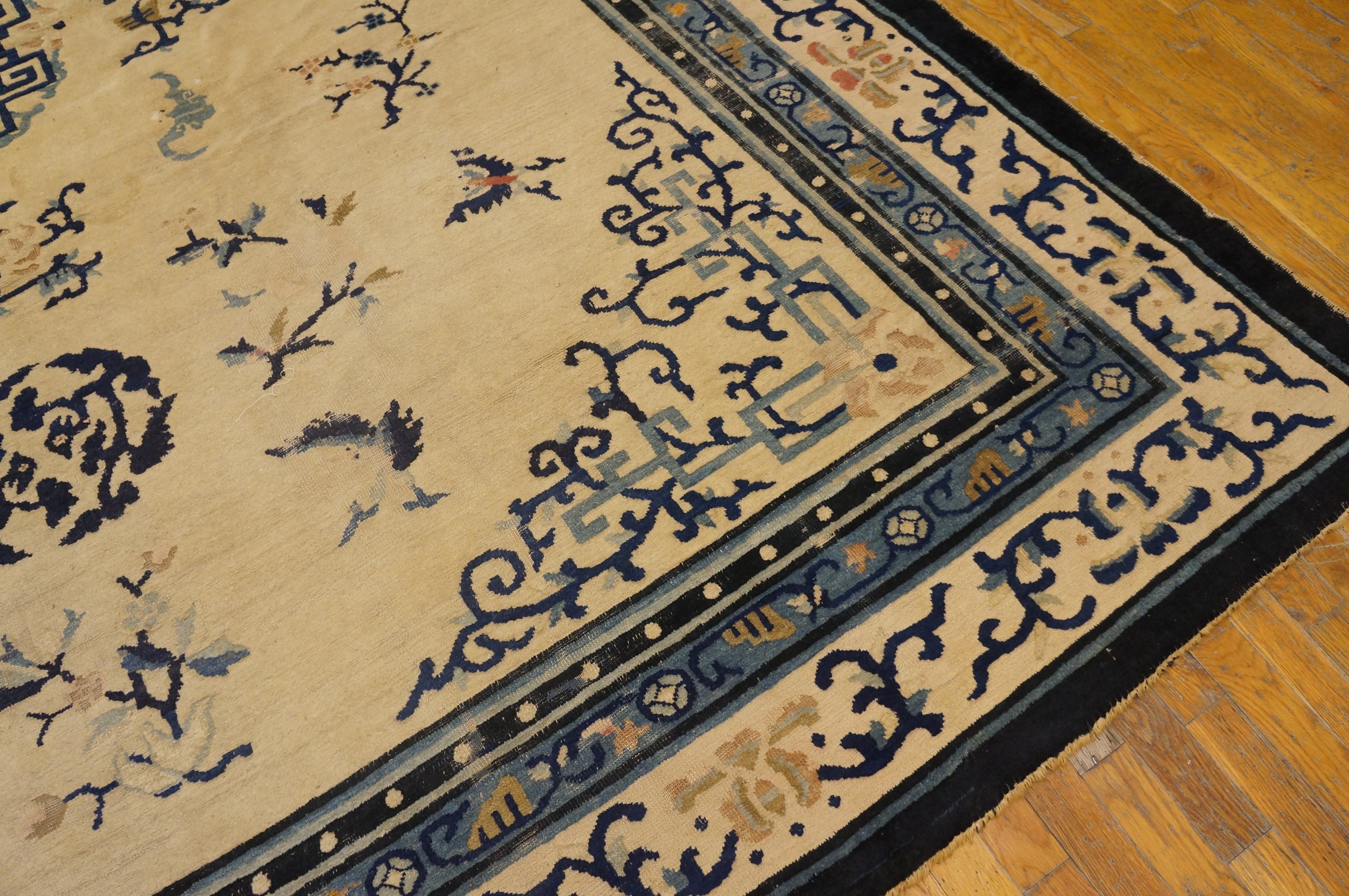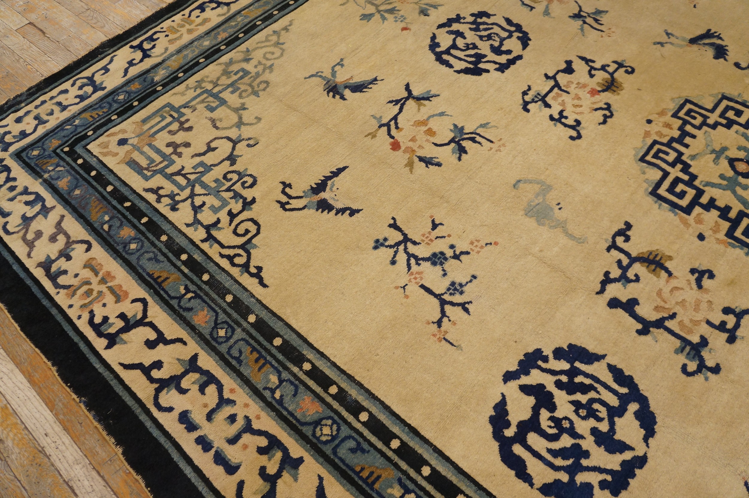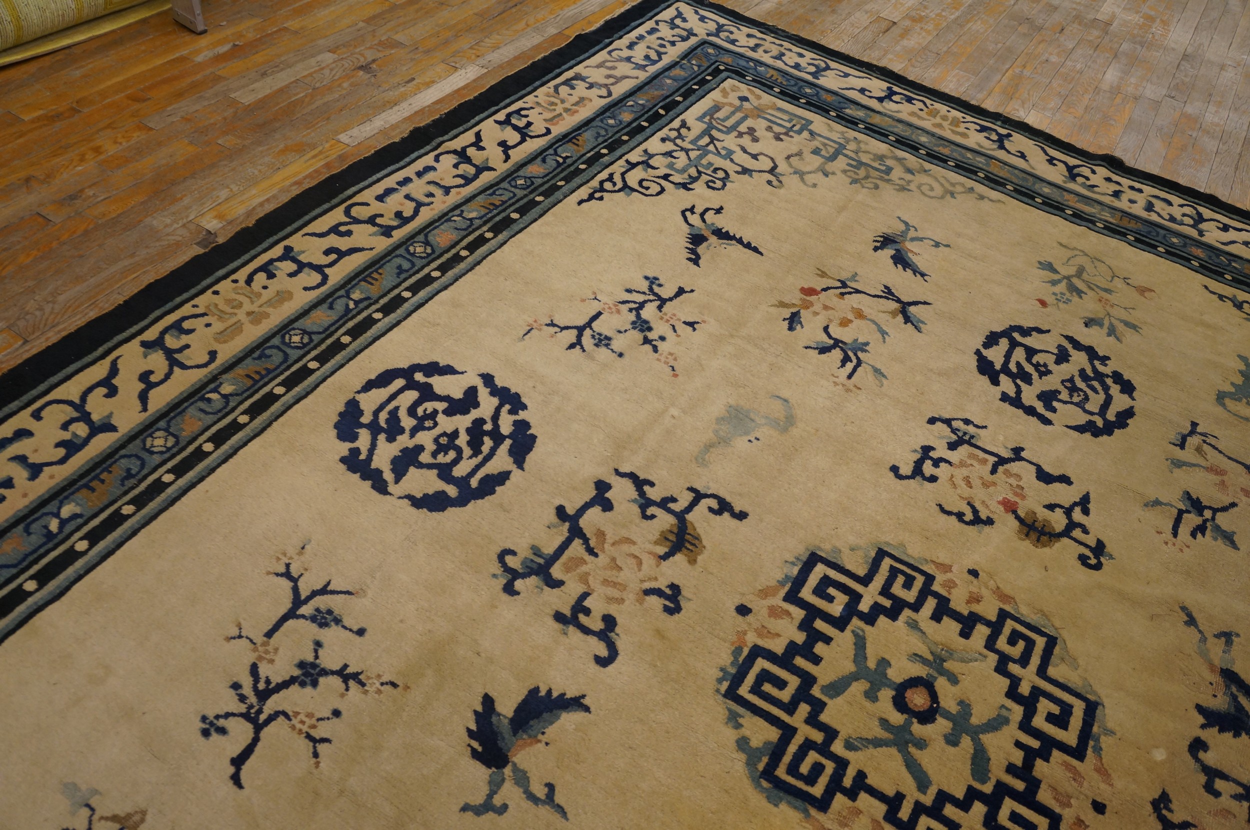 Measuring generously, this piece falls squarely into the category of room size rugs (8.1ft x 11.02ft), making it ideal for defining a primary living space or grand dining area. Its balanced colorway—combining timeless neutrals with classic Chinese blues—ensures that this magnificent textile remains a relevant and highly sought-after decorative element for collectors and designers today.