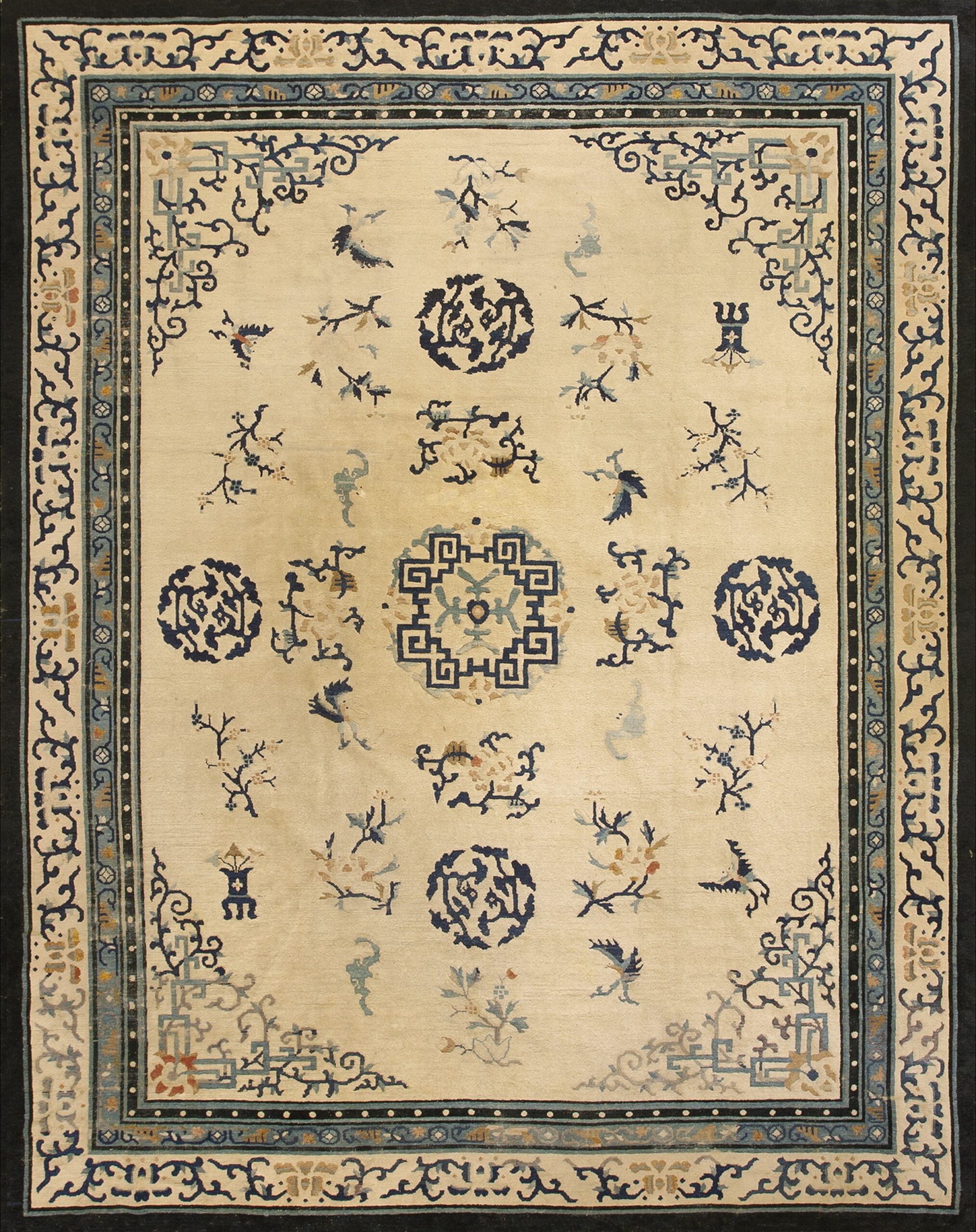 The composition is defined by its elegant negative space, allowing individual motifs to float freely across the surface. Central to the design is a complex geometric medallion, surrounded by scattered, finely rendered sprigs of blossoms, stylized birds, and circular medallions executed primarily in deep navy and subtle celadon blue. Such delicate, symbolic imagery is characteristic of the finest antique rugs produced during the Qing Dynasty’s waning years.