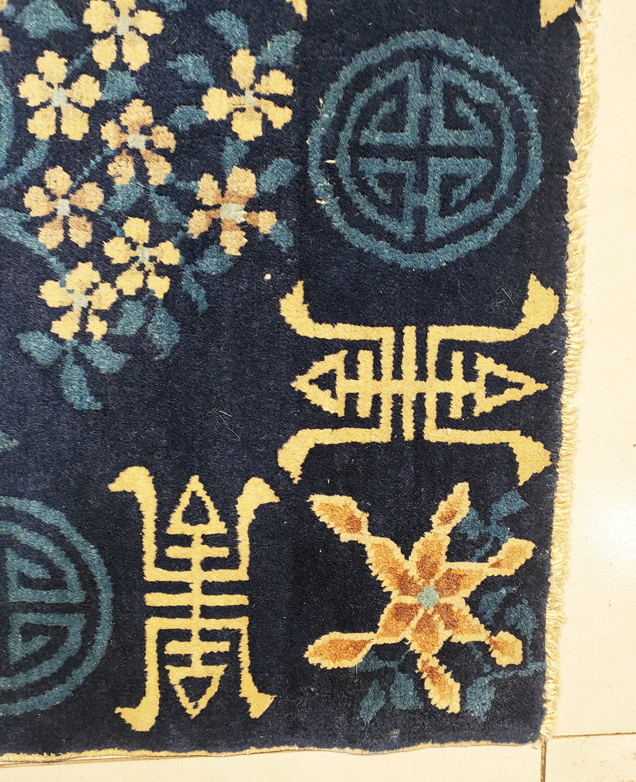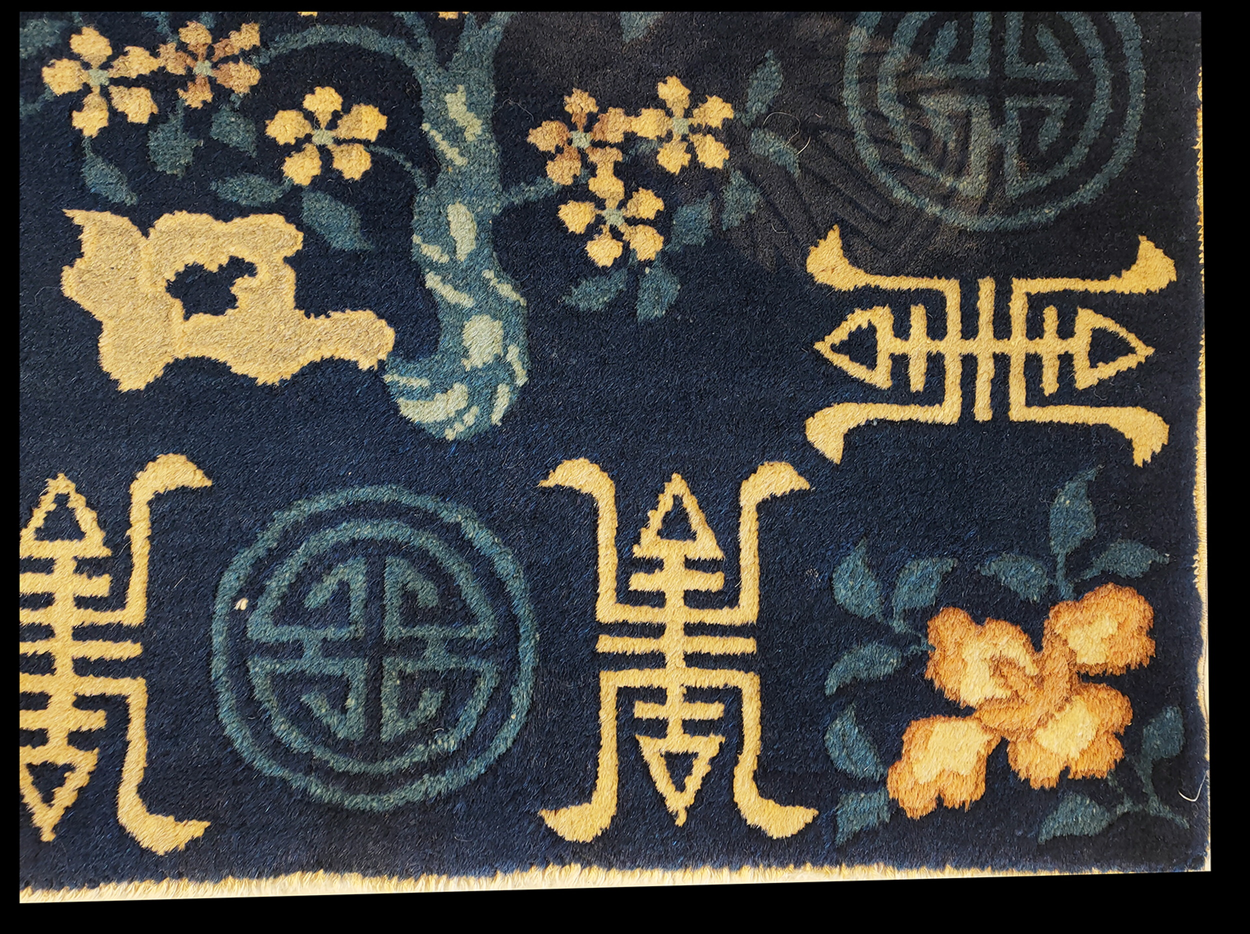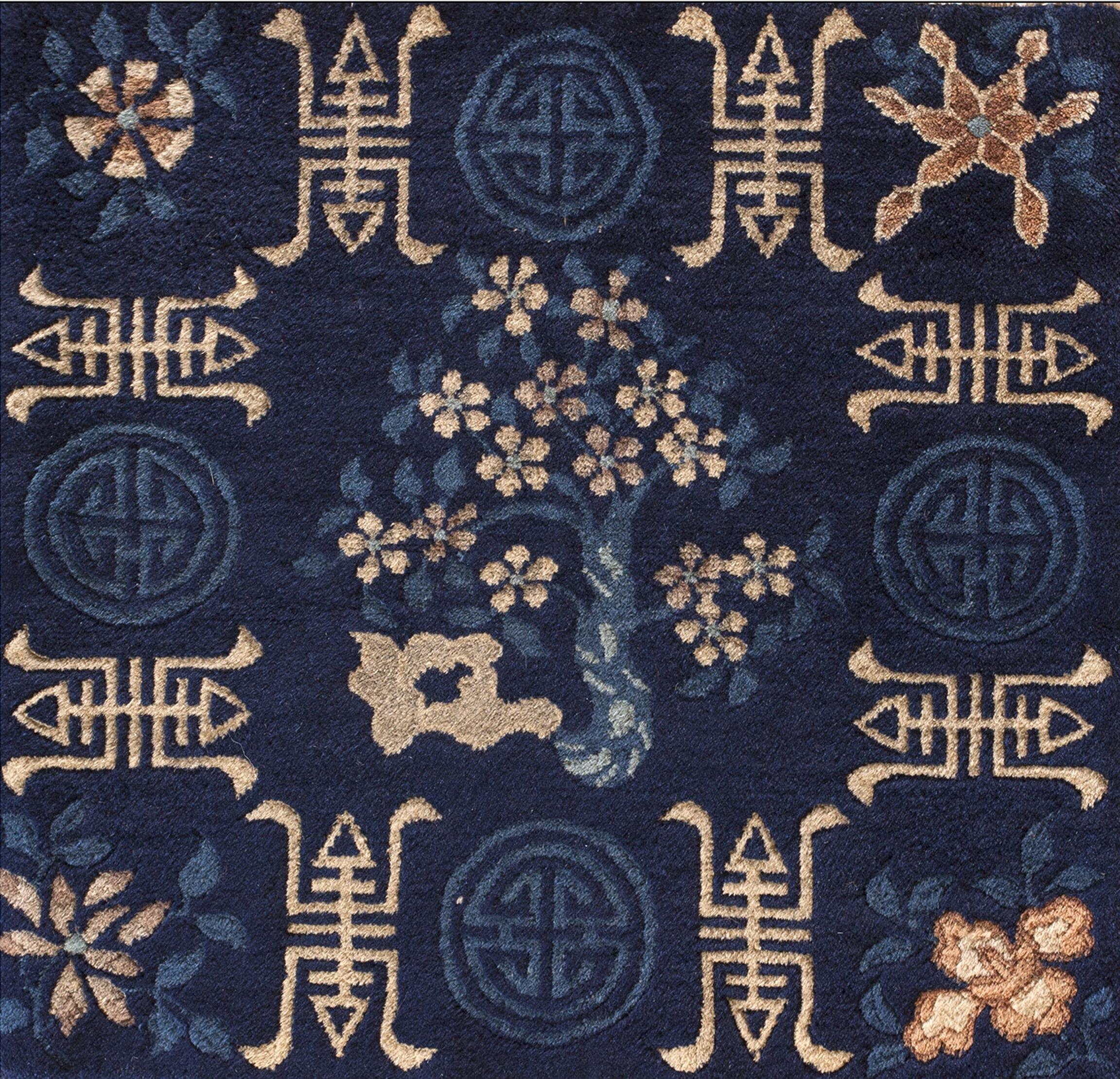 At the heart of the design is a beautifully rendered flowering tree, a classic motif signifying renewal and longevity in Chinese culture. This central element is framed by repeating geometric symbols and stylized blossoms, creating a balanced and auspicious layout typical of floral rugs from the region.