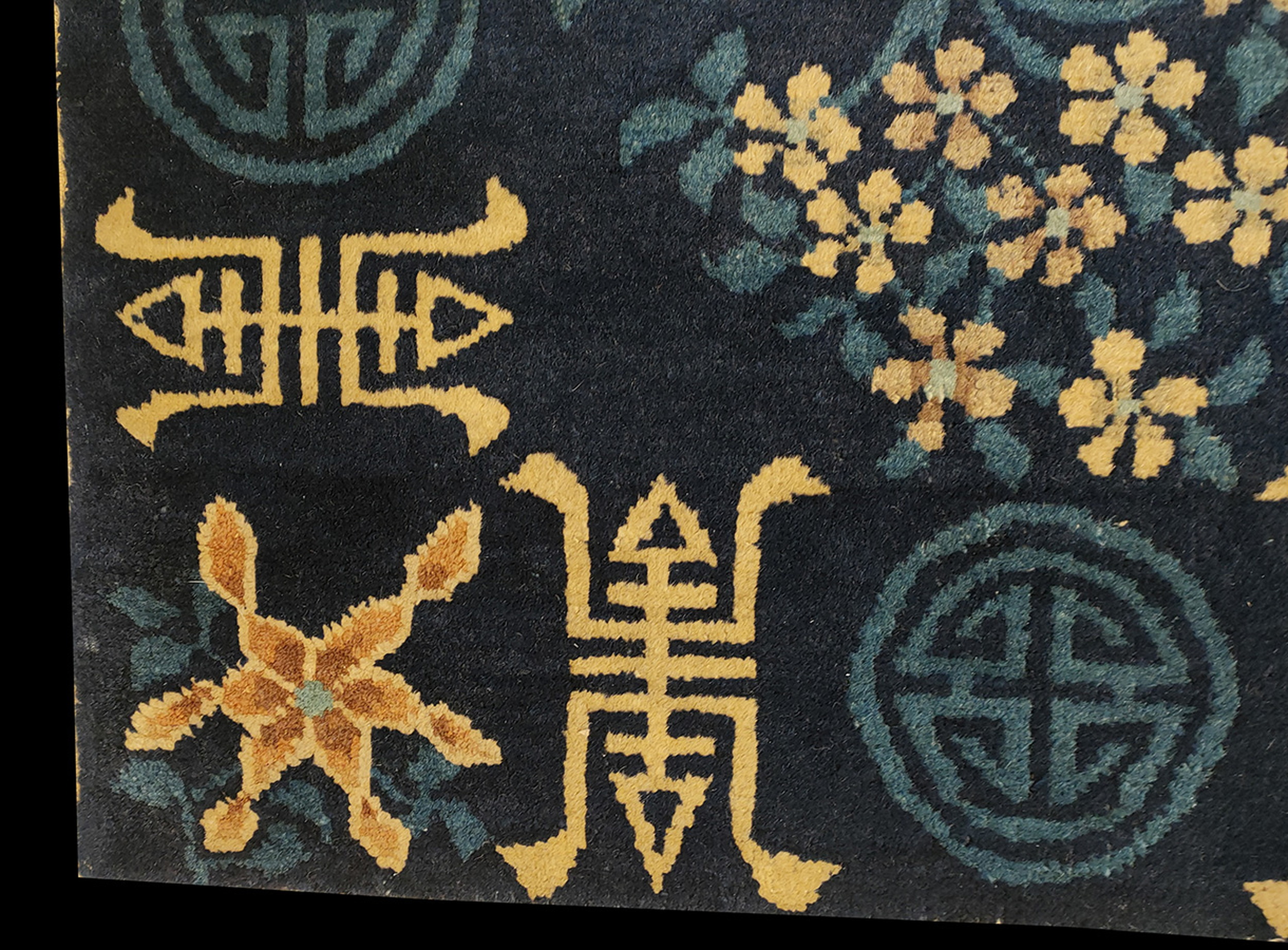 1900s Antique Rectangle Chinese Knotted – Peking Wool Blue Small Scatter Size Rug, Circa Date: 1900s. This exceptional example of early 20th-century Chinese weaving belongs to the esteemed category of antique rugs. Hand-knotted with luxurious Peking wool, it showcases the refined artistry characteristic of pieces produced during the late Qing Dynasty transition.