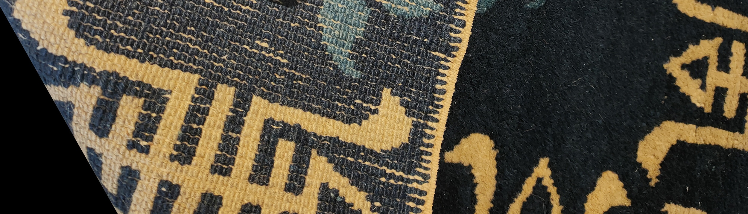 The rug’s field is dominated by a rich, saturated indigo, establishing a striking contrast against the soft tan and pale blue motifs. This sophisticated use of a deep blue color rugs provides a grounding foundation for the intricate symbolic elements woven throughout the composition, highlighting the depth and quality of the natural dyes.