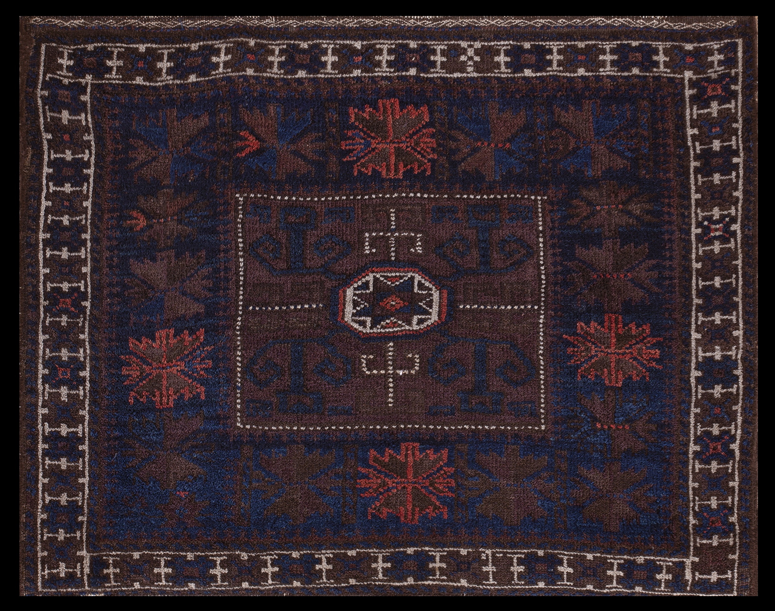 The precise, repeating border features small, stylized crosses or ‘T’ shapes rendered in contrasting white and pale gray, providing a sharp visual break against the dark field. Given its manageable dimensions (2ft x 2.08ft), this piece functions beautifully as a captivating accent in an entryway or beside a hearth, making it an ideal choice among small scatter size rugs.