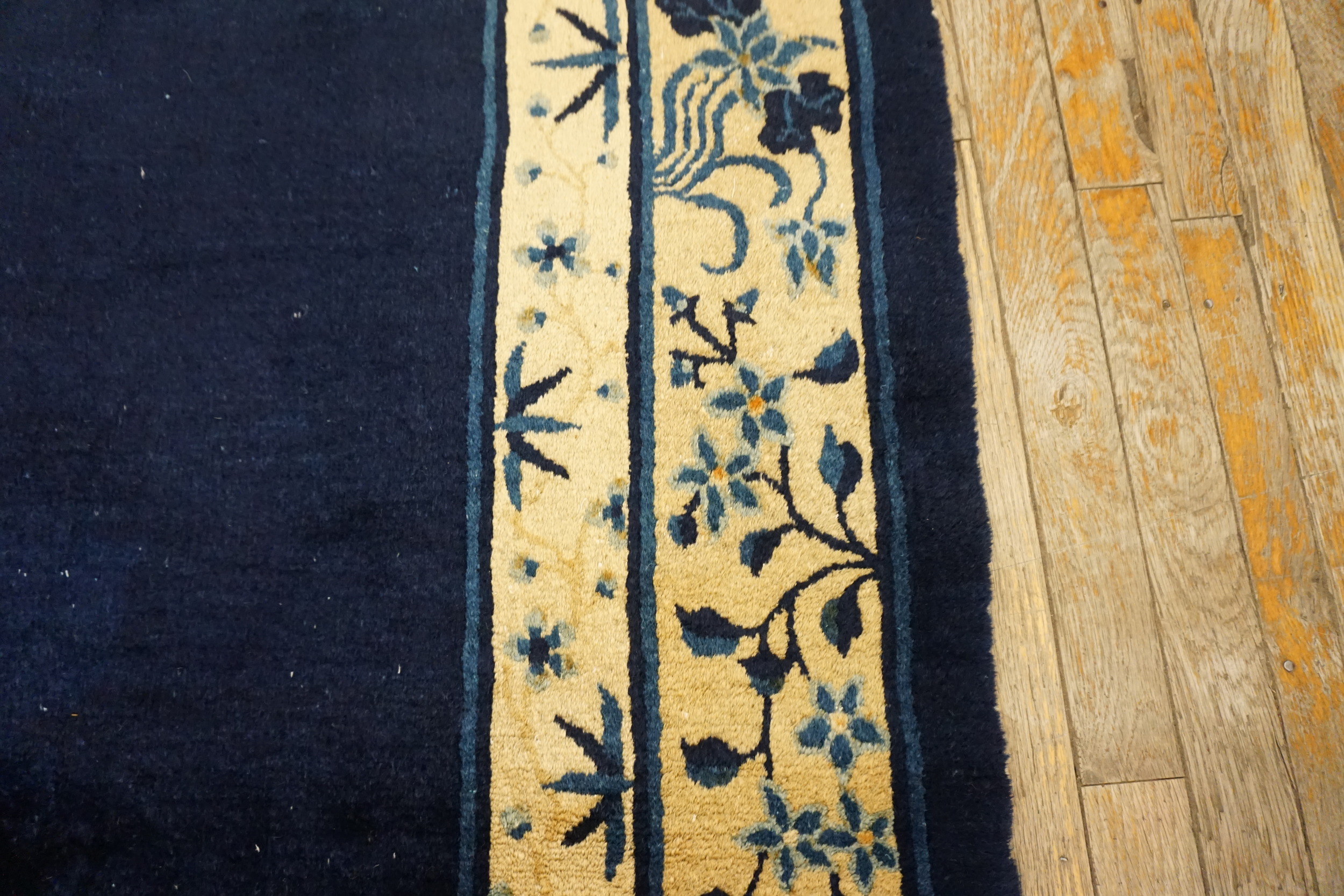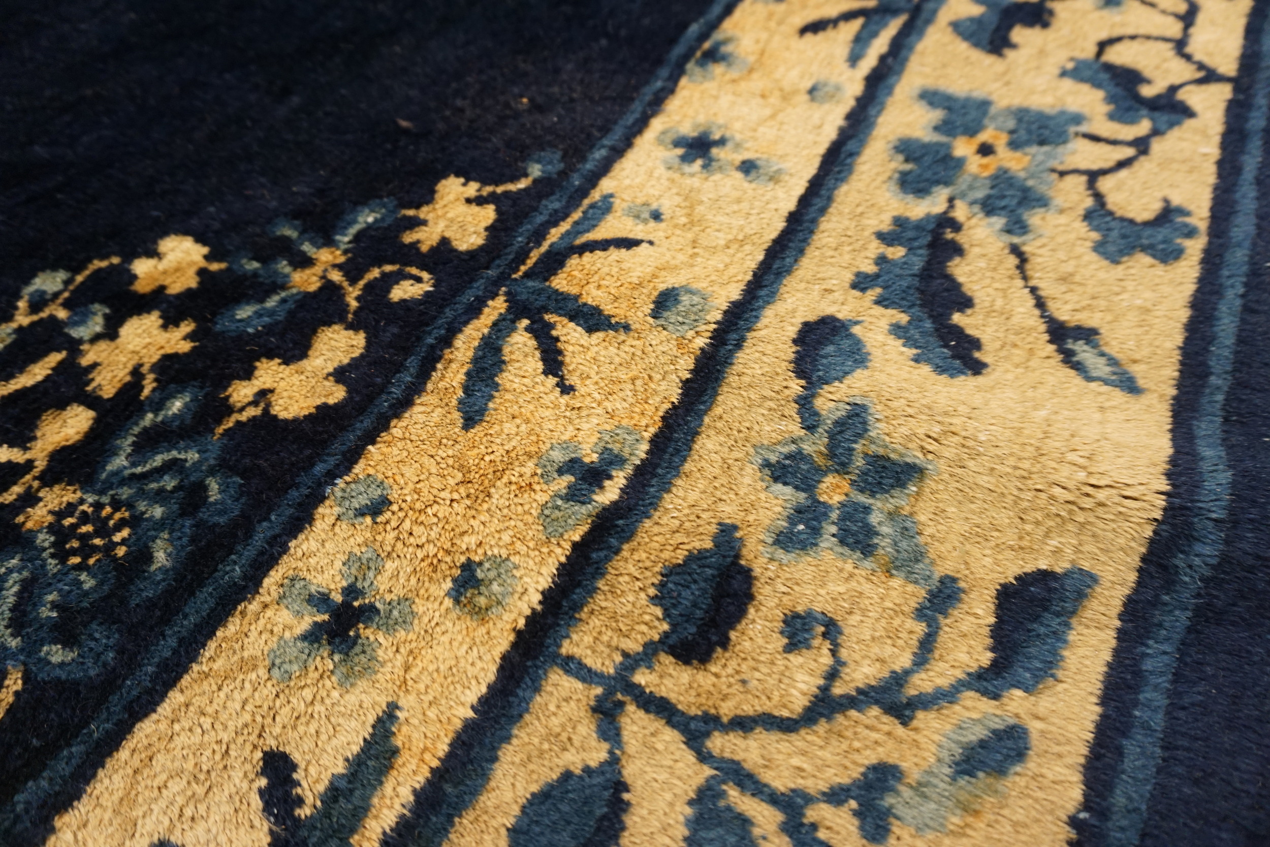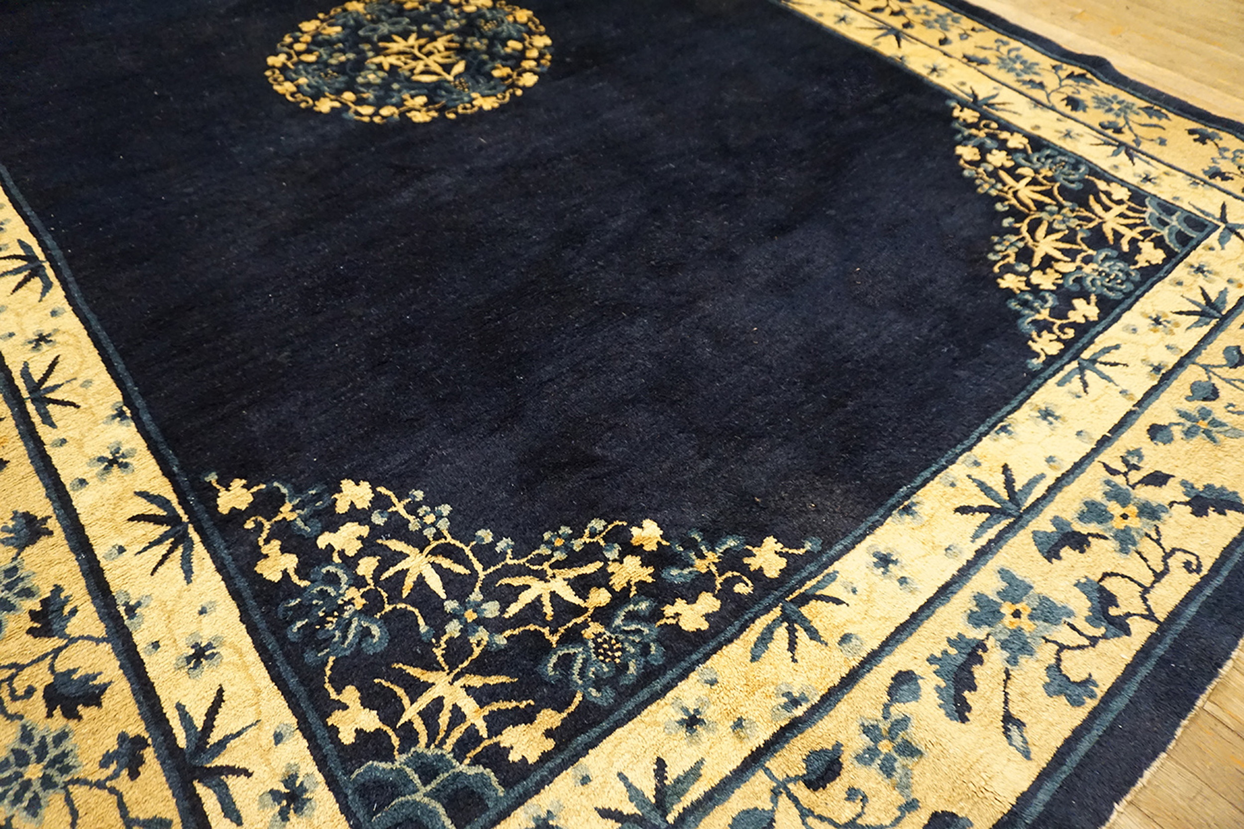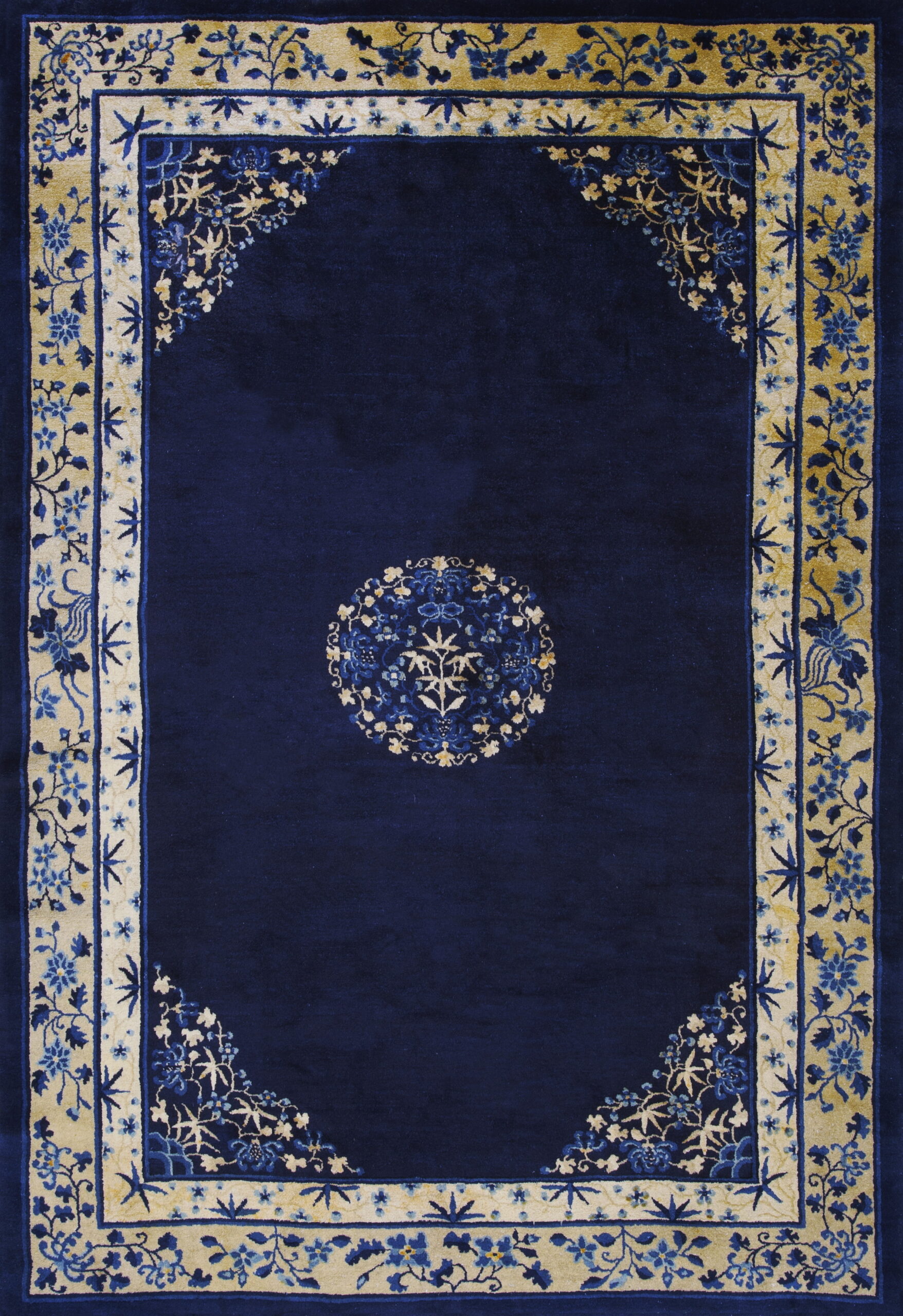 Room Size Rugs (6ft x 8.09ft), Circa Date: 1900s. This exceptional example of early 20th-century Chinese weaving presents a refined aesthetic typical of the Peking tradition. The field is saturated in a magnificent, almost indigo shade, classifying it among the finest blue color rugs of the era.
