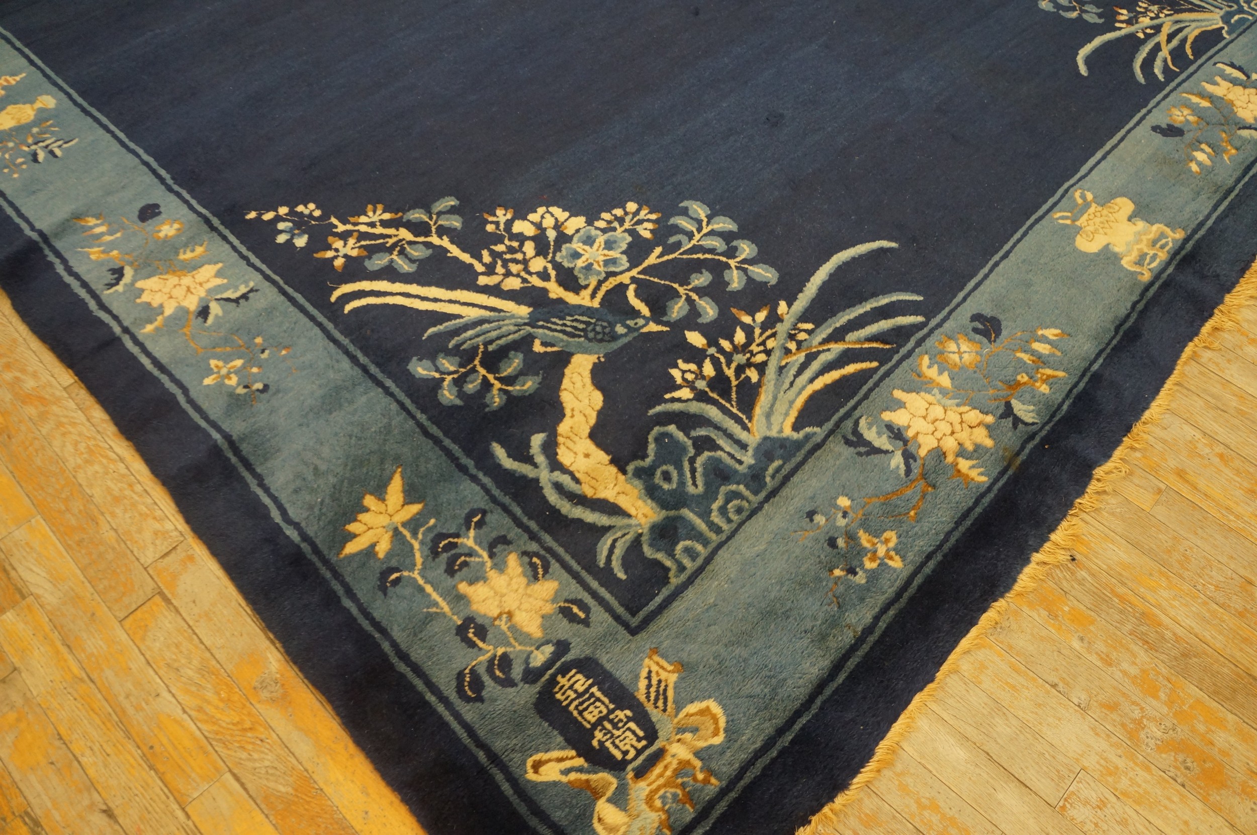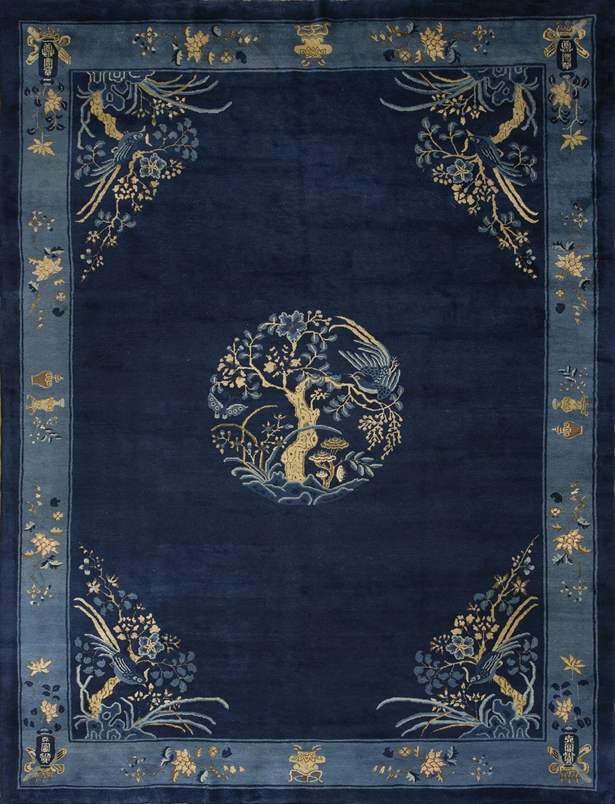 Auspicious symbolism abounds in the corner spandrels, where large, sweeping branches laden with blossoms and perched birds extend inward, echoing the traditional Chinese reverence for nature. The craftsmanship evident in the fine knotting and subtle shading confirms its status as a highly collectible antique rug, appealing to connoisseurs of early 20th-century textile art.