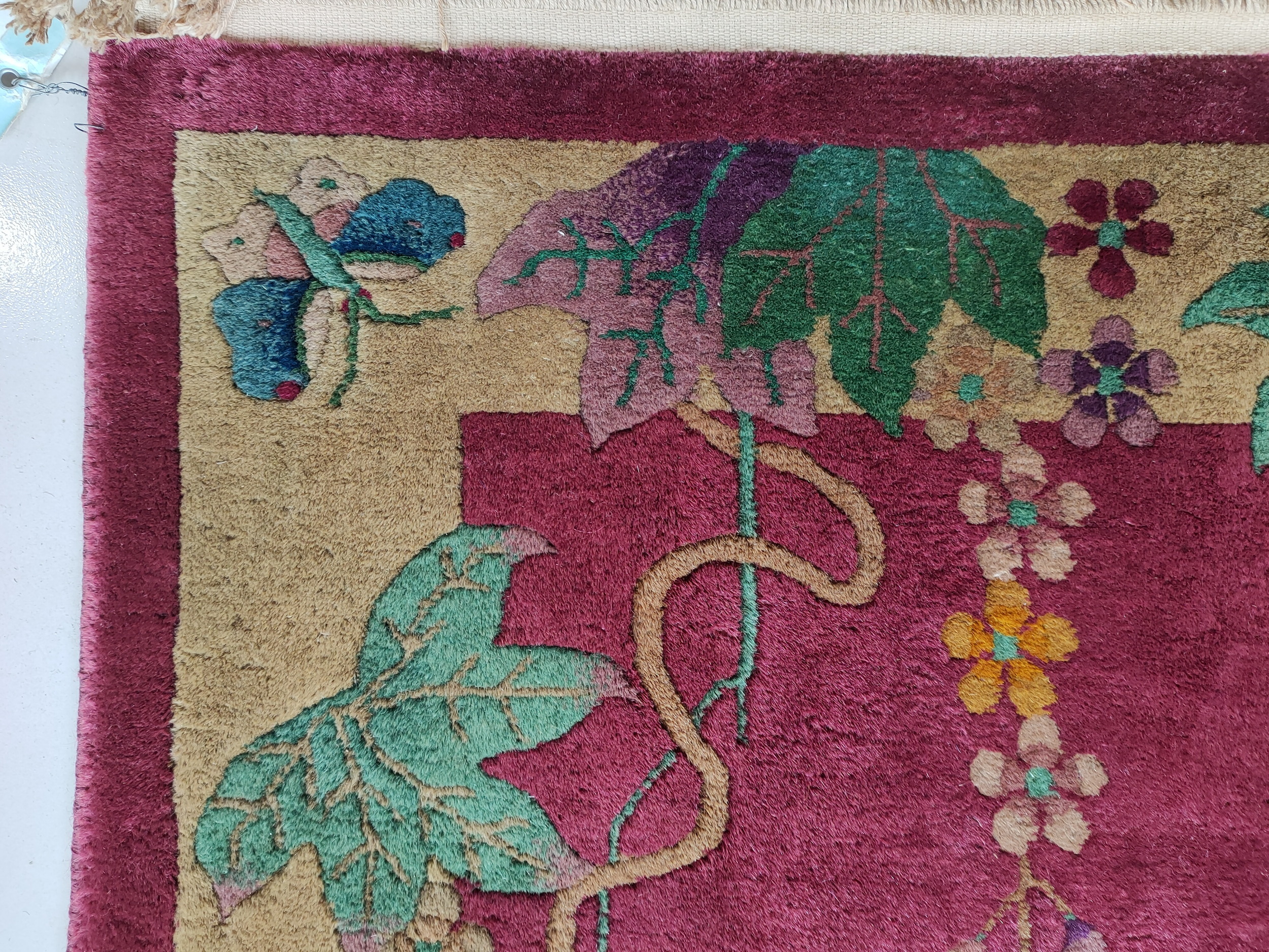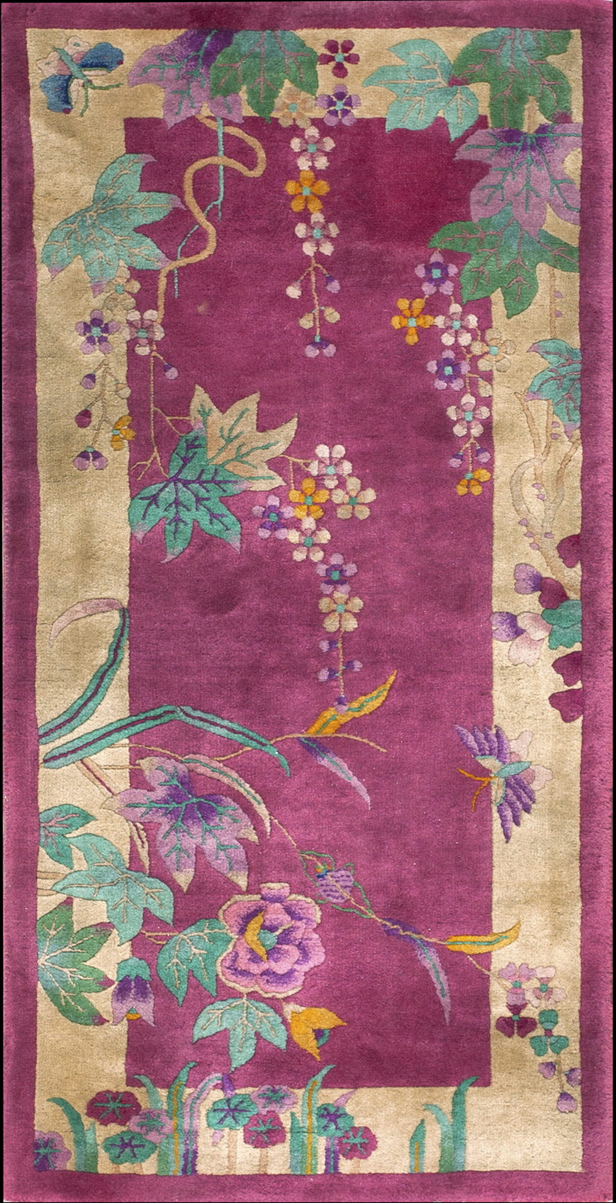 The ornamentation is distinctly Art Deco, featuring elegant, cascading vines and large, simplified leaves and blossoms. Unlike earlier, dense compositions, the open field allows the stylized floral rugs pattern to breathe, emphasizing the clean lines and graphic impact of the design, a hallmark of the 1920s aesthetic shift.