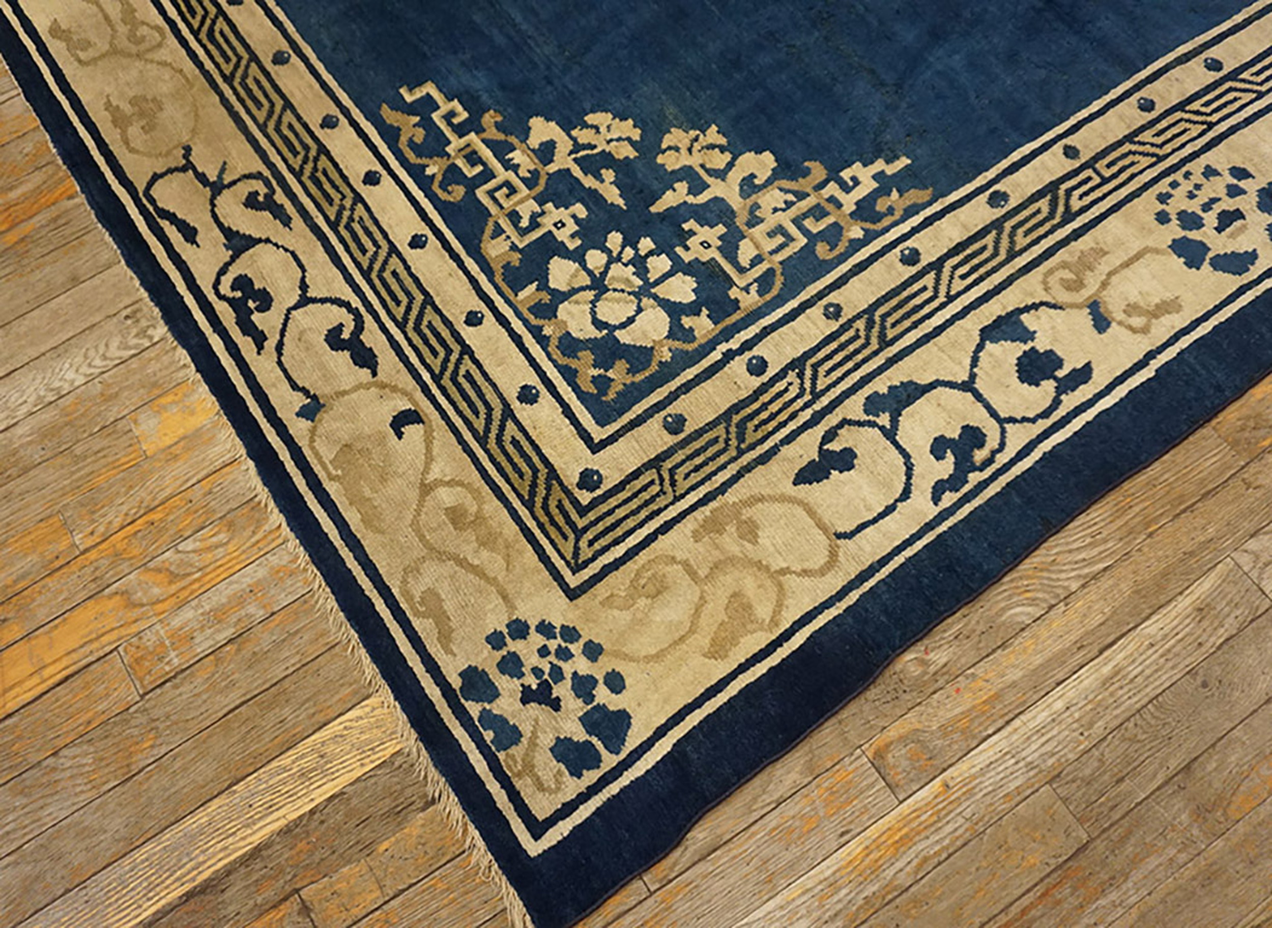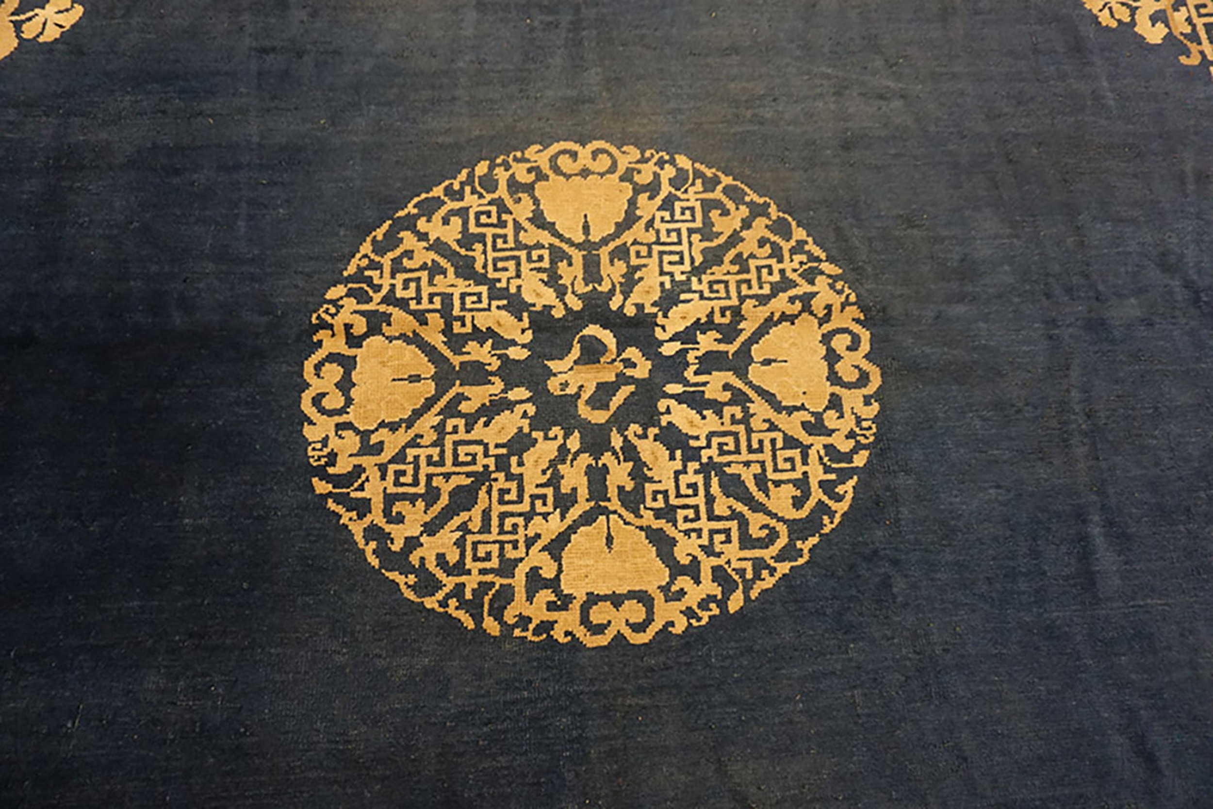 The commanding field is rendered in a deep, saturated indigo, characteristic of the finest blue color rugs from this era. This rich hue provides a striking contrast to the secondary tones of soft beige and taupe, which define the intricate central medallion and the detailed corner spandrels.