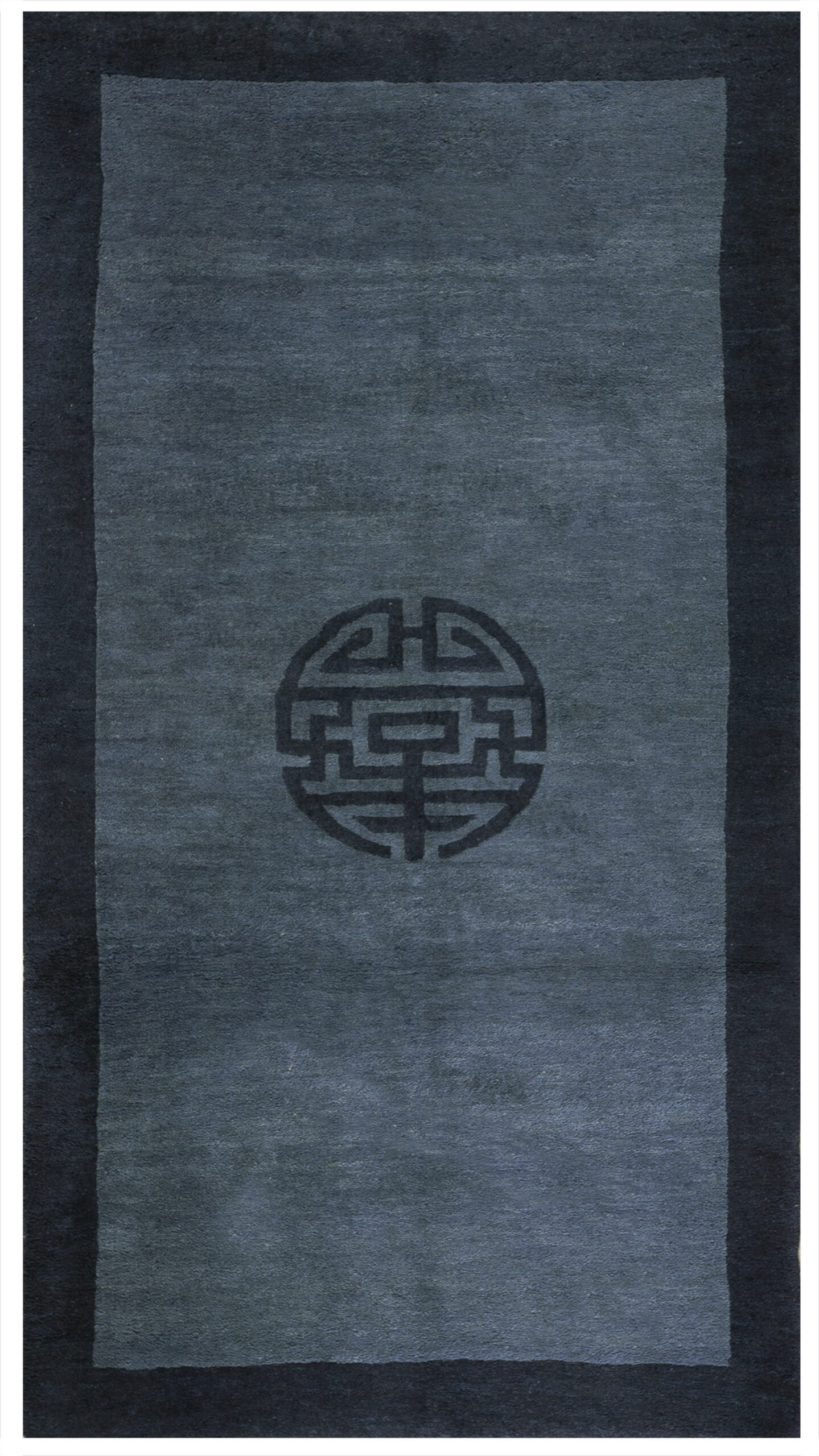 Central to the composition is a singular, powerful medallion—a stylized rendition of the traditional Chinese Shou symbol for longevity. While deeply rooted in cultural symbolism, the execution of this motif is strikingly modern, utilizing clean lines and abstracted forms that lean toward geometric rugs rather than traditional floral complexity.