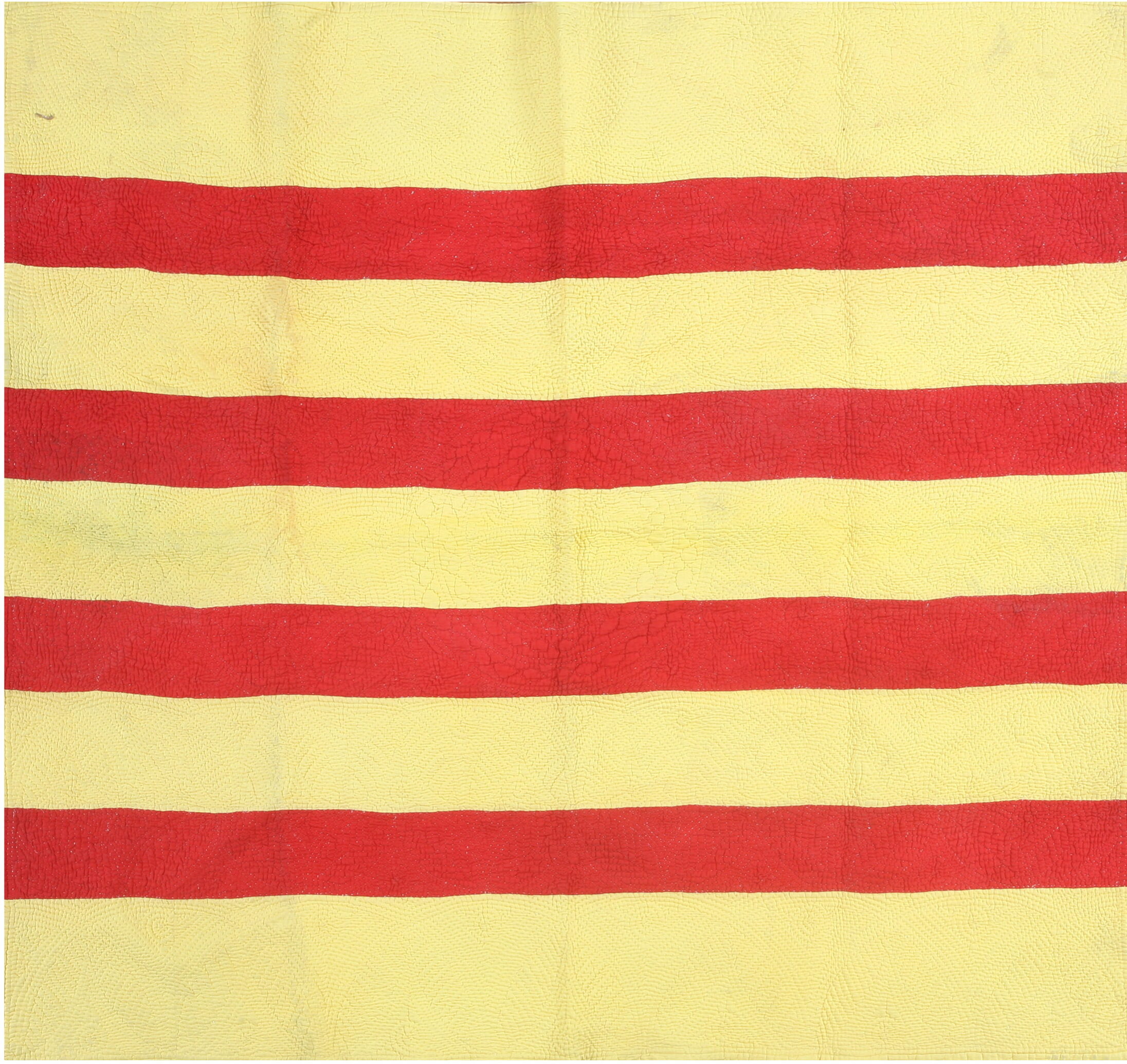 The visual impact of this piece is immediate, defined by broad, horizontal bands of saturated primary red alternating with a pale, creamy yellow ground. While the title mentions multicolor jewel tone rugs, the palette here is intentionally restrained, using high contrast to achieve a powerful, graphic statement that anticipates later mid-century design trends.
