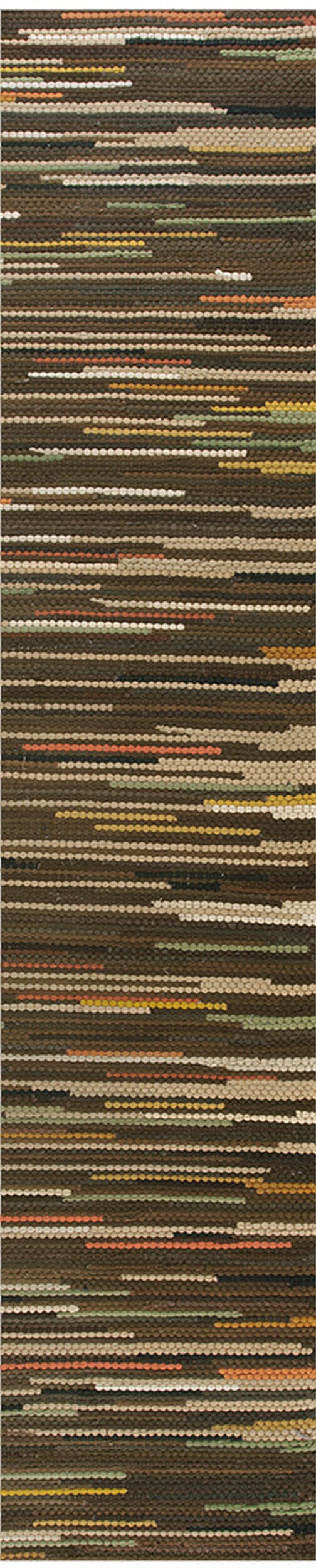 The palette is grounded in deep, rich browns and near-blacks, providing a sophisticated backdrop for the horizontal striations of color. Subtle infusions of cream, mustard yellow, and rust are interspersed with muted shades of green color rugs, lending the piece a natural, organic feel that complements contemporary and traditional interiors alike.