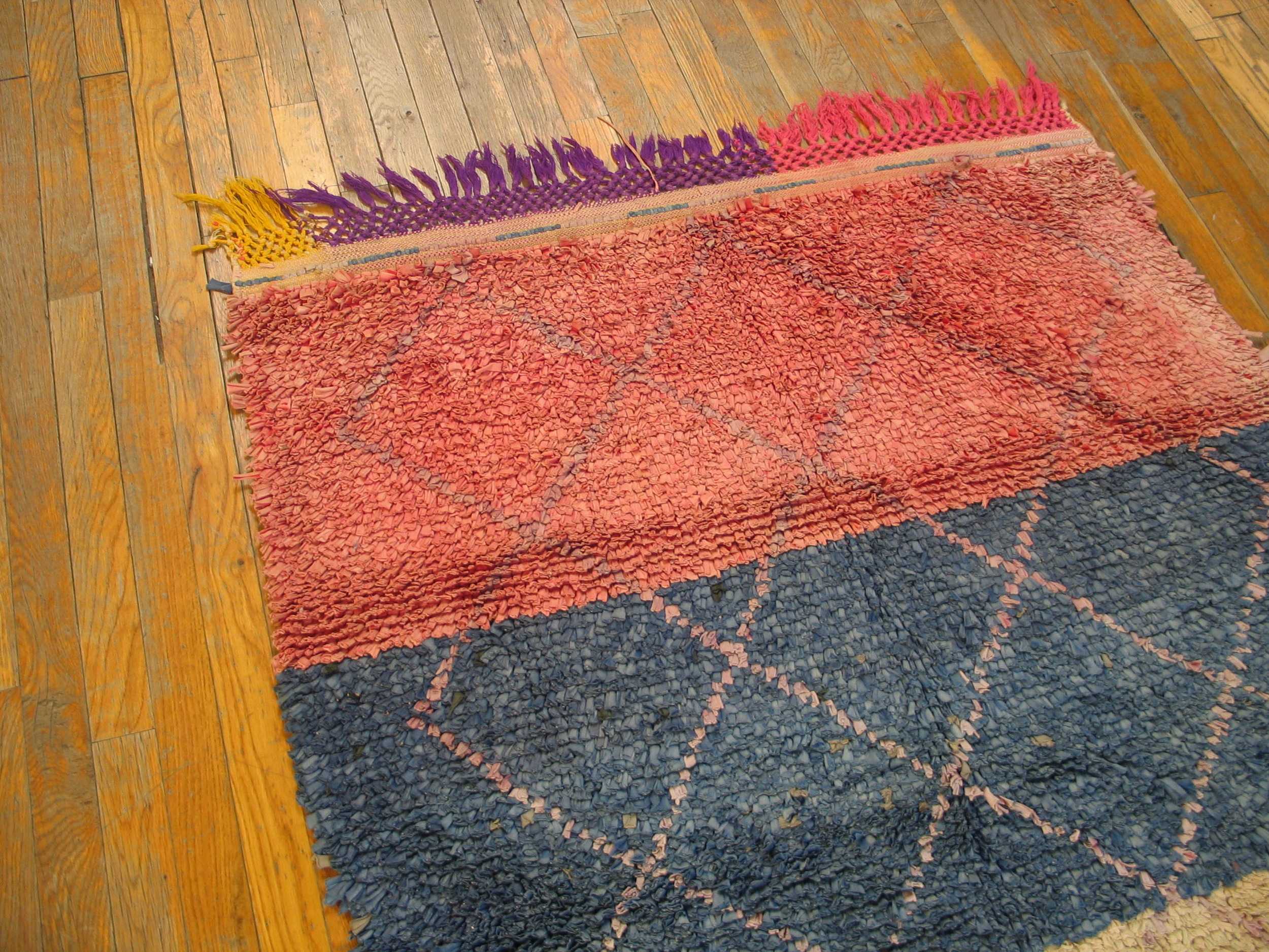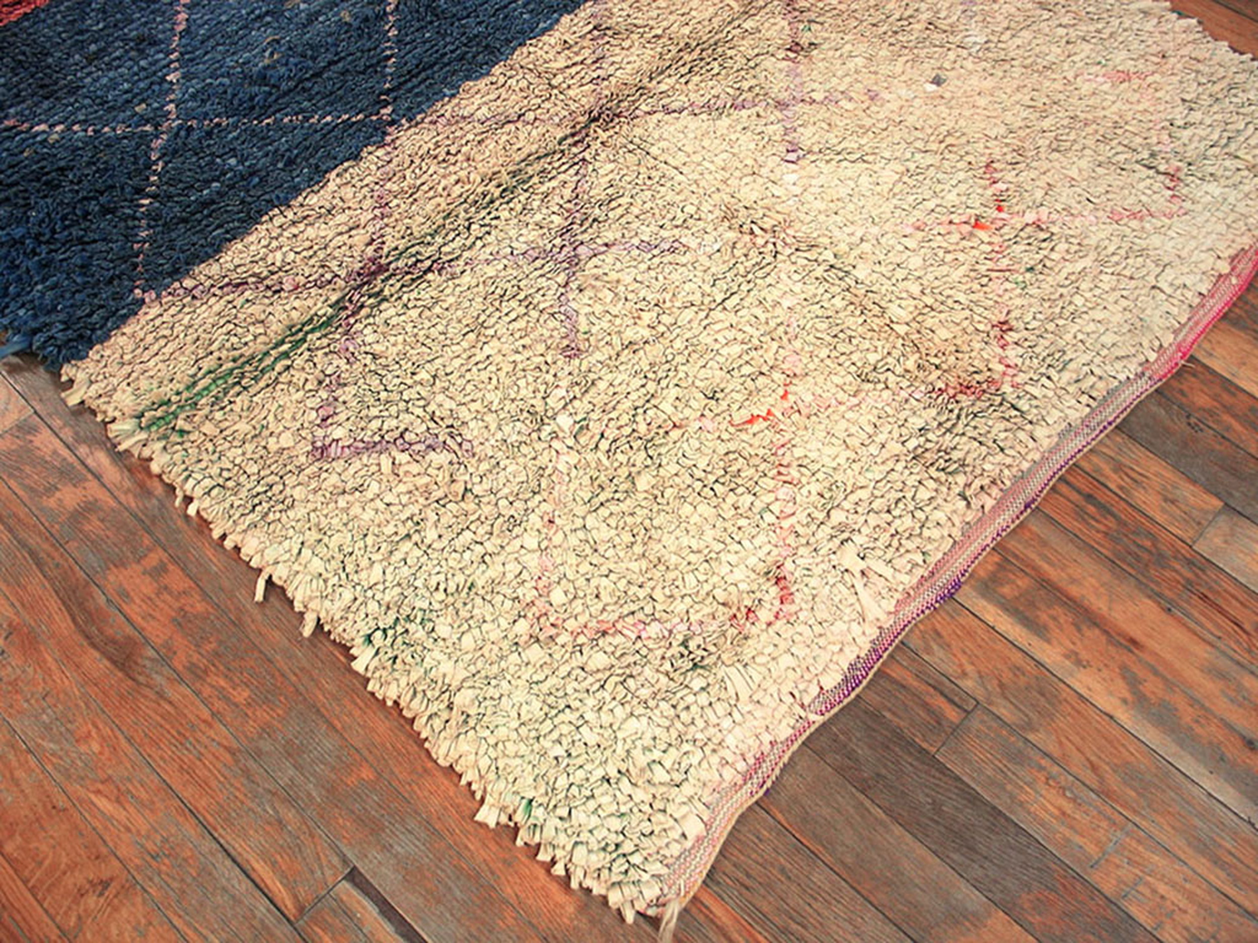 Allover Geometric Hand Knotted Pile Wool 1940s Multicolor Jewel Tones Boucherouitte Antique Rug, Circa Date: 1940s. This exceptional mid-century piece showcases the characteristic vibrancy and textural complexity of Moroccan weaving. The design features an intricate diamond grid, creating a dense allover rugs pattern across the surface.