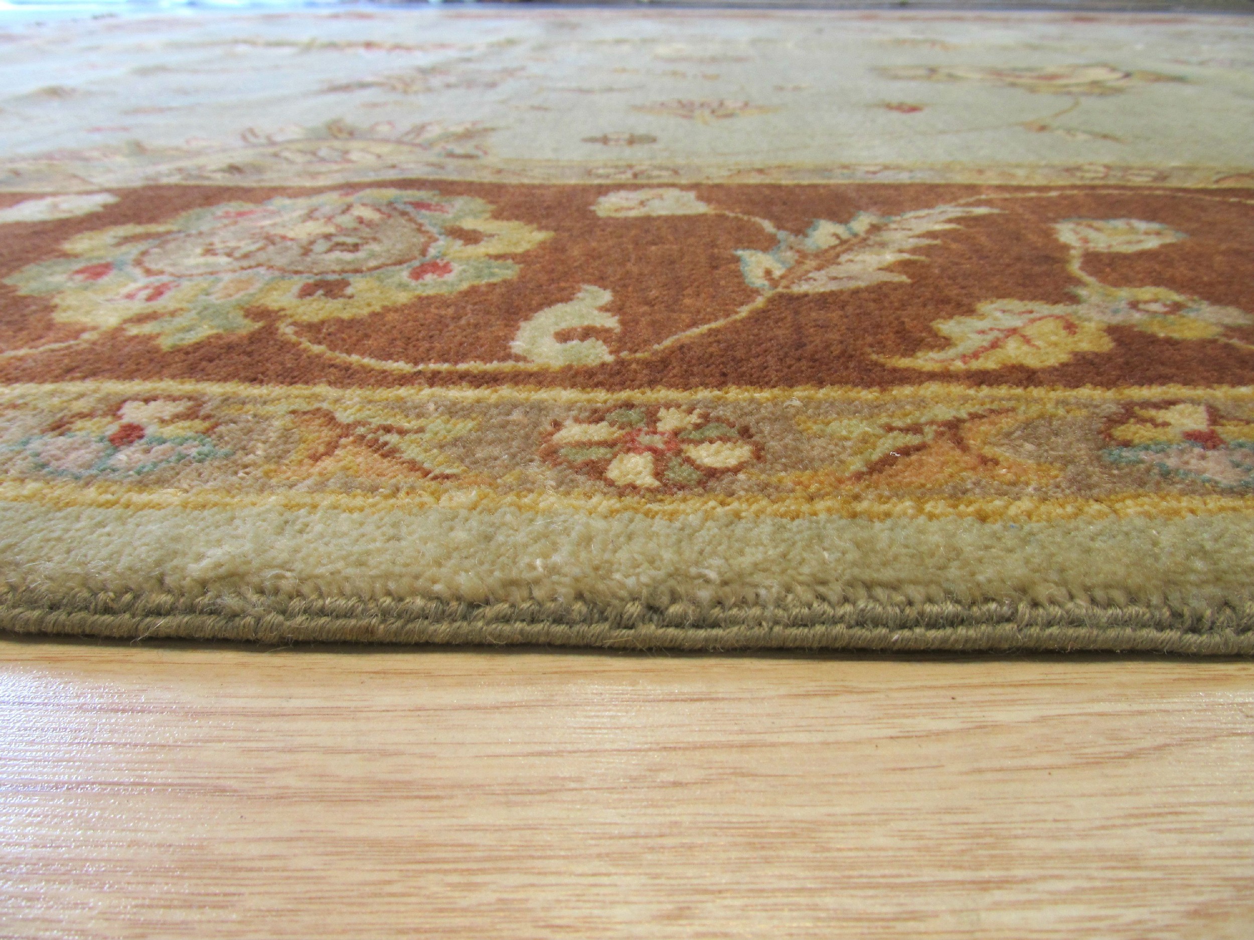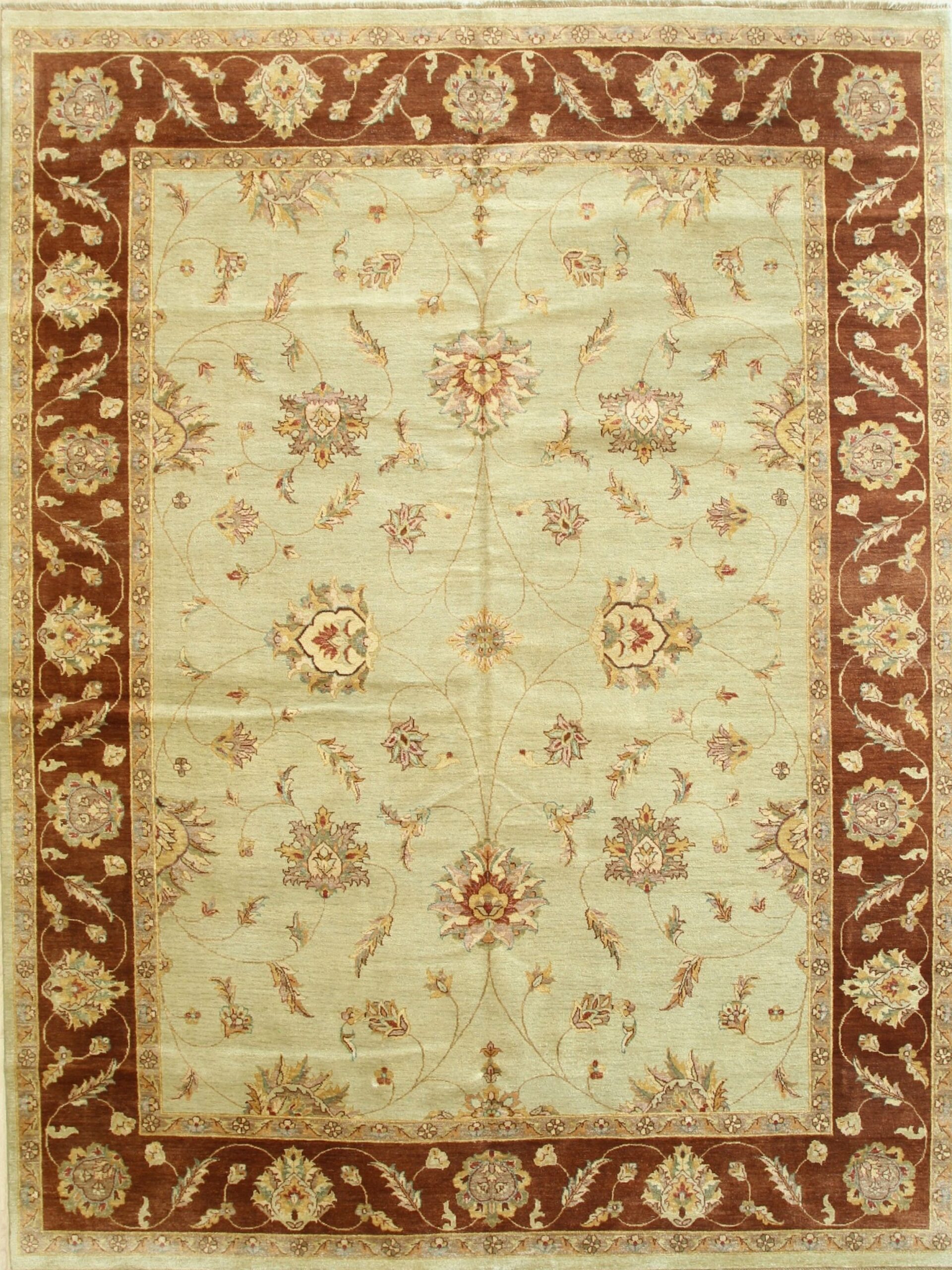 The palette is anchored by a luminous, pale sage field, providing a tranquil backdrop for the intricate botanical motifs. The subtle sheen of the wool enhances the depth of the central color, placing it firmly within our curated collection of green color rugs. This soft hue is expertly framed by the broad, contrasting border of rich terracotta brown.