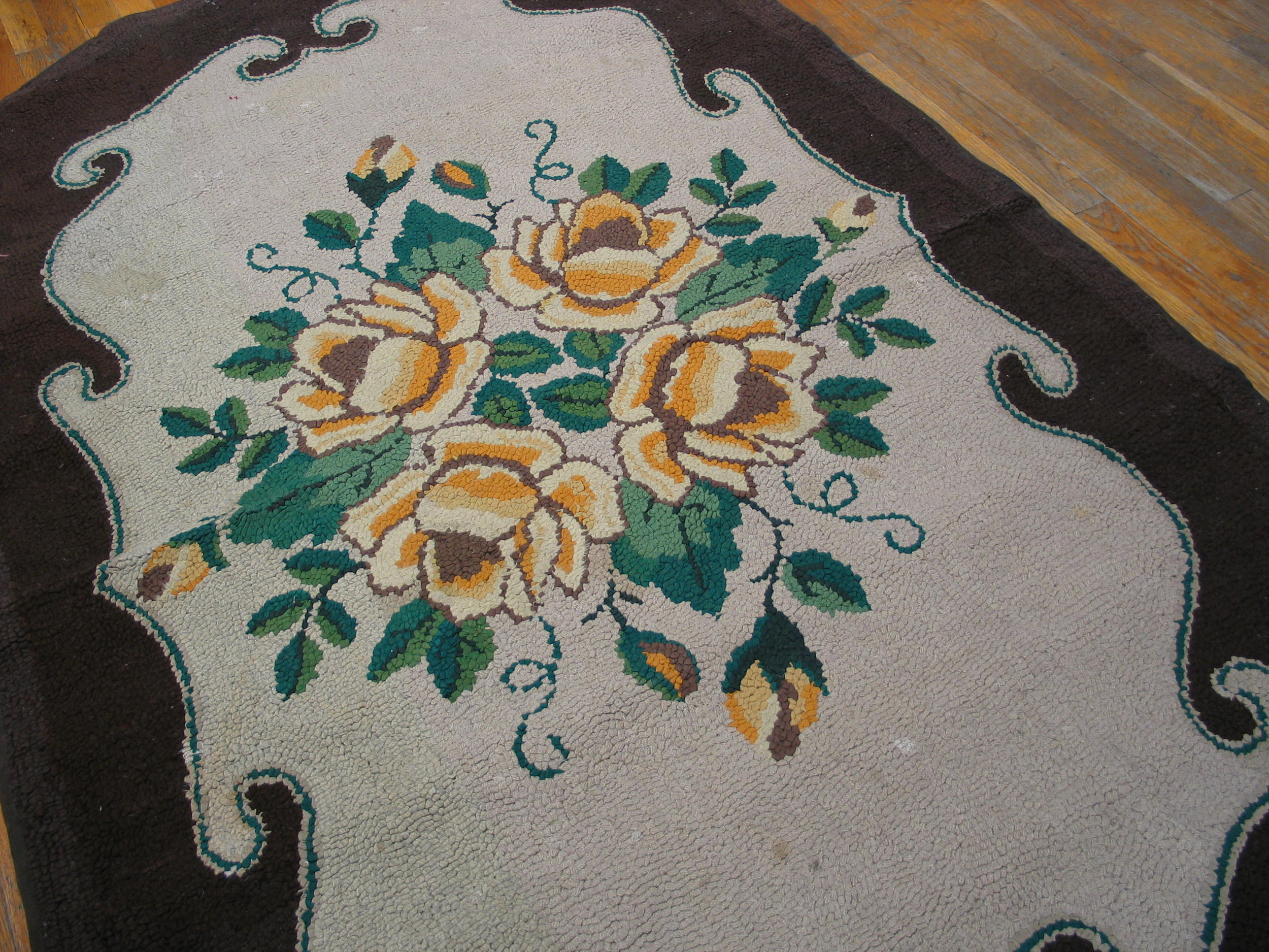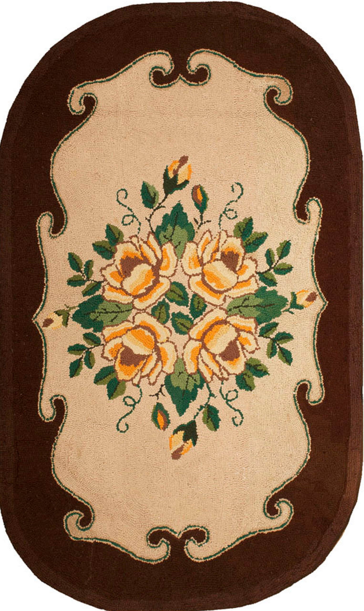 Antique American Hooked Rug American Ivory 1930s, Country of Origin: American USA Rugs, Circa Date: 1930s. This charming, hand-crafted textile represents the robust domestic folk art tradition of American USA Rugs during the Depression era. Its construction utilizes the traditional hooking technique, resulting in a dense, tactile surface that offers both durability and visual warmth.
