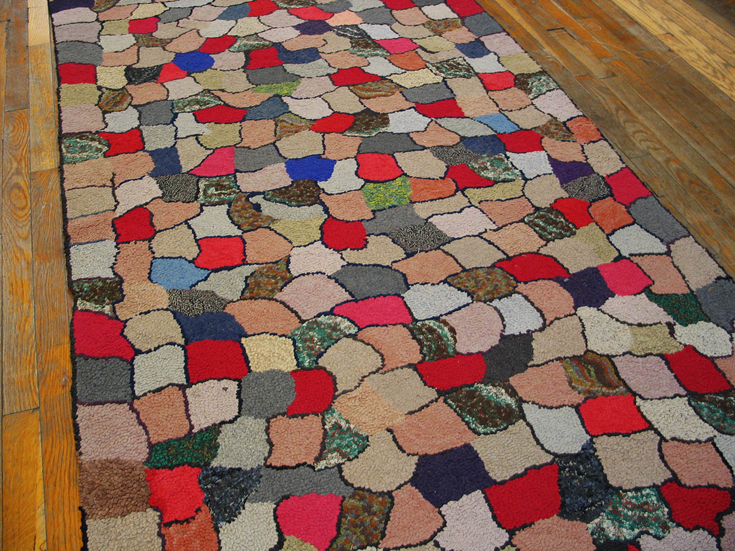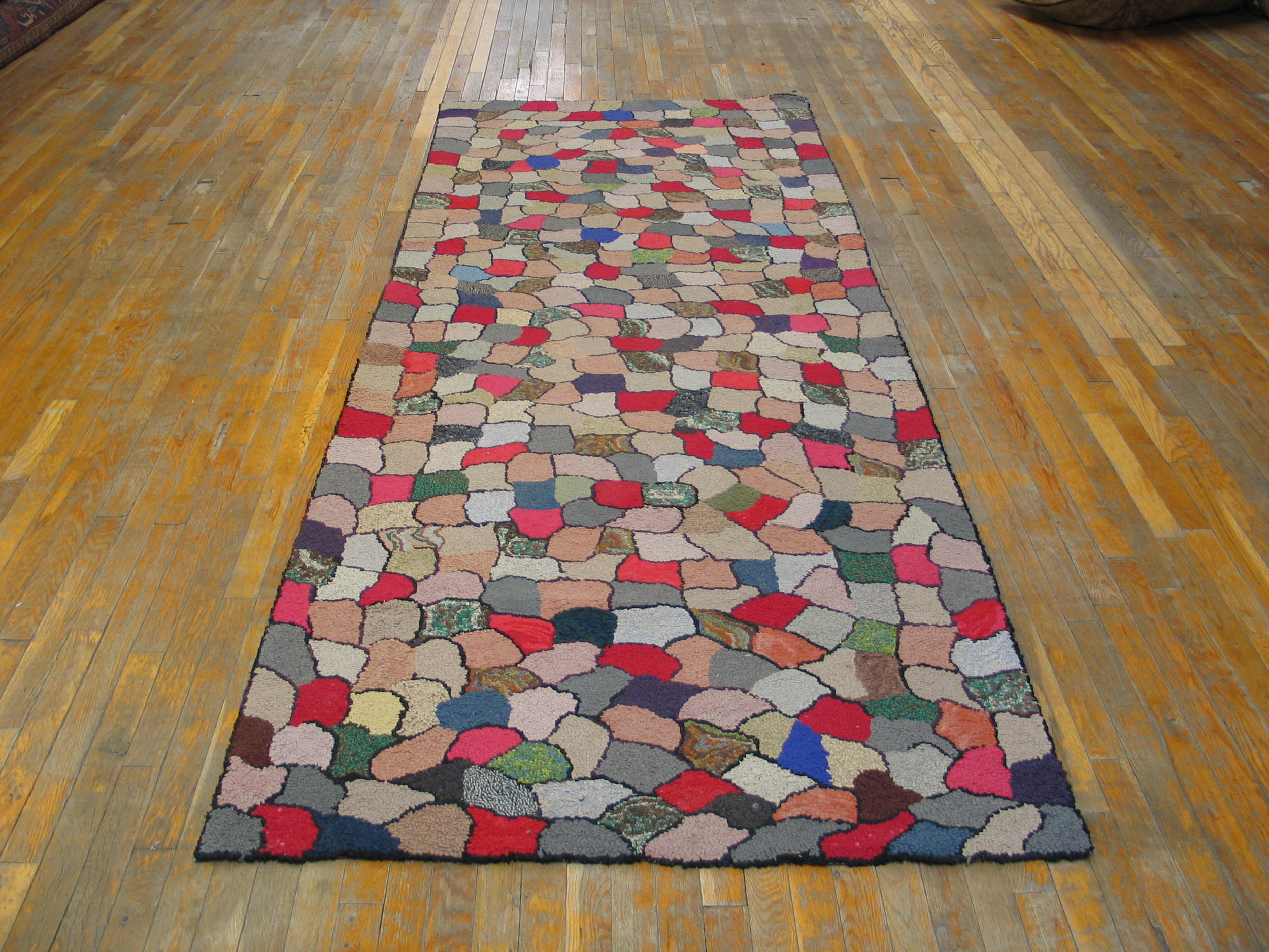Hallway Runner Rugs (4ft x 10.04ft), Circa Date: 1930s. This exceptional textile represents the height of the early 20th-century craft movement in America. Crafted using the traditional American hooked rug technique, this piece transforms humble materials into a sophisticated, highly textural floor covering.