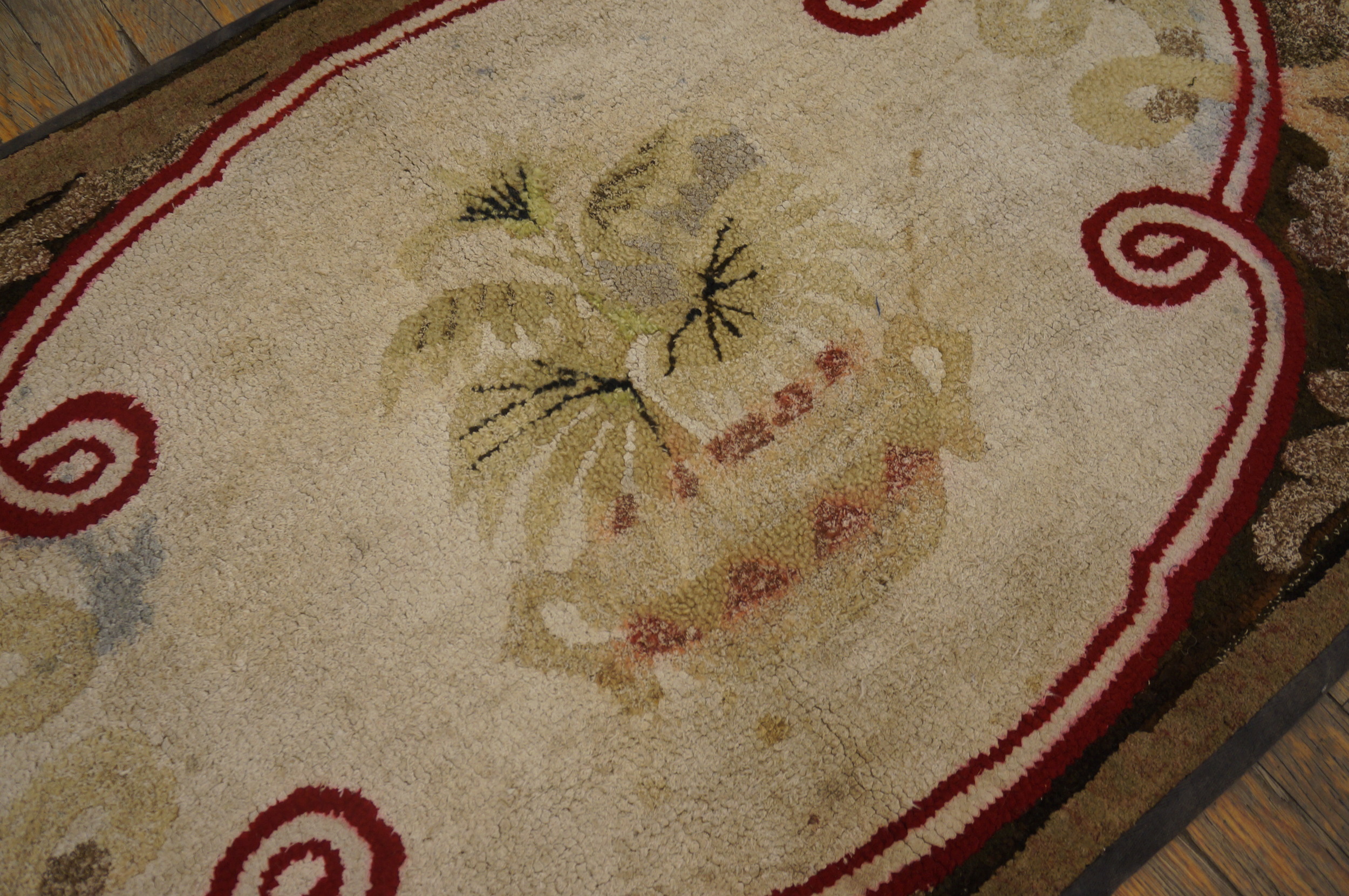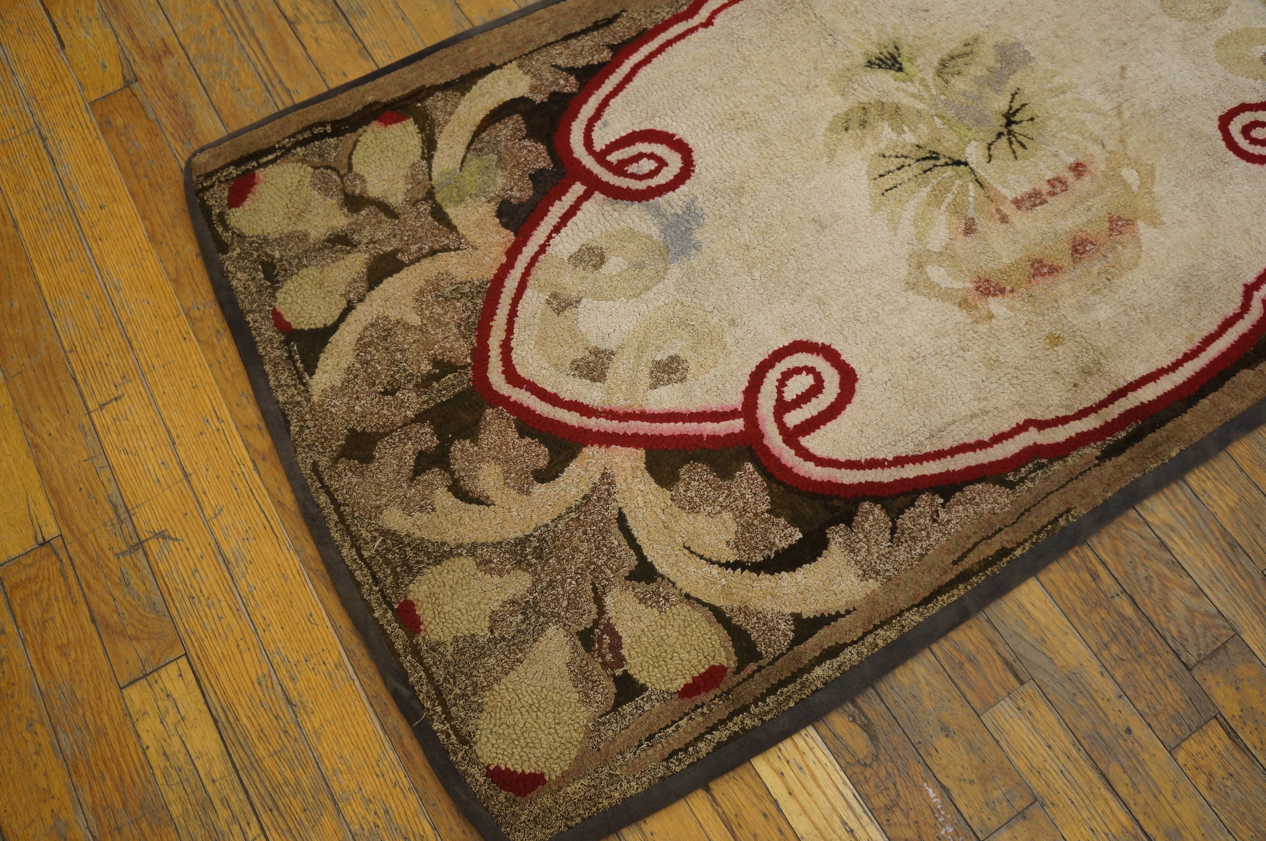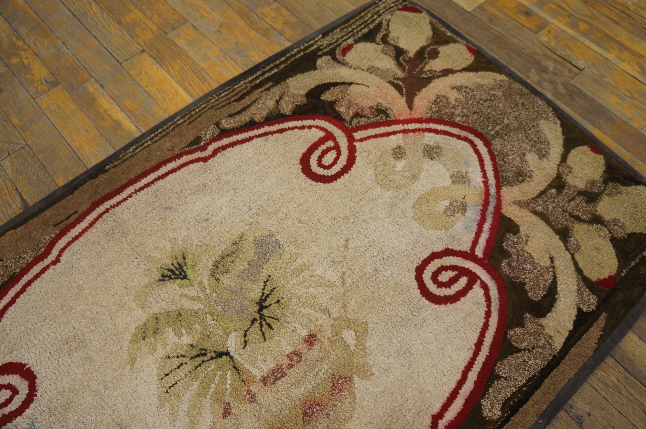 American Hooked Ivory Antique Wool 1890s Small Scatter Size Rug, Circa Date: 1890s. This charming example of American Hooked rugs from the late 19th century captures the spirit of domestic folk artistry prevalent during the period. The robust texture, created by the distinctive looping technique, lends the piece an exceptional tactile quality that speaks to its handmade origins.