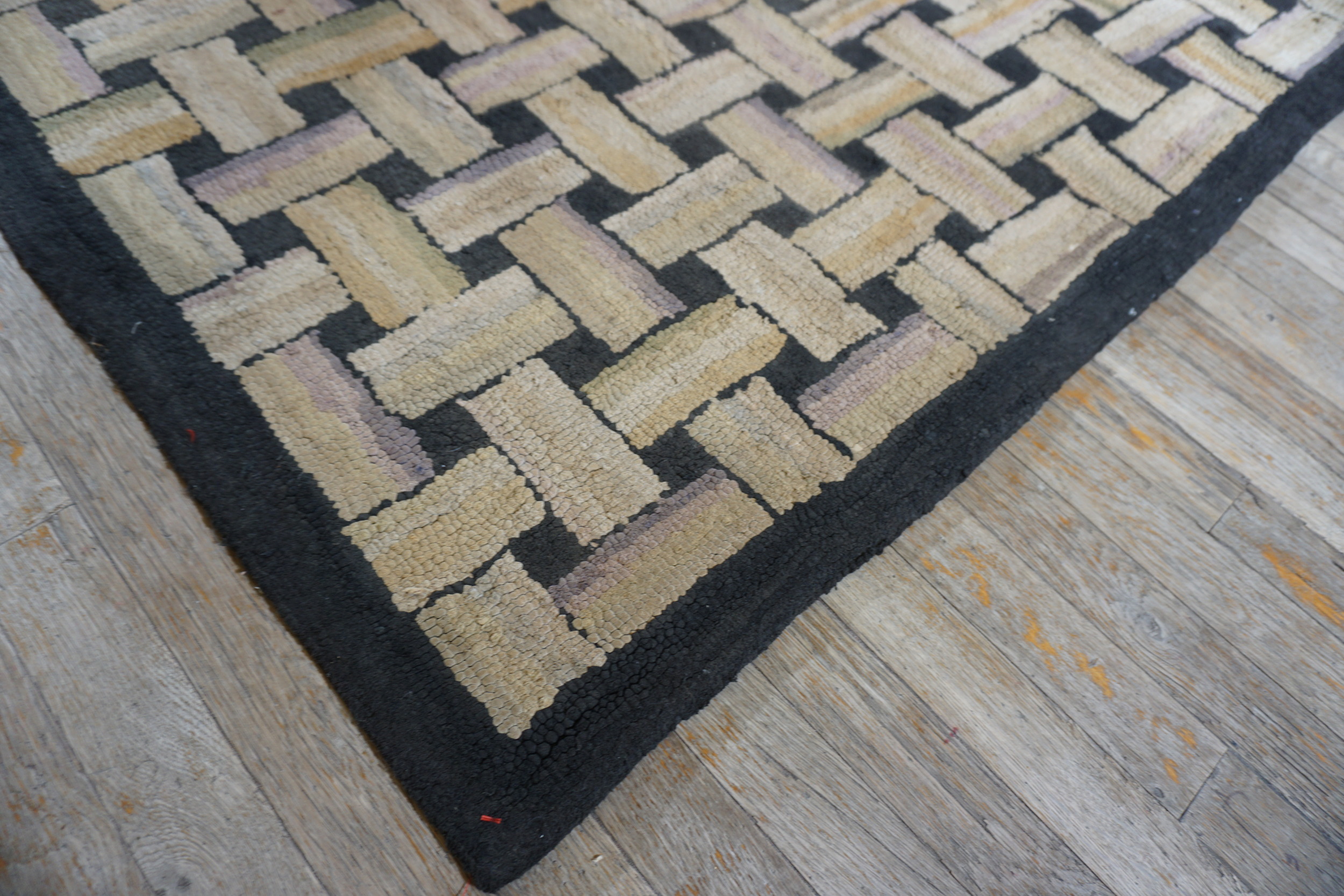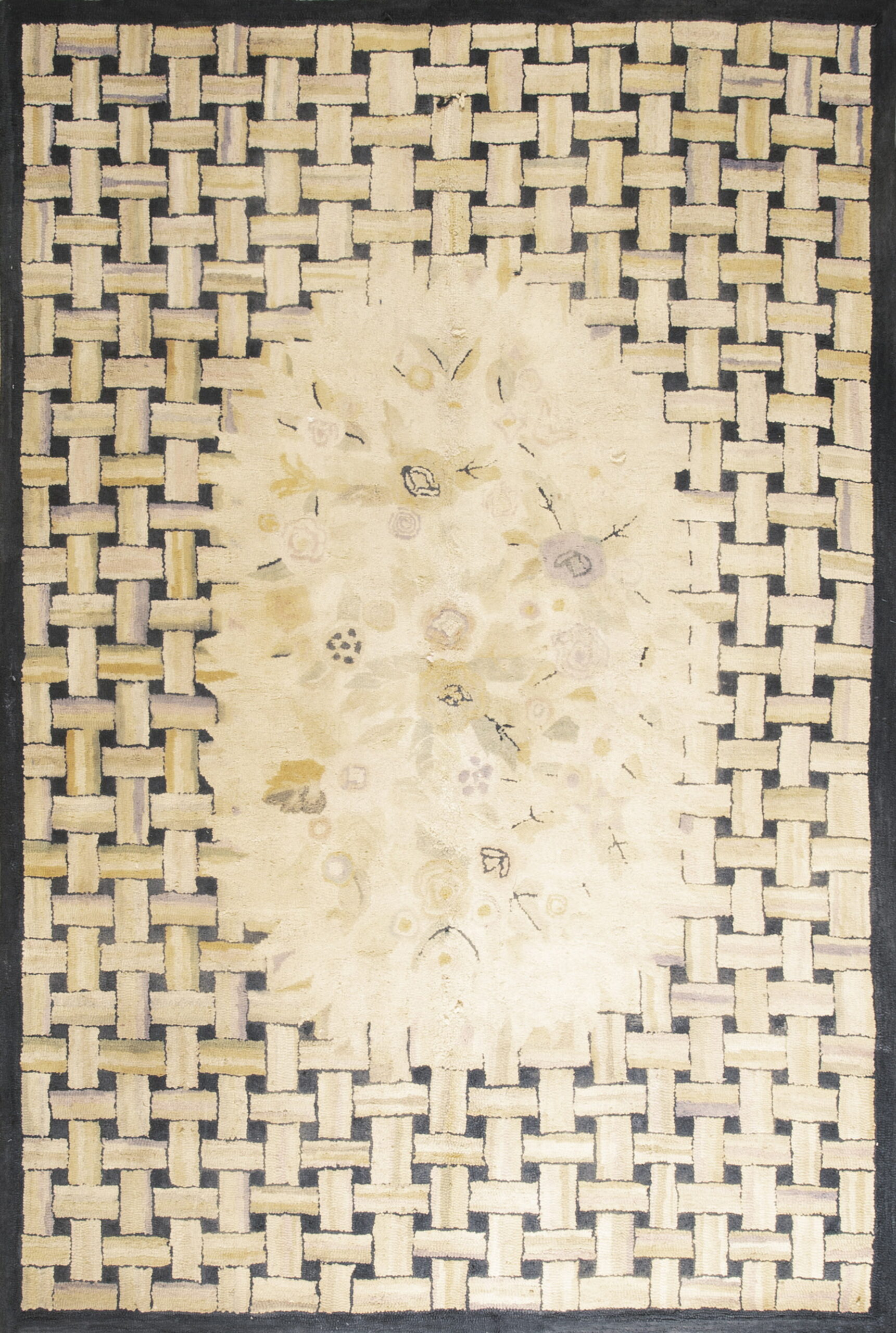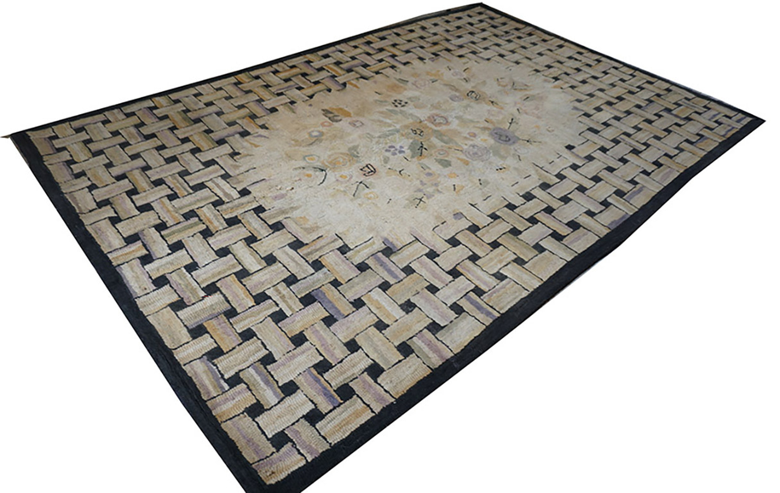 A robust, basketweave-inspired border frames the composition, utilizing dark charcoal and varying shades of tan to create striking visual depth and structure. The hand-hooked technique lends the surface a textural, dimensional quality that is highly prized in collectible antique rugs, offering a tactile experience that speaks directly to its origins as a carefully crafted domestic textile.