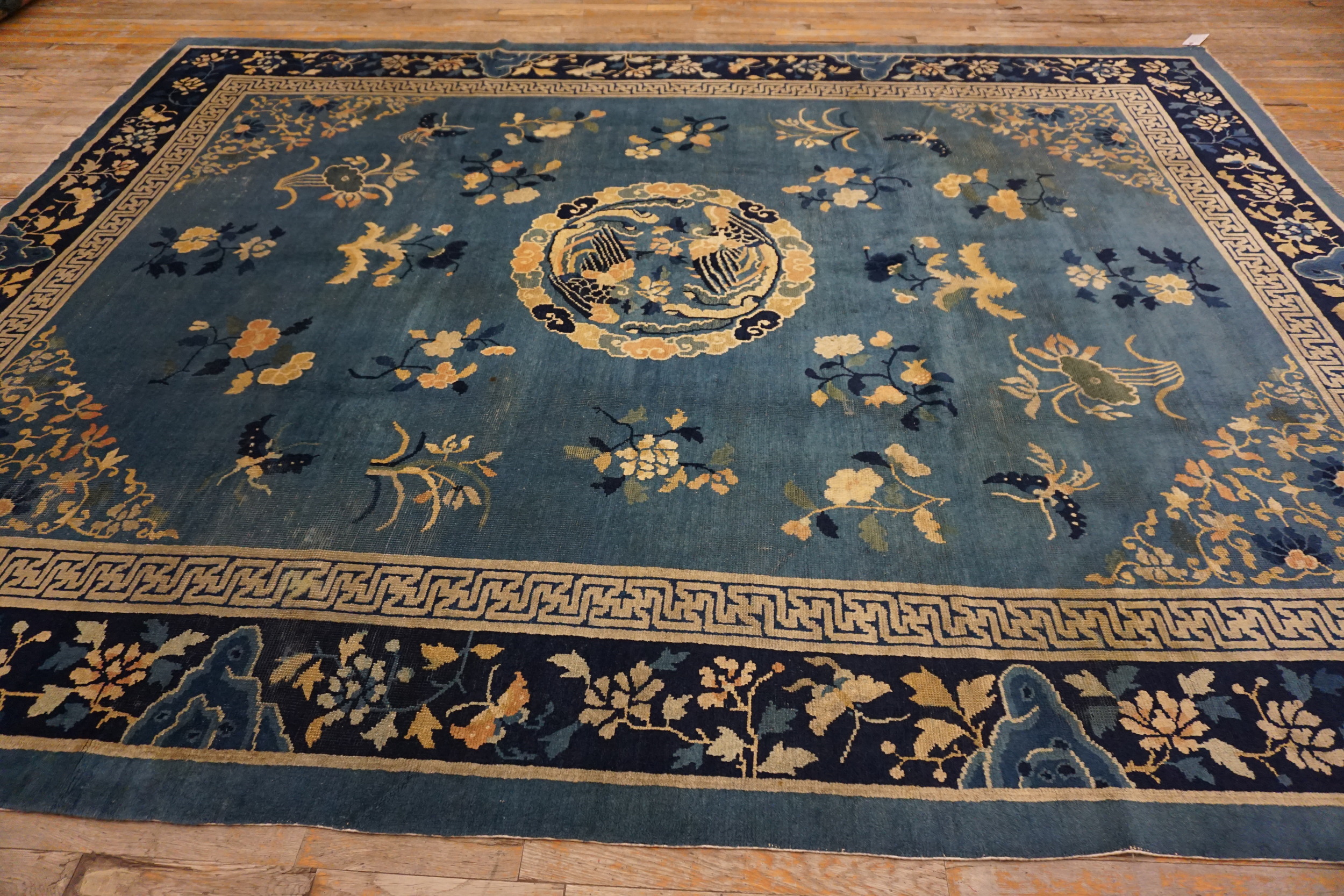 Antique 1900s Chinese – Peking Rectangle Room Size Blue Knotted Wool Rug, Circa Date: 1900s. This exceptional piece represents the height of early 20th-century Chinese weaving, specifically the refined Peking style. Its generous dimensions classify it as a true room size rug, ideal for anchoring a major living space or formal dining area. The hand-knotted wool pile retains a beautiful, soft luster characteristic of high-quality antique textiles.