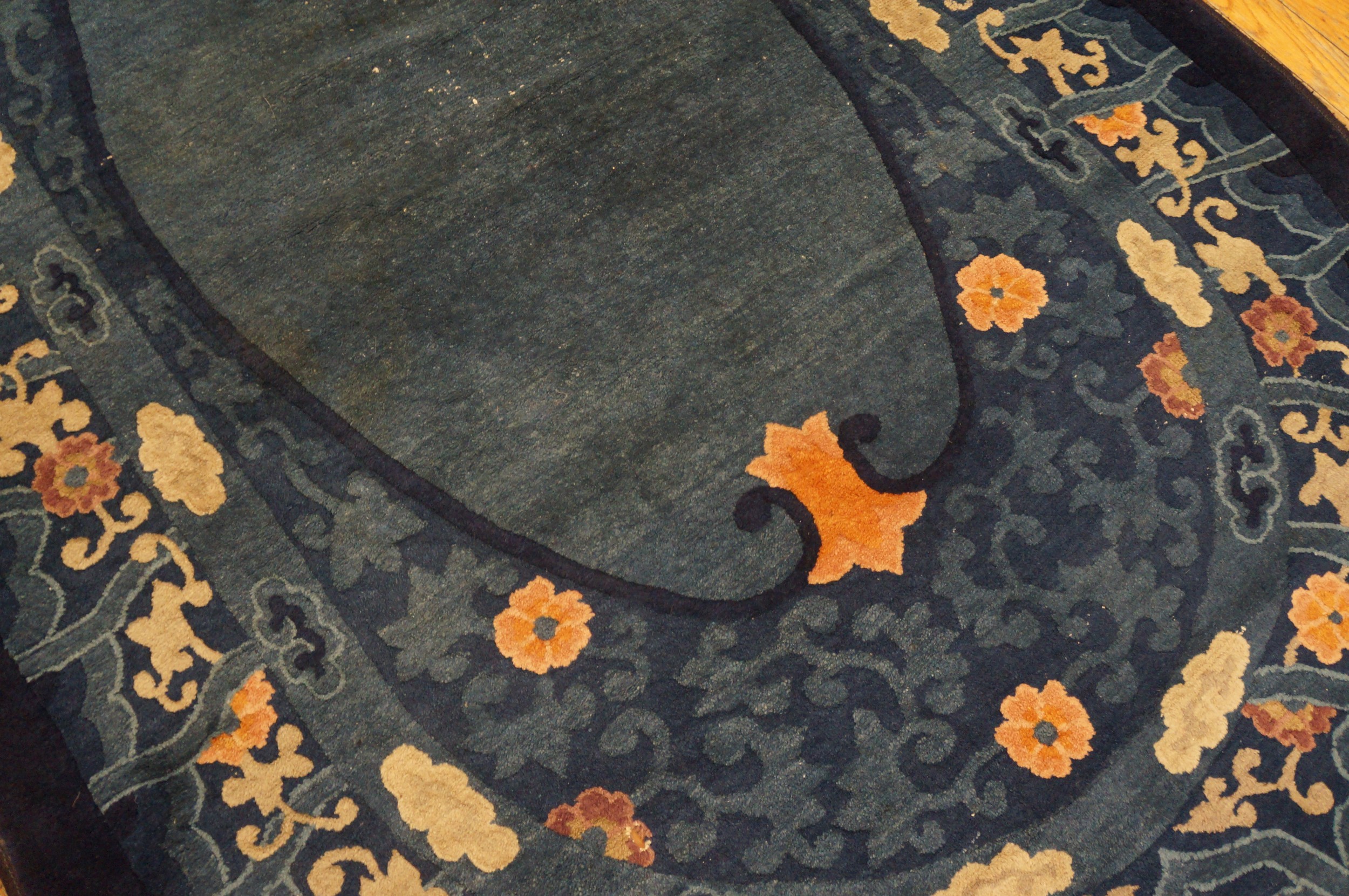 Antique 1920s Hand Knotted Pile Wool Oval Blue Rug, Circa Date: 1920s. This exquisite piece represents the height of early 20th-century decorative weaving. Its unusual oval format immediately distinguishes it within the category of antique rugs. The deep, saturated indigo field provides a dramatic backdrop for the stylized border motifs.