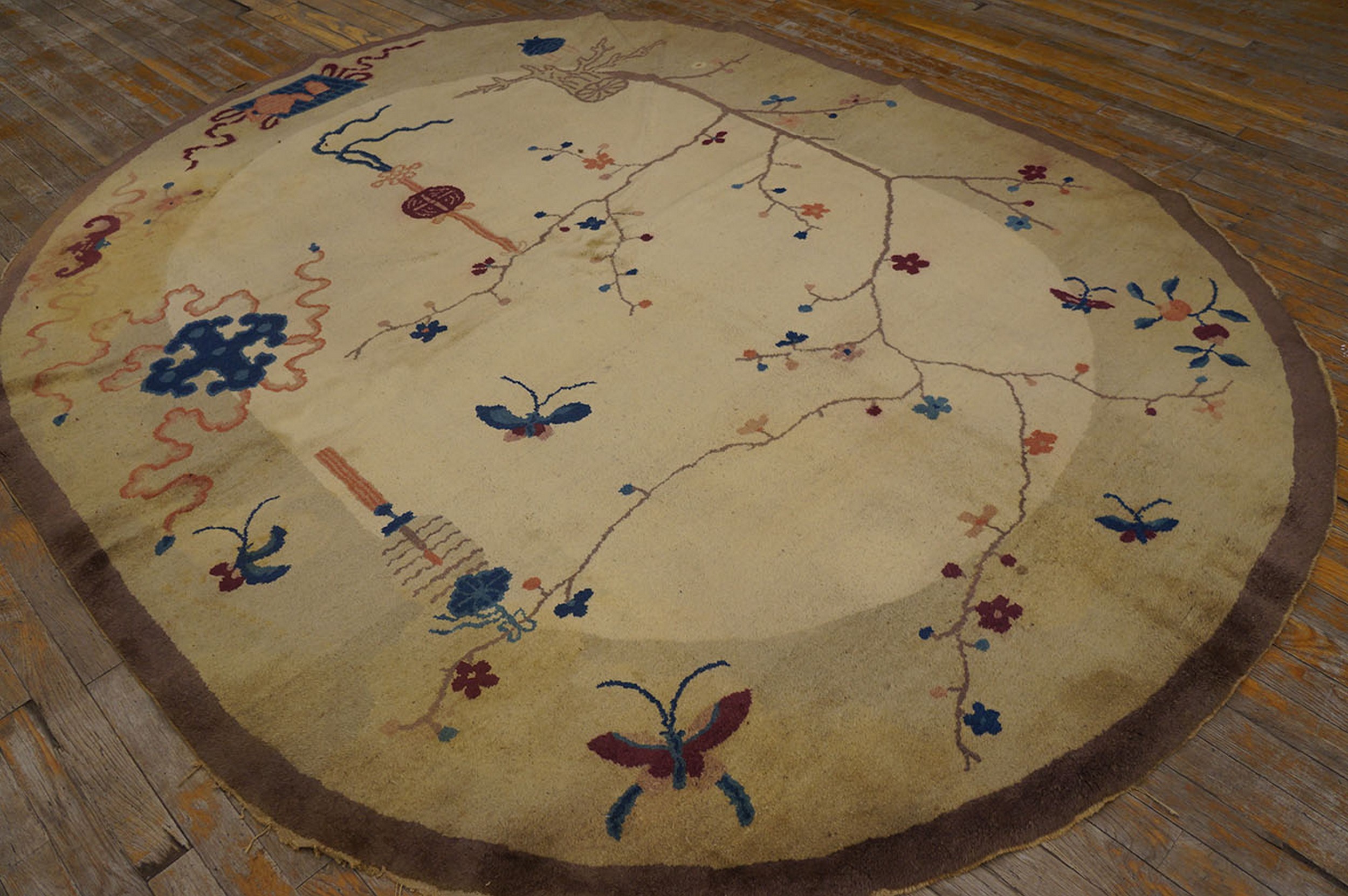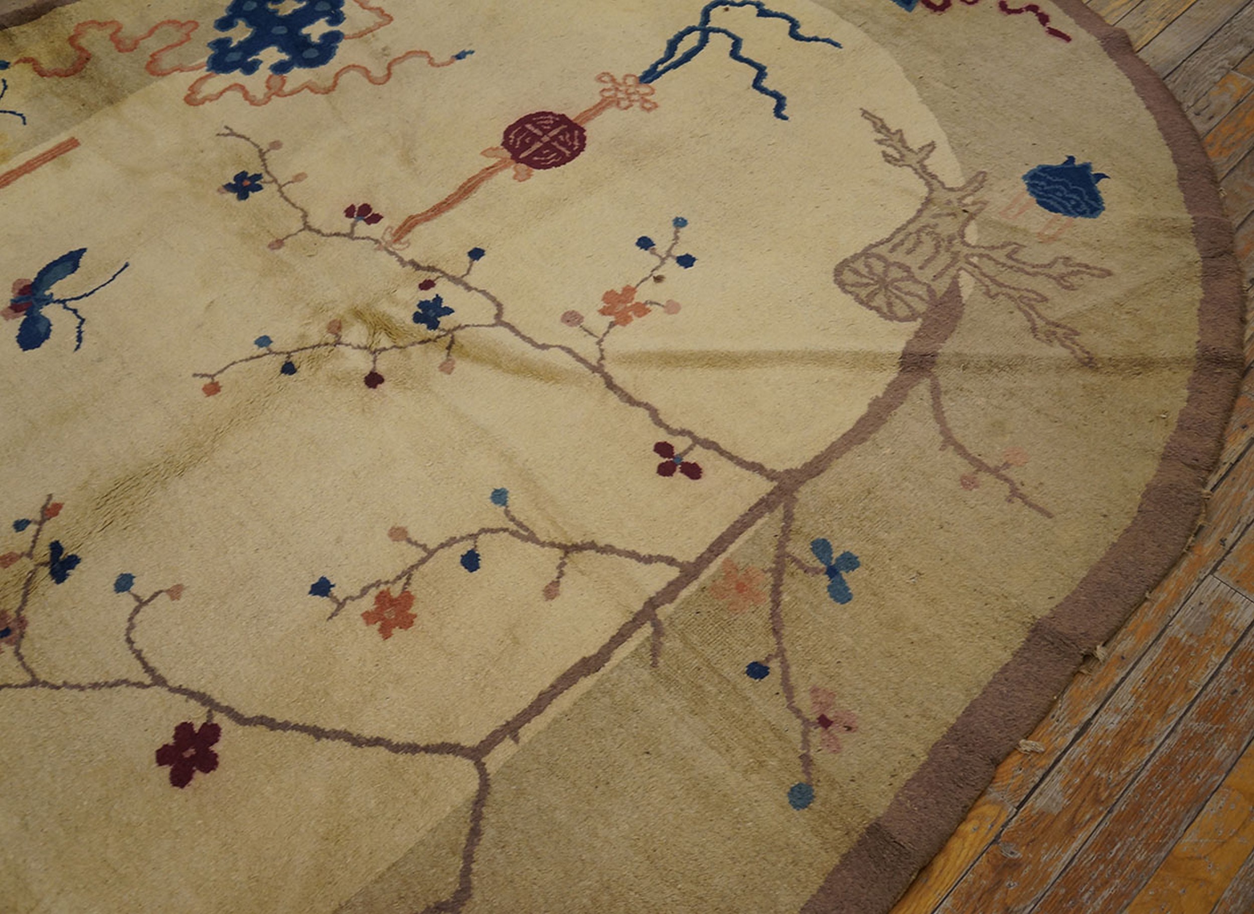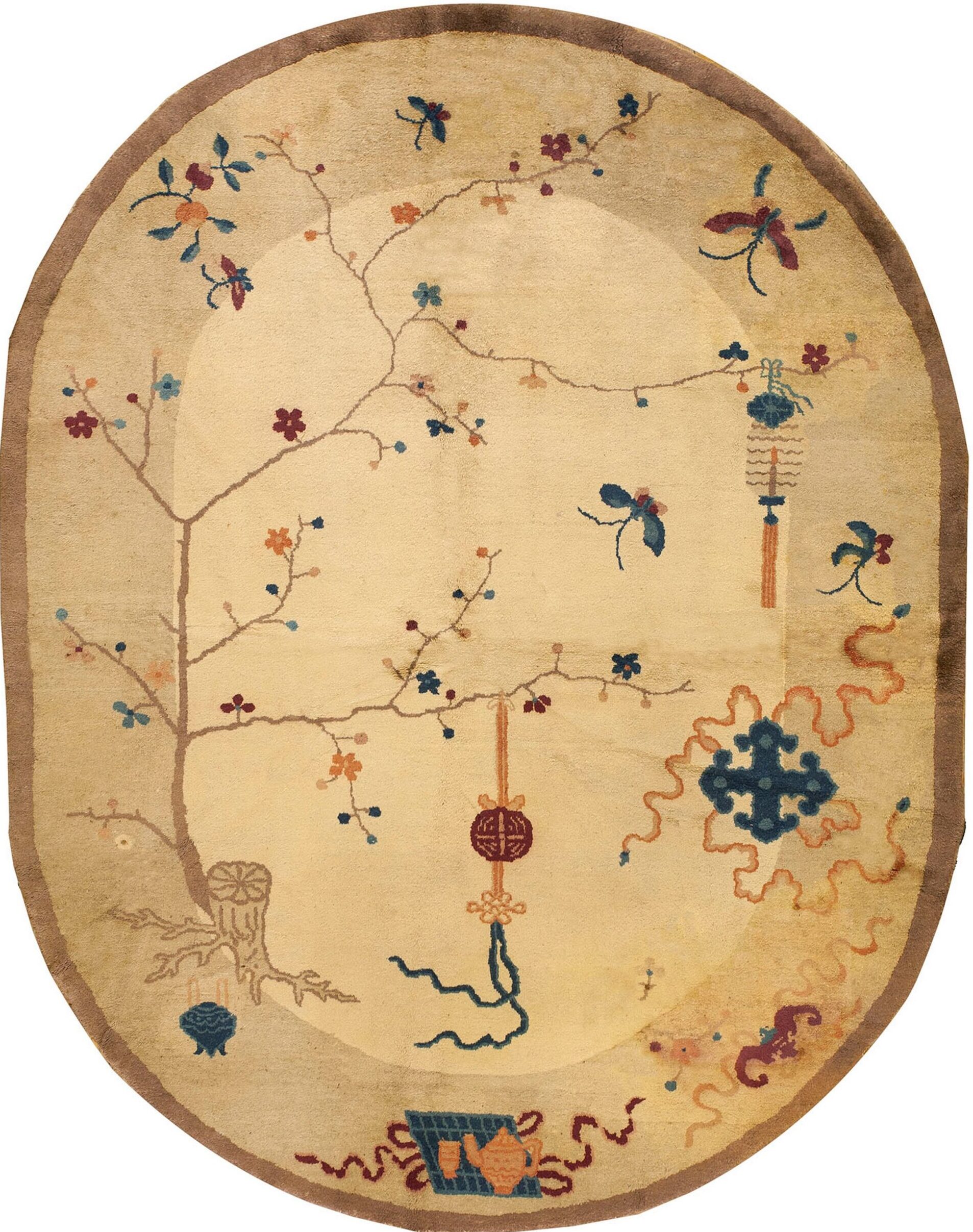 Antique 1920s Ivory Beige Cream White Oval Hand Knotted Pile Wool Rug, Circa Date: 1920s. This exceptional piece exemplifies the elegance of early 20th-century design, presenting an unusual oval format that immediately distinguishes it from standard rectangular antique rugs. The plush, hand-knotted wool pile provides a luxurious texture, perfectly complementing the subdued, sophisticated palette.