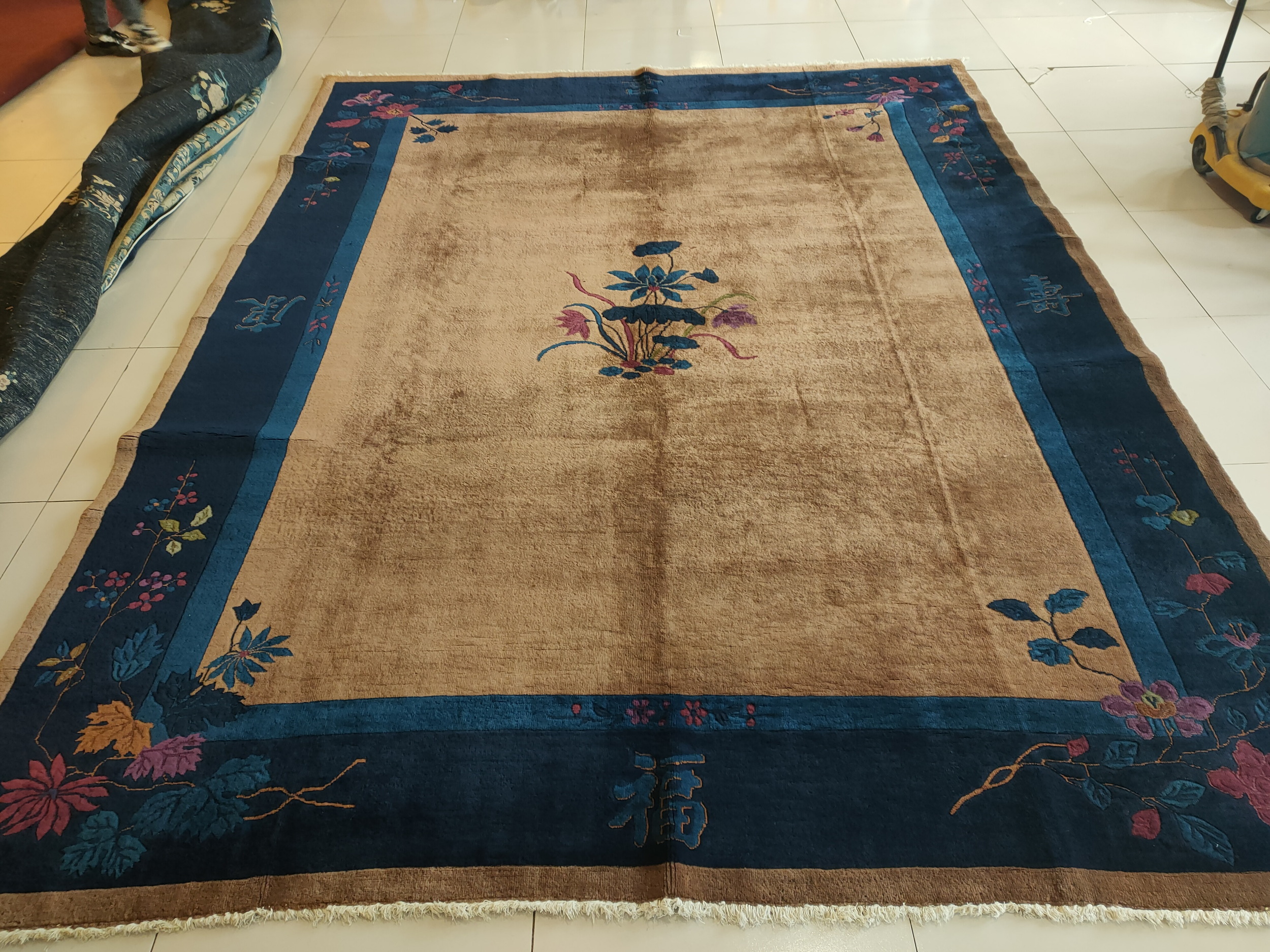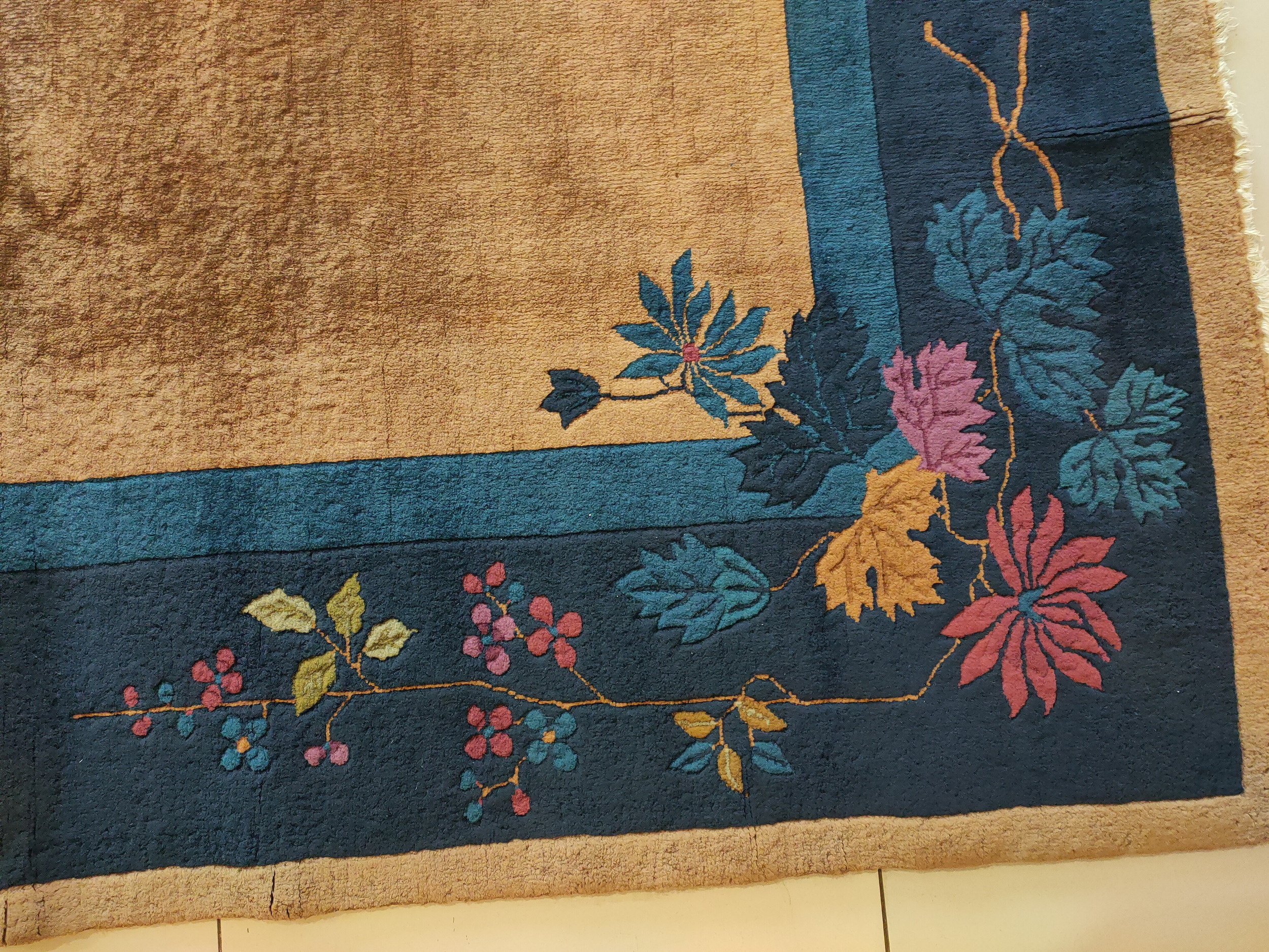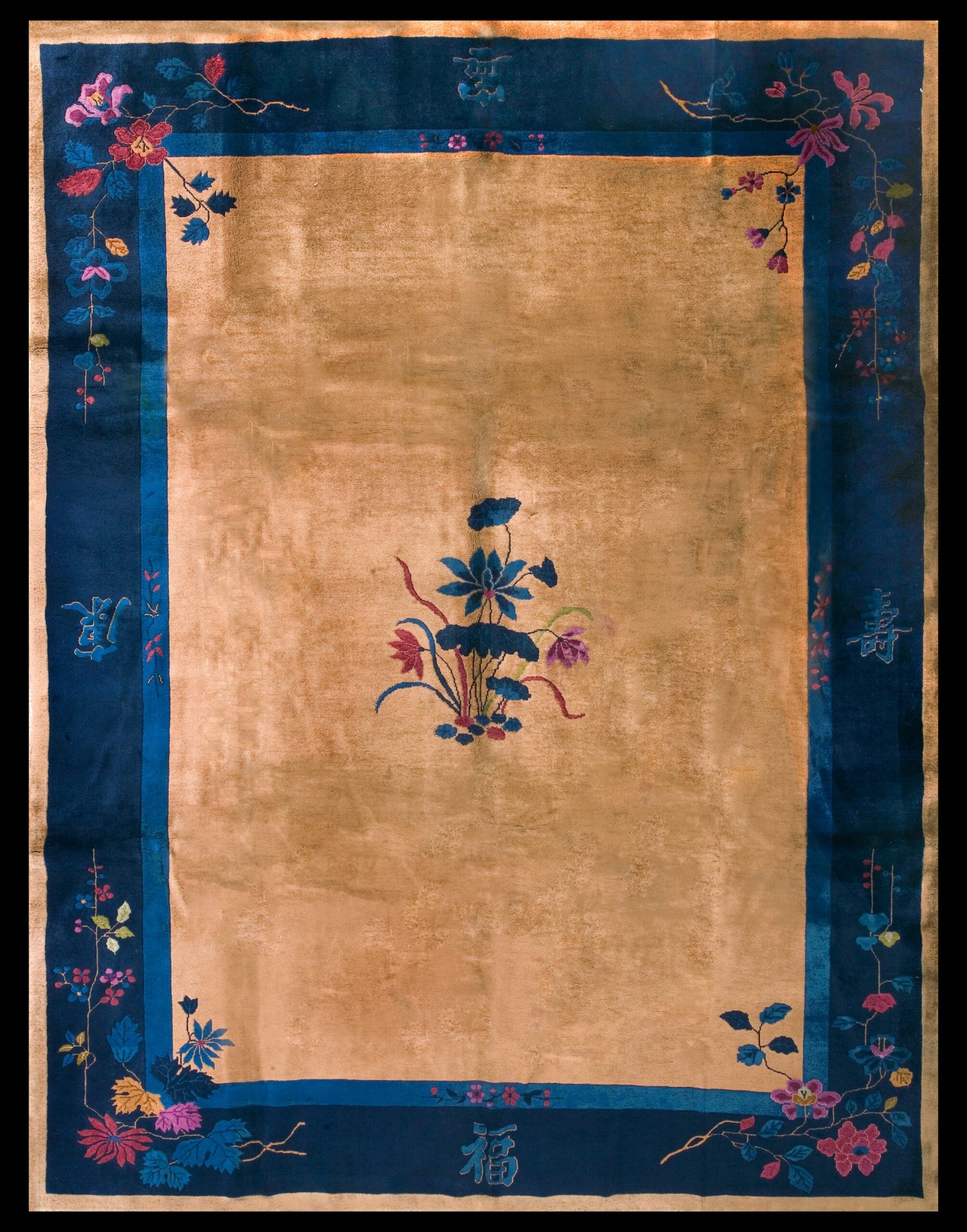 Hand-knotted from high-quality wool, this rug possesses the plush, thick pile characteristic of early 20th-century Chinese production. It remains a superb example of antique rugs that successfully bridges traditional Eastern craftsmanship with modern Western design sensibilities.