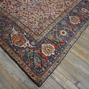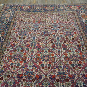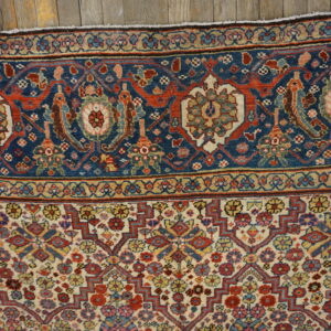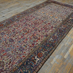 The field of this gallery carpet is defined by its ivory ground, a rare and luminous foundation that enhances the impact of its garden-inspired design. Garden motifs in antique Persian carpets are deeply rooted in centuries-old artistic traditions, symbolizing nature’s order and serene balance. Here, stylized blossoms, vine work, and abstracted botanical elements traverse the field in rhythmic succession, lending a sense of movement and spaciousness that accentuates the carpet’s elongated format.