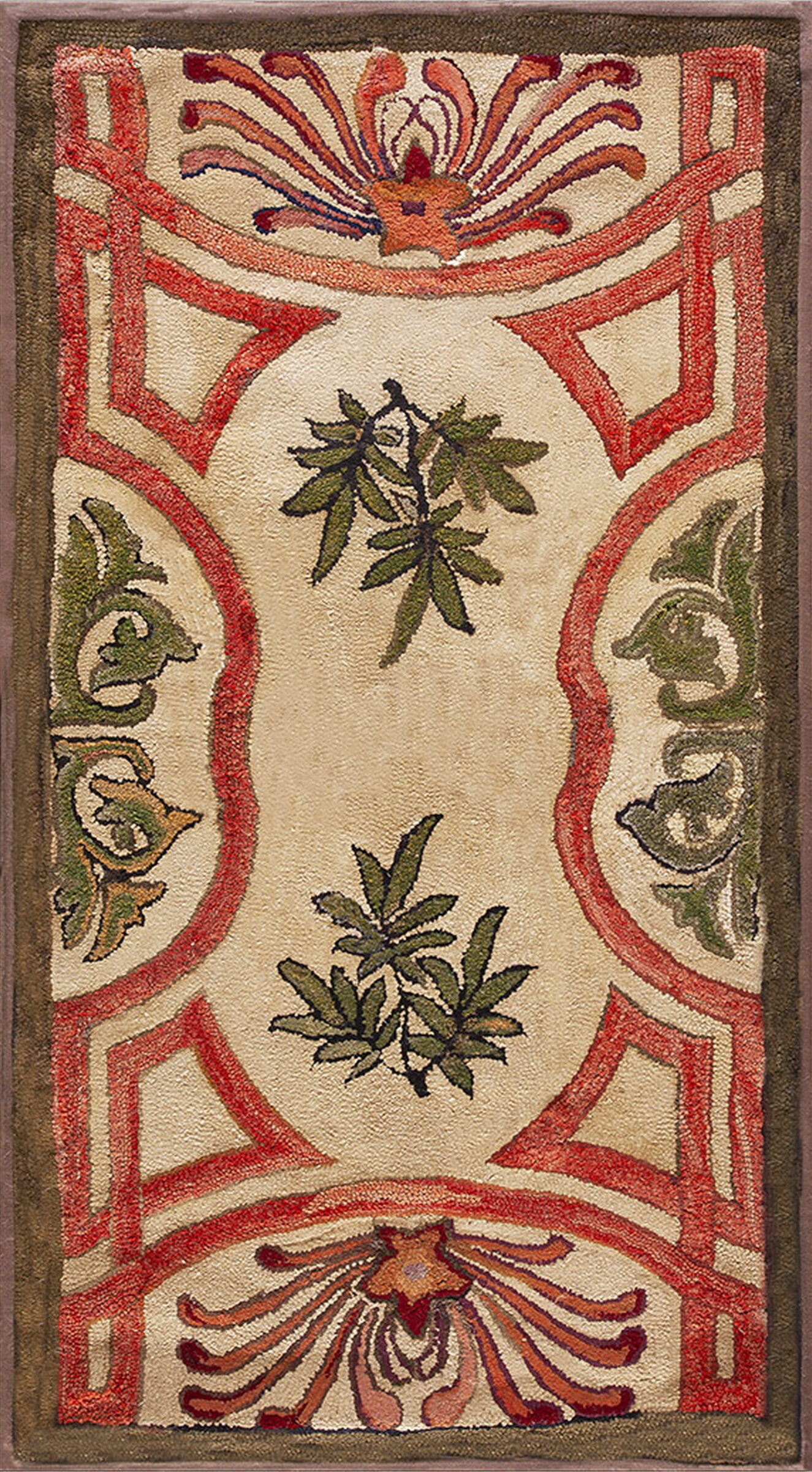 Antique American Hooked Rug American Ivory 1920s Ivory, Circa Date: 1920s. This exceptional example of American hooked rugs captures the transitional design sensibilities prevalent in the early 20th century, combining traditional folk artistry with sophisticated decorative flair.