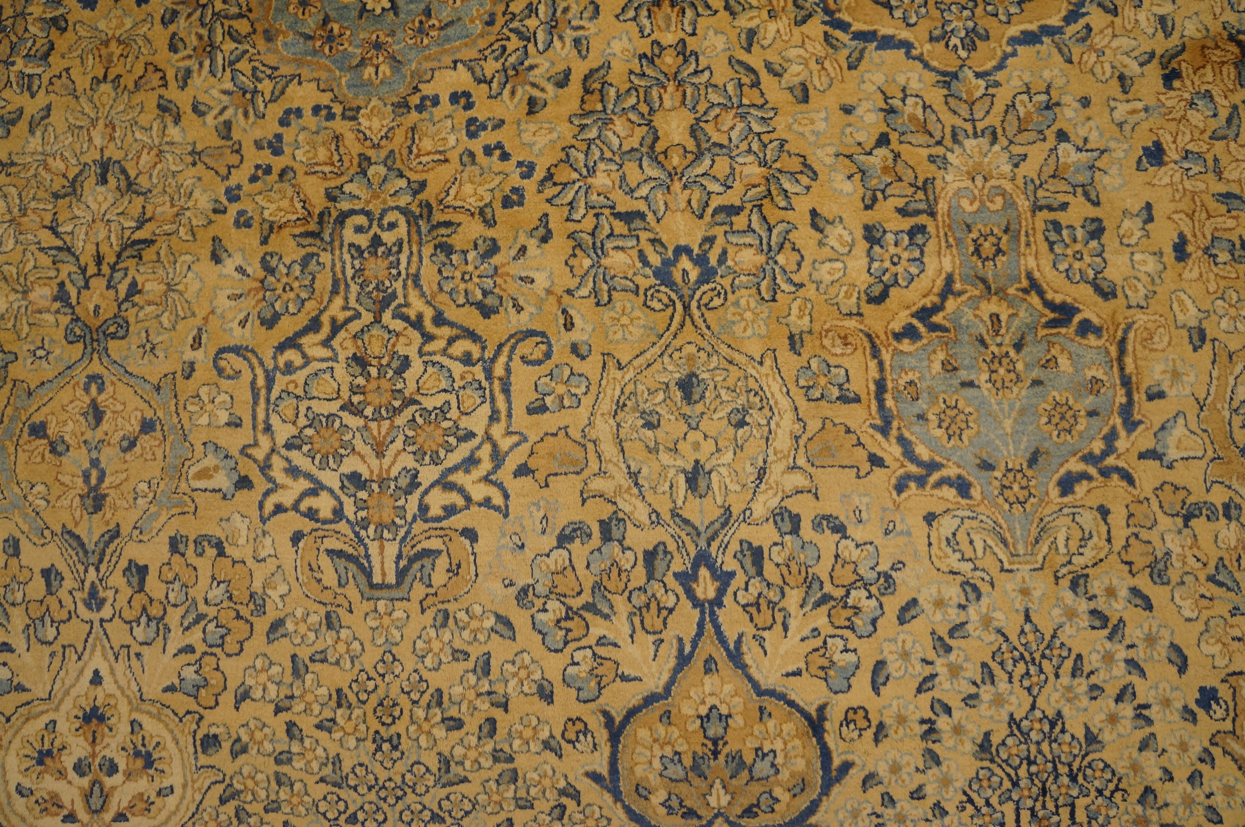 The design employs a sophisticated allover pattern, where intricate botanical motifs—vines, palmettes, and delicate blossoms—are distributed uniformly across the field. This dense, non-medallioned structure creates a visual texture that is both complex and harmonious, allowing the eye to wander without interruption across the finely rendered wool pile.