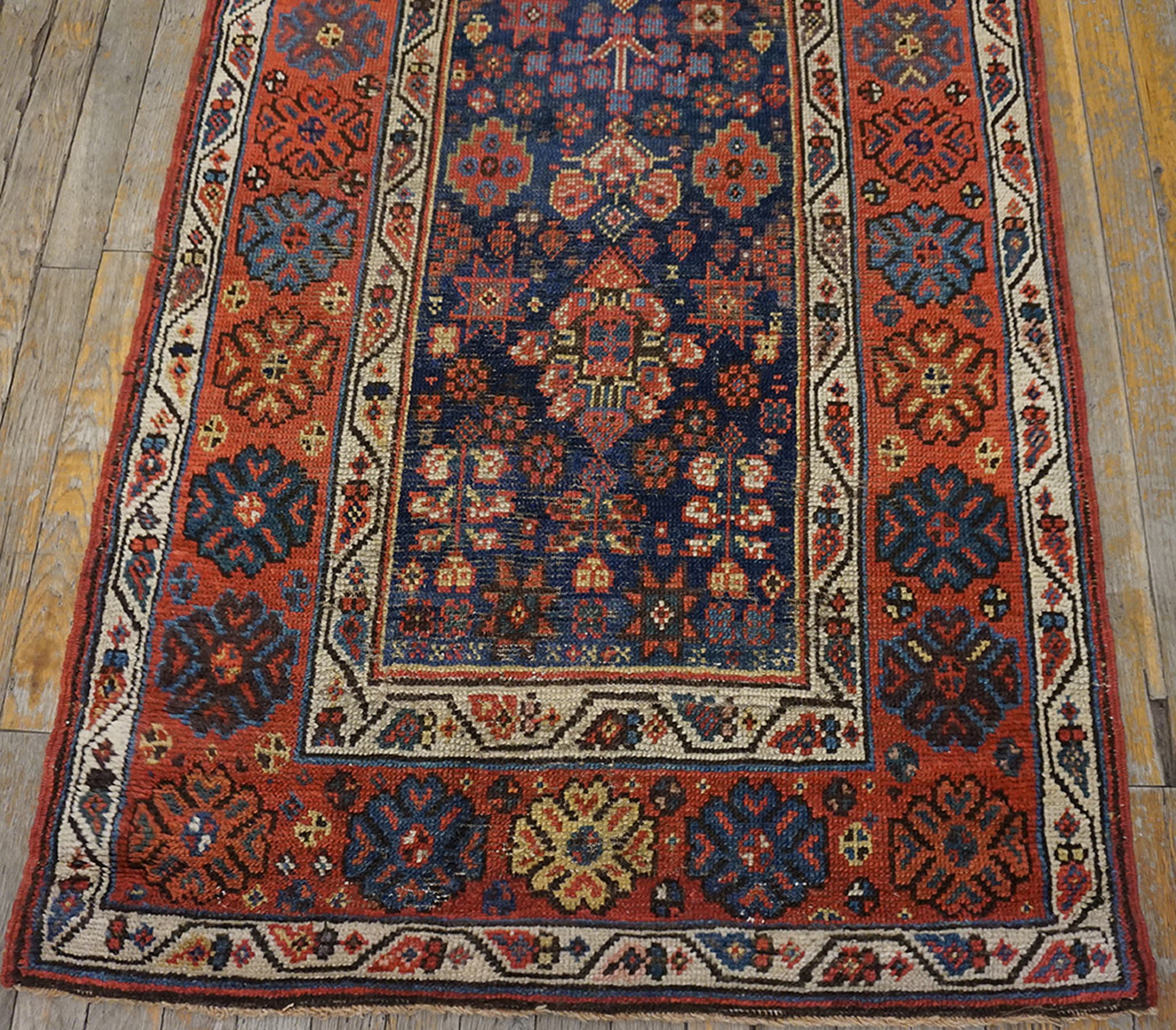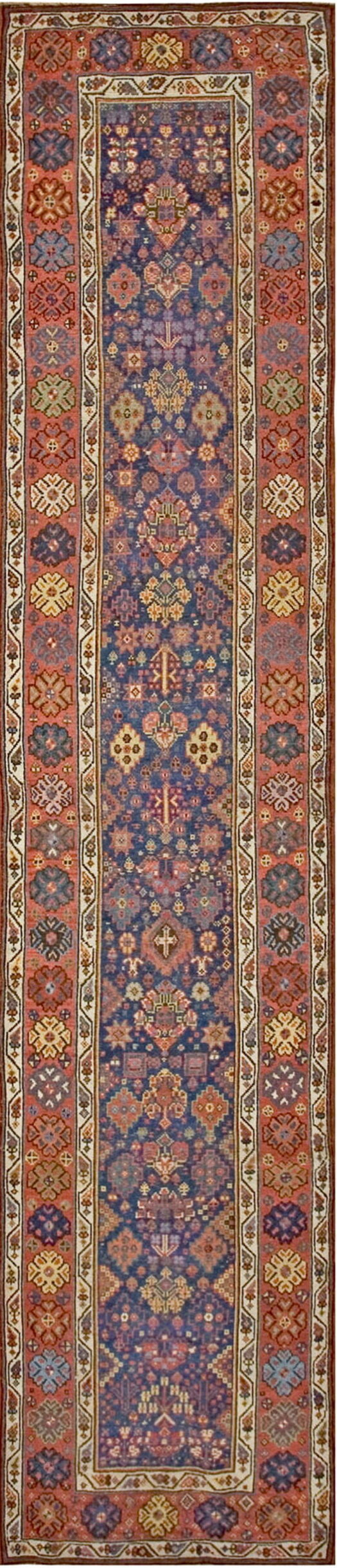 Hallway Runner Rugs (3ft x 14ft), Circa Date: 1890s. This exceptional hand-knotted wool piece features a classic tribal aesthetic, characterized by its dense, repeating geometric design. The composition utilizes an allover rugs structure, where the motifs flow continuously across the entire field, creating a sense of infinite pattern and visual richness typical of late 19th-century village weaving.