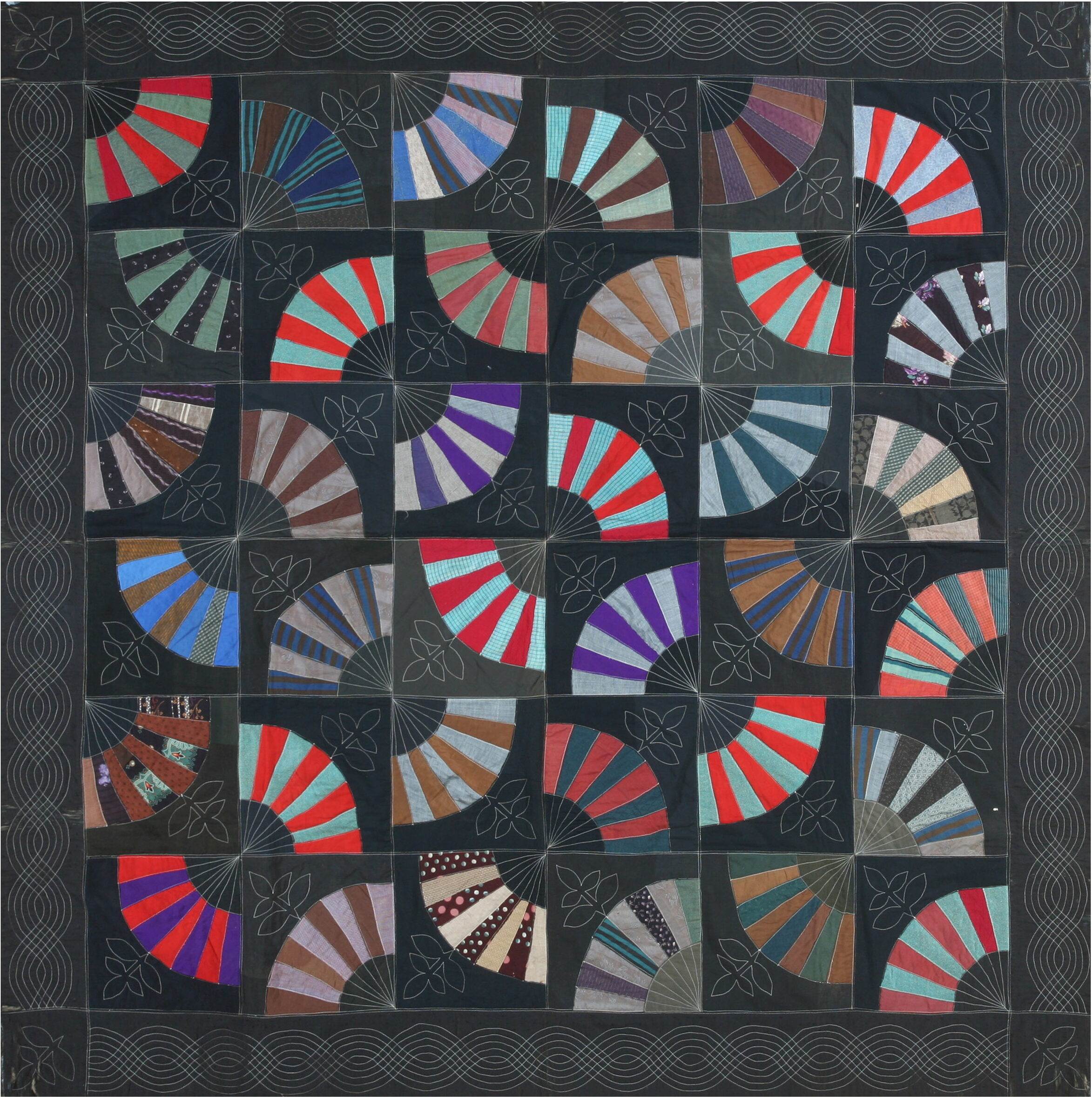 The composition is highly structured, featuring a repeating grid of blocks that establishes a powerful visual rhythm across the entire surface. This dense arrangement functions effectively as an allover design, ensuring that the eye finds consistent movement and detail in every quadrant. The delicate, hand-stitched quilting lines—including stylized floral and serpentine motifs—further enhance the depth and texture of the dark field, demonstrating a high degree of technical skill.
