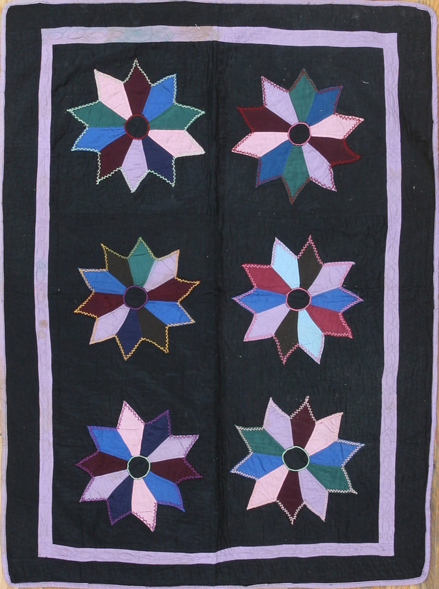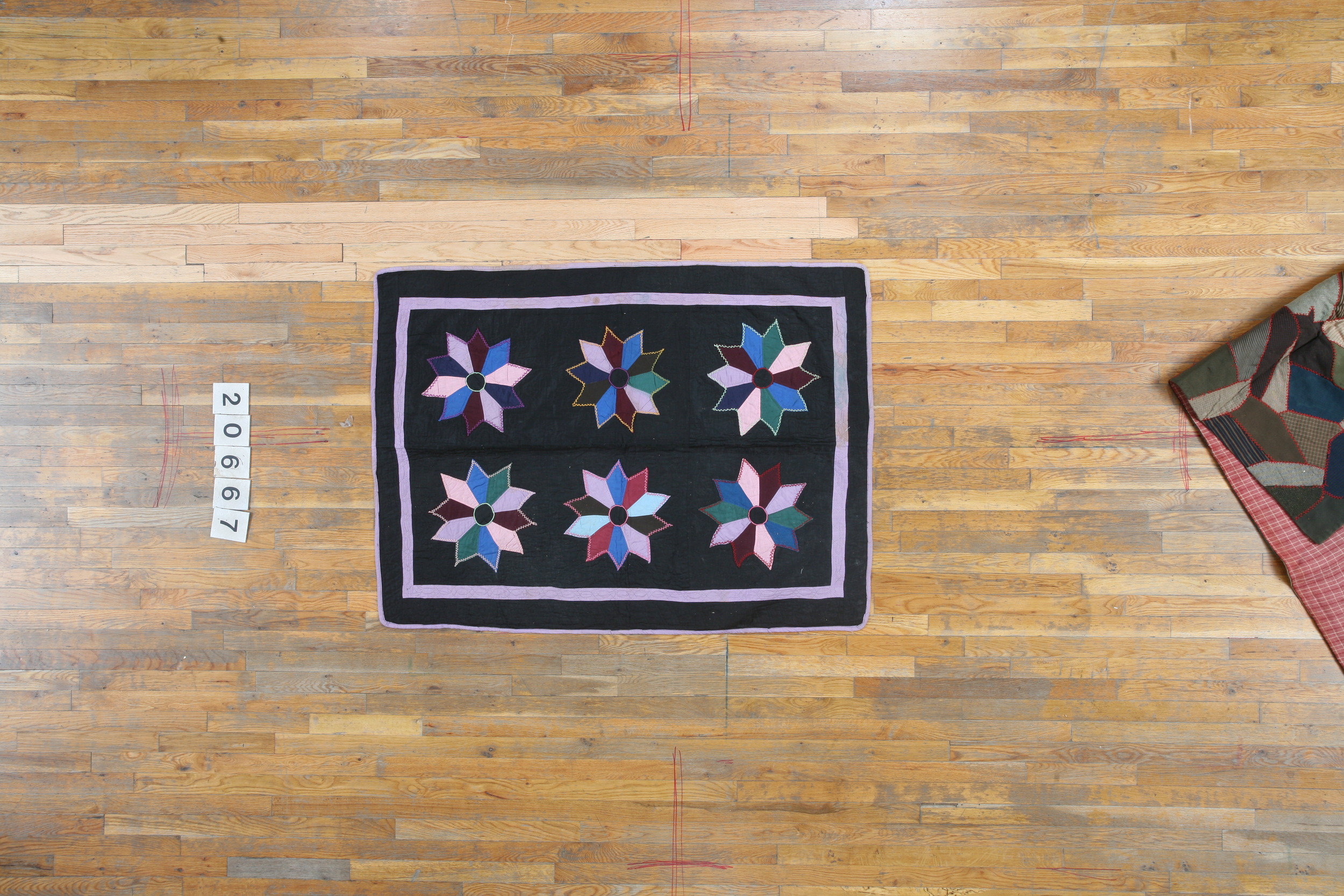 The design features six large, stylized star medallions, meticulously appliquéd onto a deep, nearly black ground. The use of varied hues—ranging from deep maroon and forest green to soft pink and sky blue—creates a dynamic visual field, placing this piece among the finest multicolor jewel tone rugs. Although the medallions are distinct focal points, their repetition across the field creates the effect of an allover pattern contained within the light lavender border.