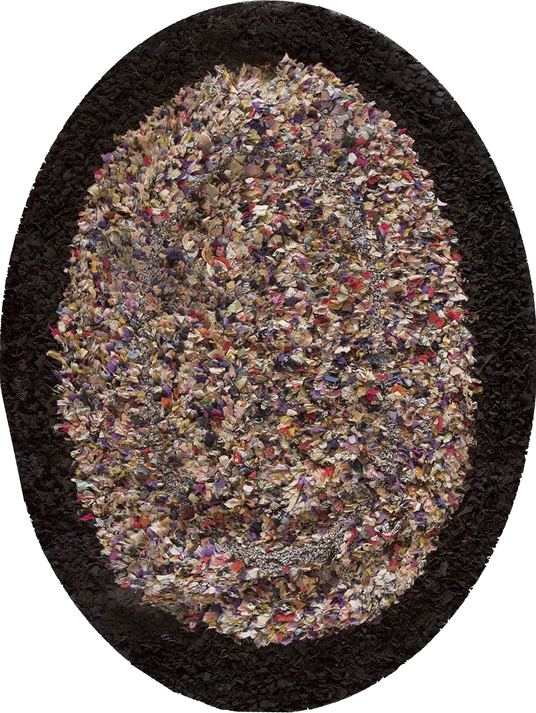 The visual complexity of this oval composition is derived from its highly textural surface and its vibrant, yet earthy, color scheme. The use of varied fabric scraps creates a mosaic of hues, resulting in a dynamic multicolor jewel tone effect that shifts depending on the light and viewing angle.