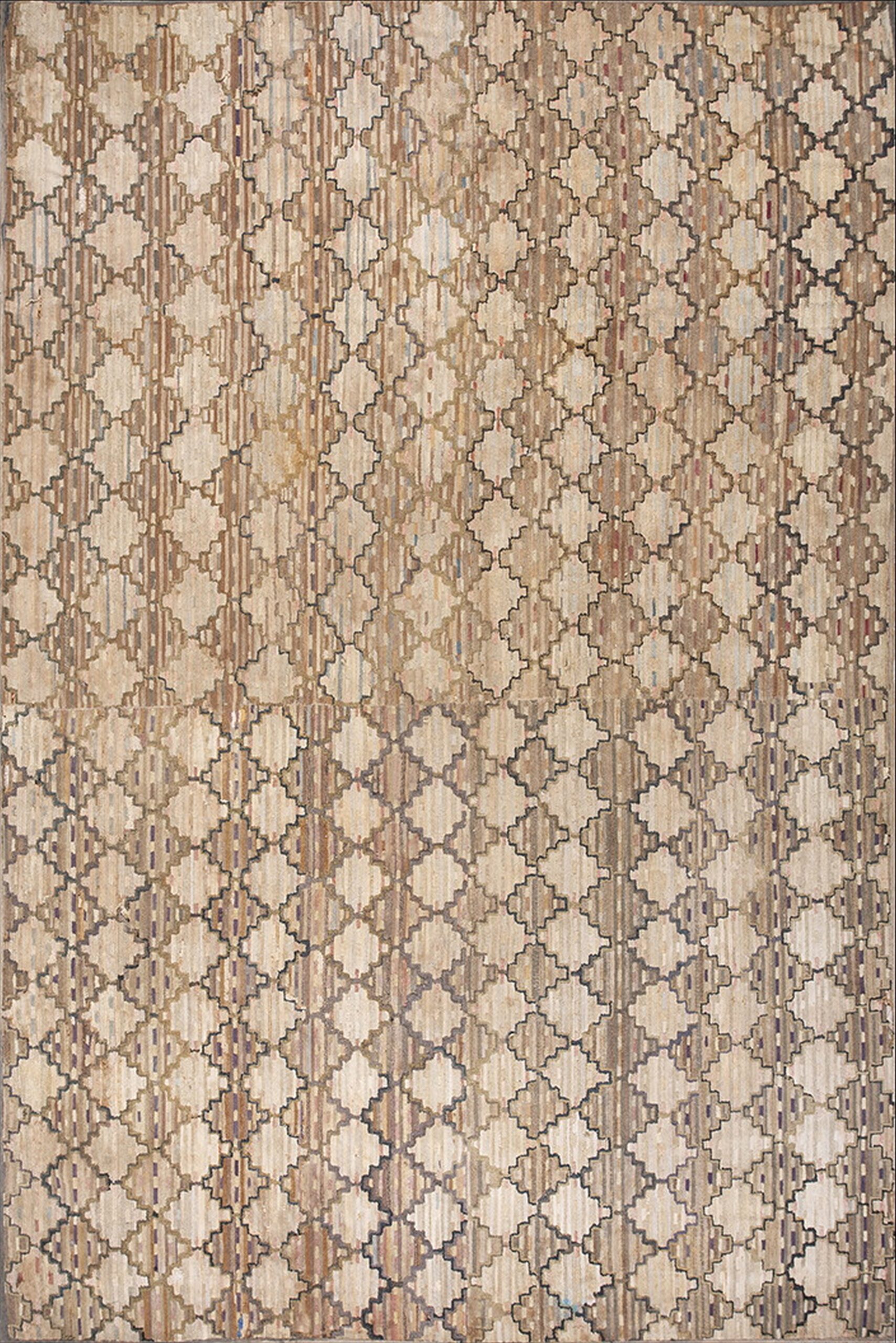 While the overall impression is one of sophisticated neutrality—dominated by natural tans, creams, and warm taupes—closer inspection reveals subtle vertical striping within the diamonds, hinting at a faded multicolor jewel tone palette. This careful use of color variation ensures the piece remains versatile while retaining the charm of true antique rugs.