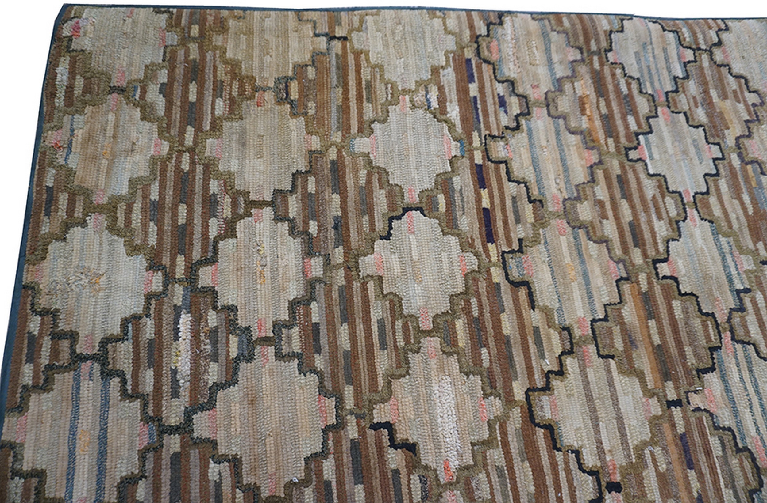 The field presents a captivating, repeating geometric lattice composed of stepped diamond motifs, characteristic of the American Hooked Rug style. These interlocking shapes create a strong vertical rhythm across the surface, providing a sophisticated structure that transcends the typical rustic charm associated with this medium.