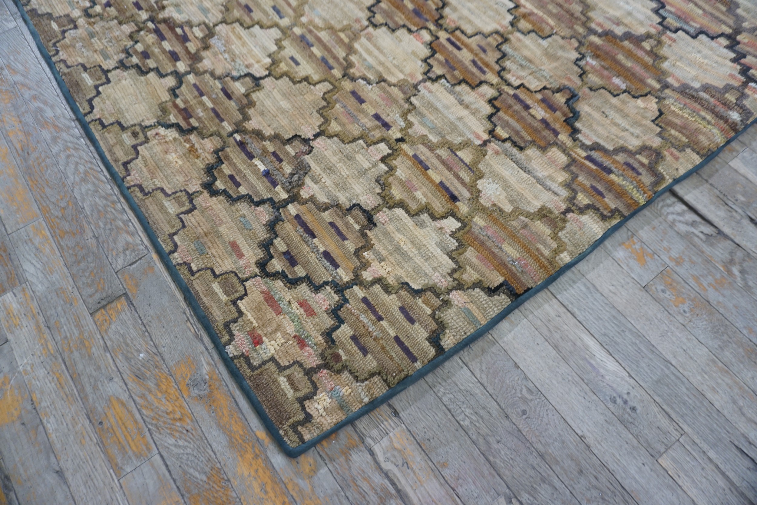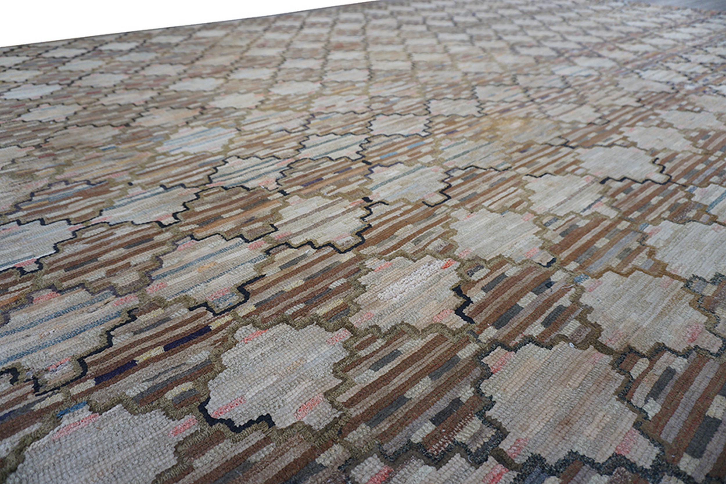 Measuring in a generous room size format, this textile offers substantial coverage, making it an ideal anchor for a living space or large study. The durability inherent in the hooked technique, combined with the timeless geometric design, ensures this piece remains a functional and historically significant acquisition for the discerning collector.