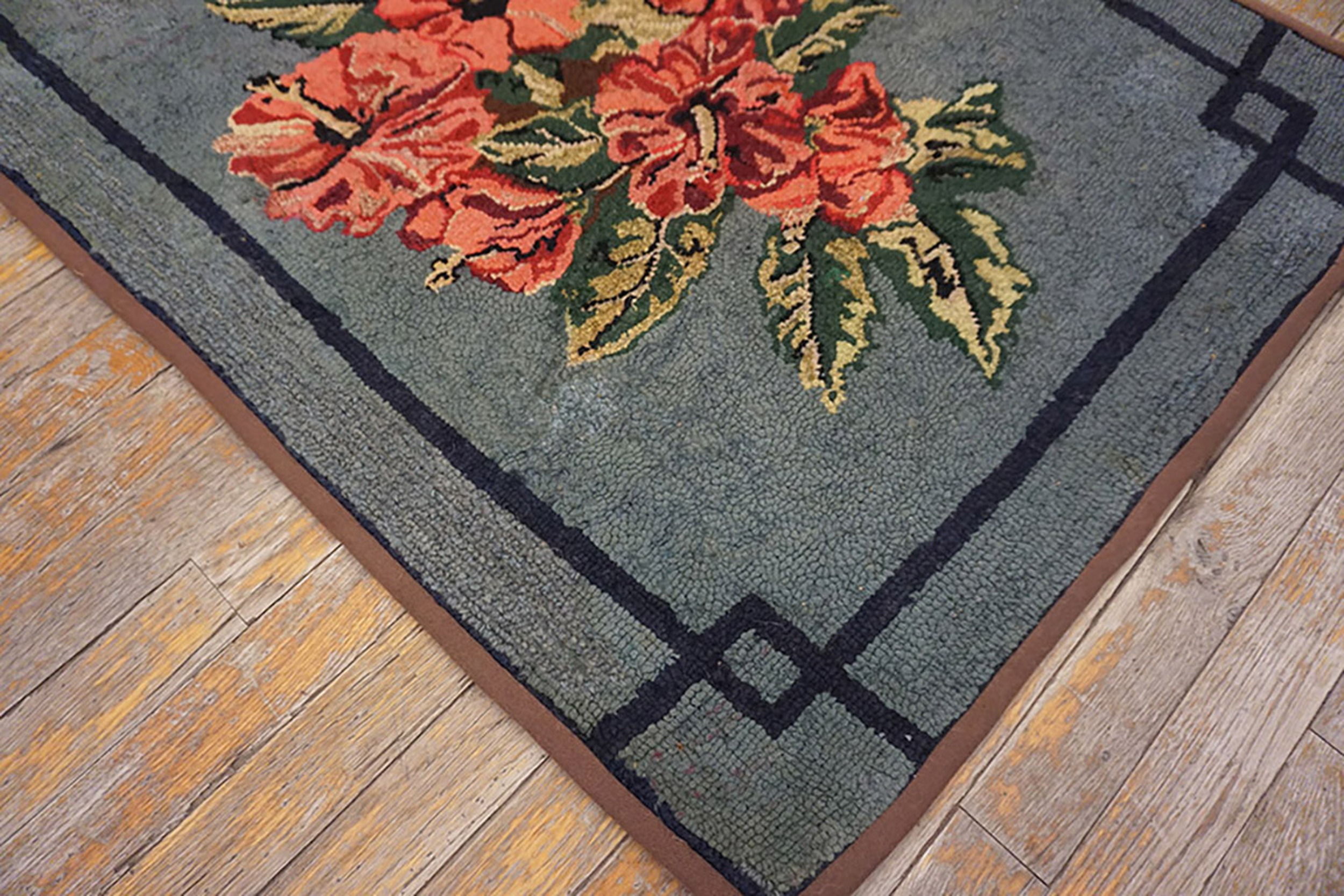 Antique American Hooked Floral Medallion Wool Blue 1935 Rug, Circa Date: 1935. This exquisite example of early 20th-century textile art is a superb representation of the American hooked rug tradition, showcasing the domestic artistry prevalent during the Depression era. The dense, looped wool construction provides a tactile texture that distinguishes it from standard pile carpets.