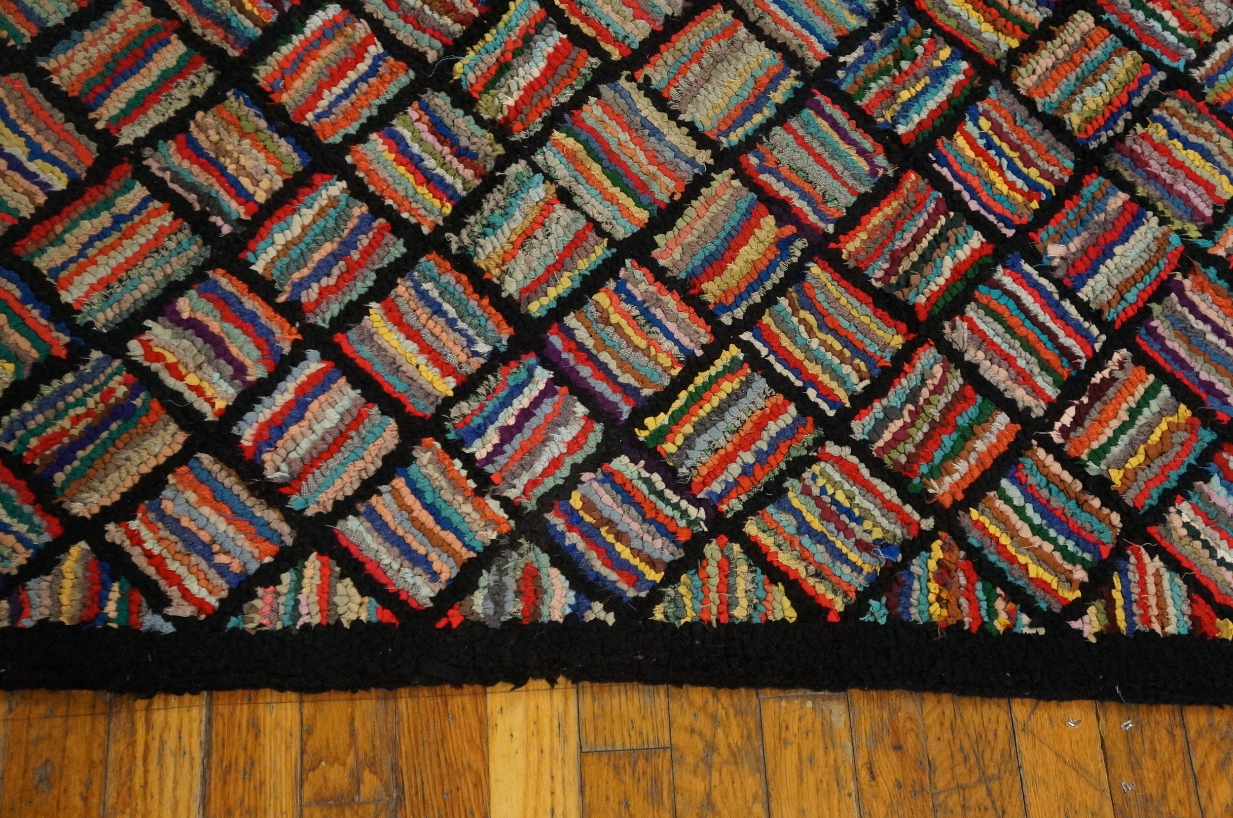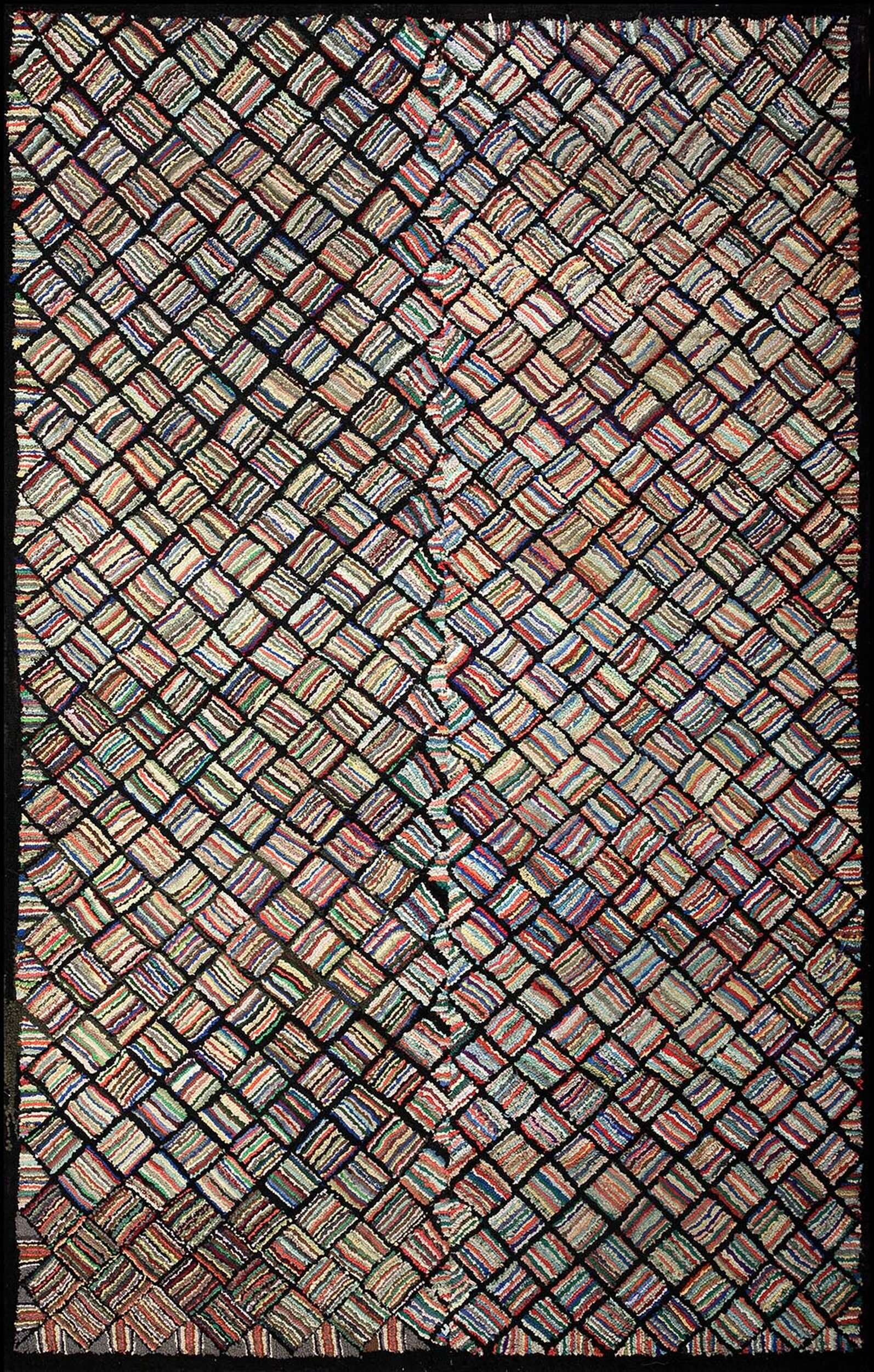 Antique American Hooked Allover Geometric Wool Multicolor Jewel Tones 1930s Rug, Circa Date: 1930s. This exceptional piece represents the height of the early 20th-century folk art movement, showcasing the skilled handwork inherent in the tradition of the American hooked rug. The technique, often utilizing recycled materials, imbues the surface with a unique texture and historical depth, making it a compelling example of antique rugs.
