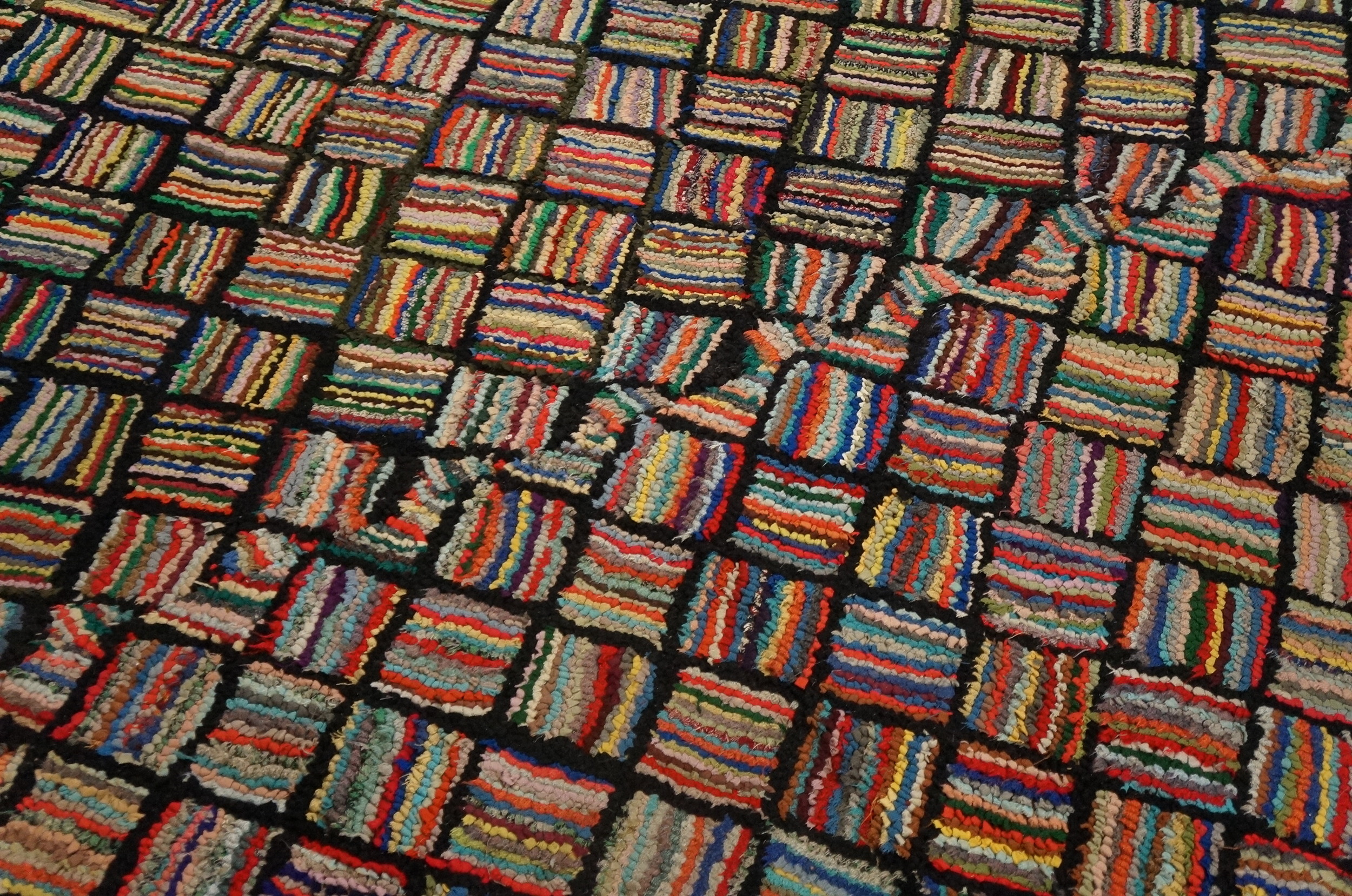 The palette is a masterful study in contrast and saturation. While the overall effect is rich and dark due to the black ground lines defining the grid, the individual strips of wool are saturated with multicolor jewel tones, punctuated by softer, faded hues. This rich variegation speaks to the resourceful nature of its creation, where every piece of dyed wool was incorporated to build a complex tapestry of color.