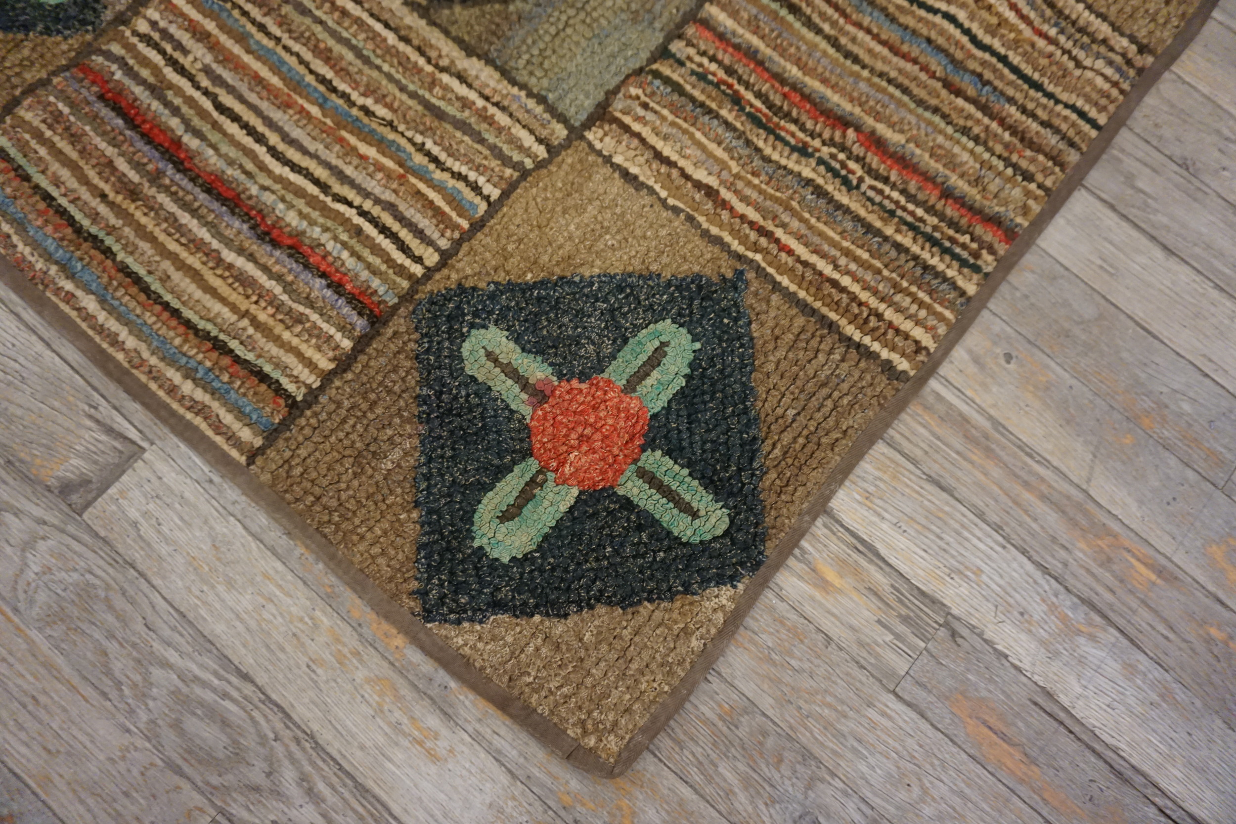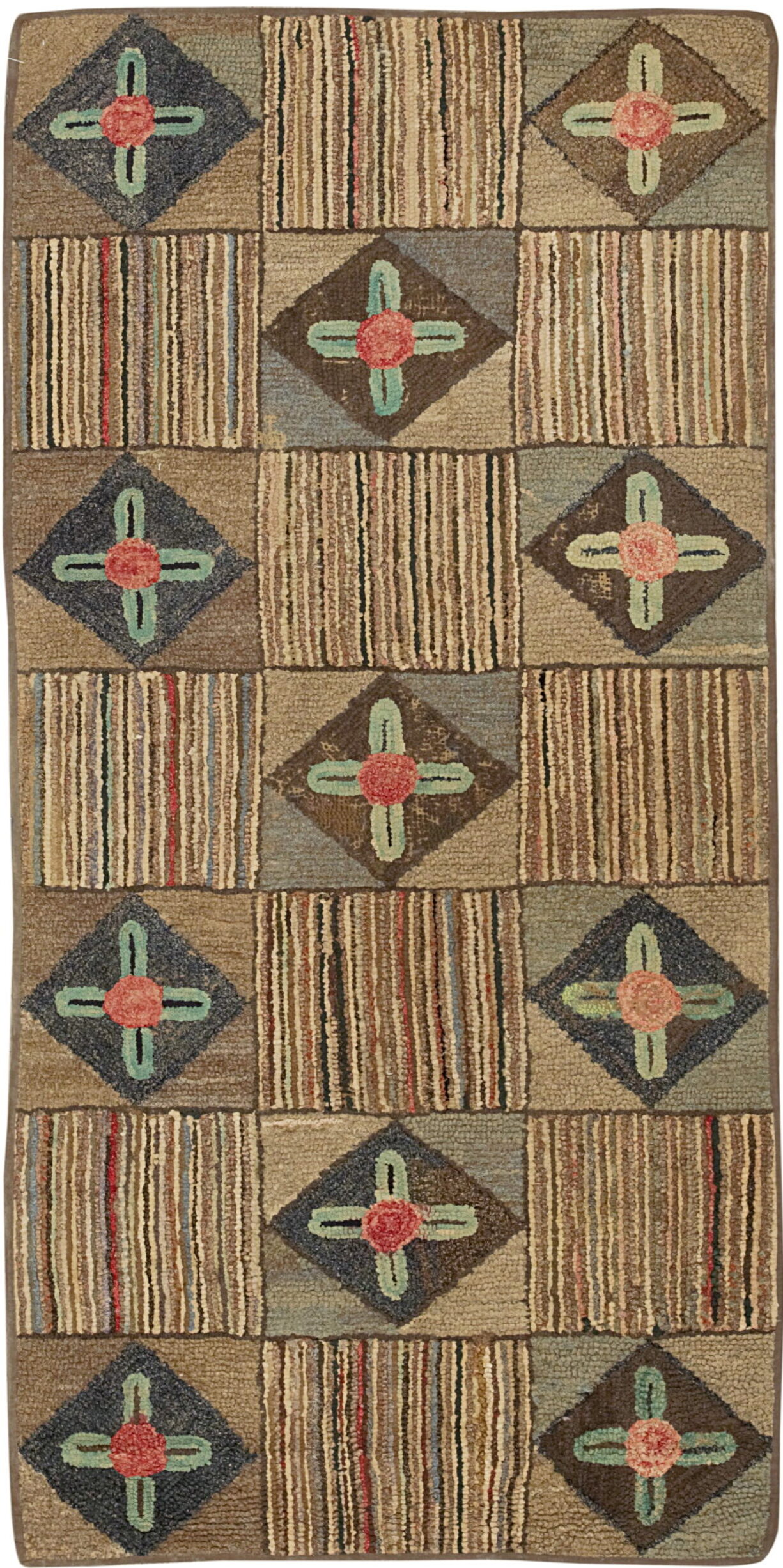 Given its dimensions, this piece functions perfectly as a small scatter size rug, ideal for hallways, bedside placement, or intimate spaces where a touch of texture and historical character is desired. The enduring quality of American hooked textiles, combined with this rug’s appealing geometric structure, ensures its continued relevance in contemporary interiors.
