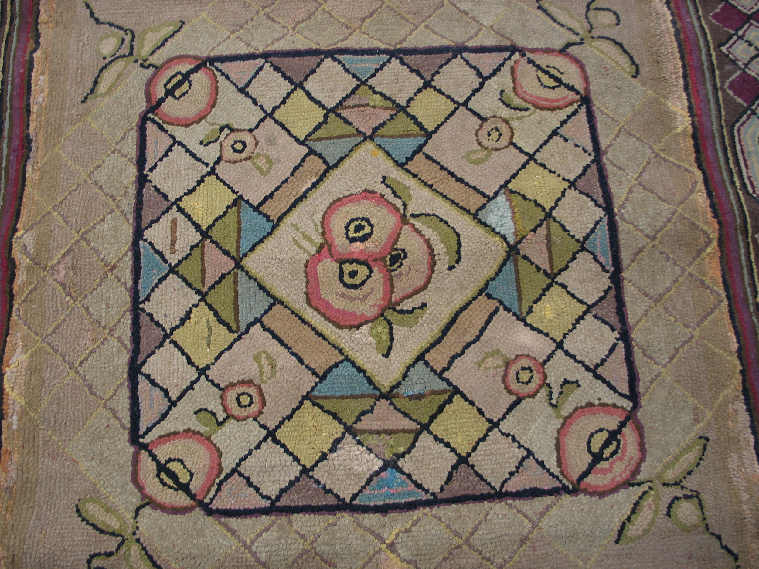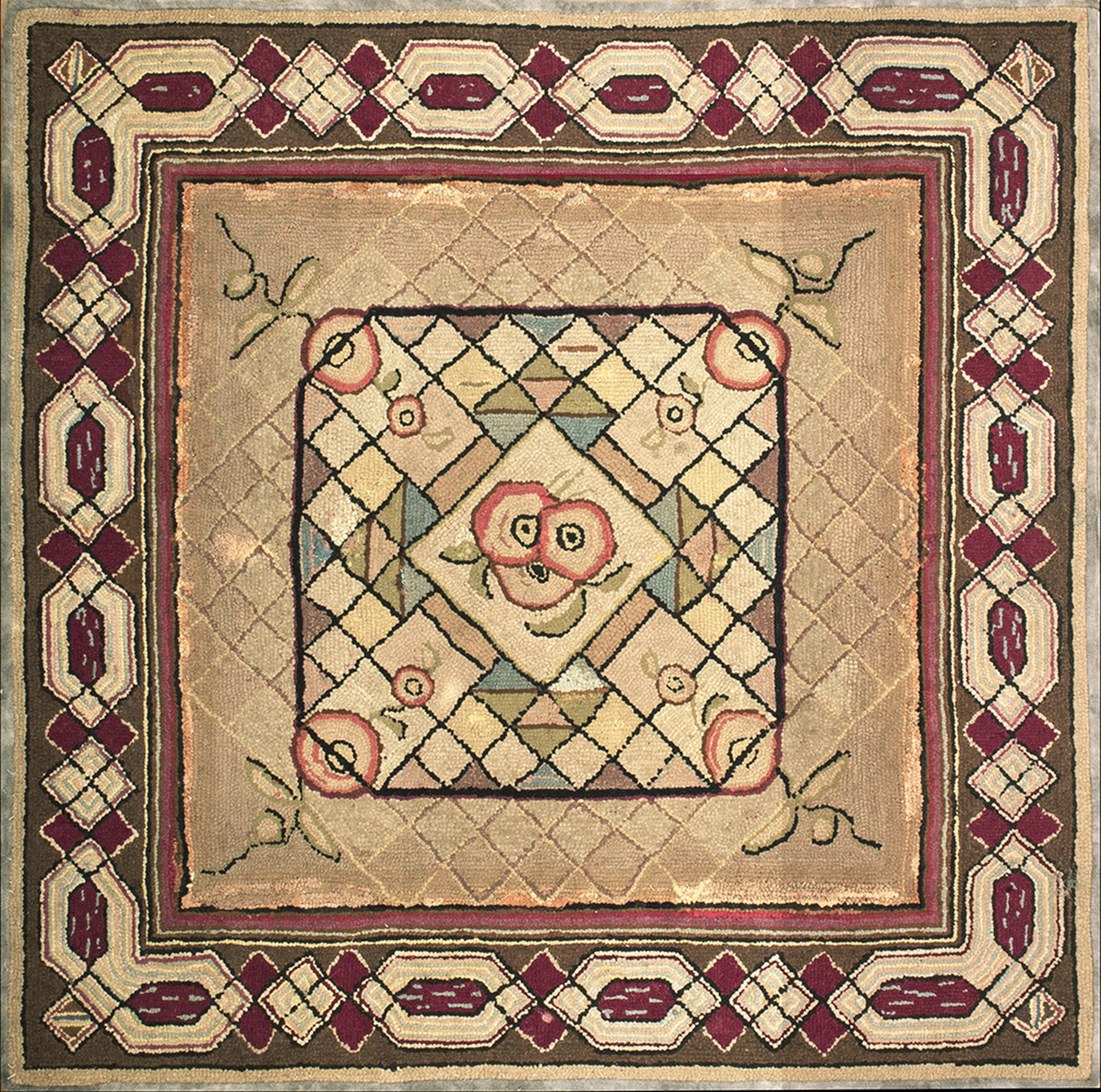 Antique American Hooked Geometric Medallion Rug, Circa Date: 1930s. This charming example of American hooked rugs captures the folk art sensibility popular during the early 20th century, utilizing a dense, textural loop pile that defines its unique character and enduring appeal.