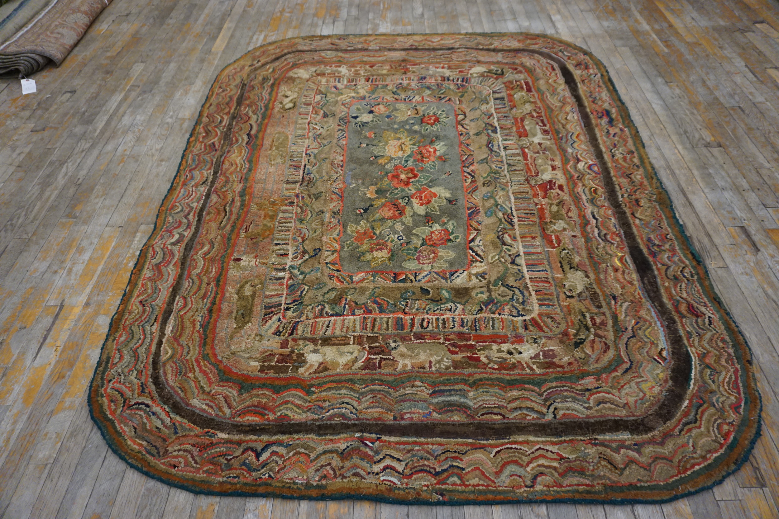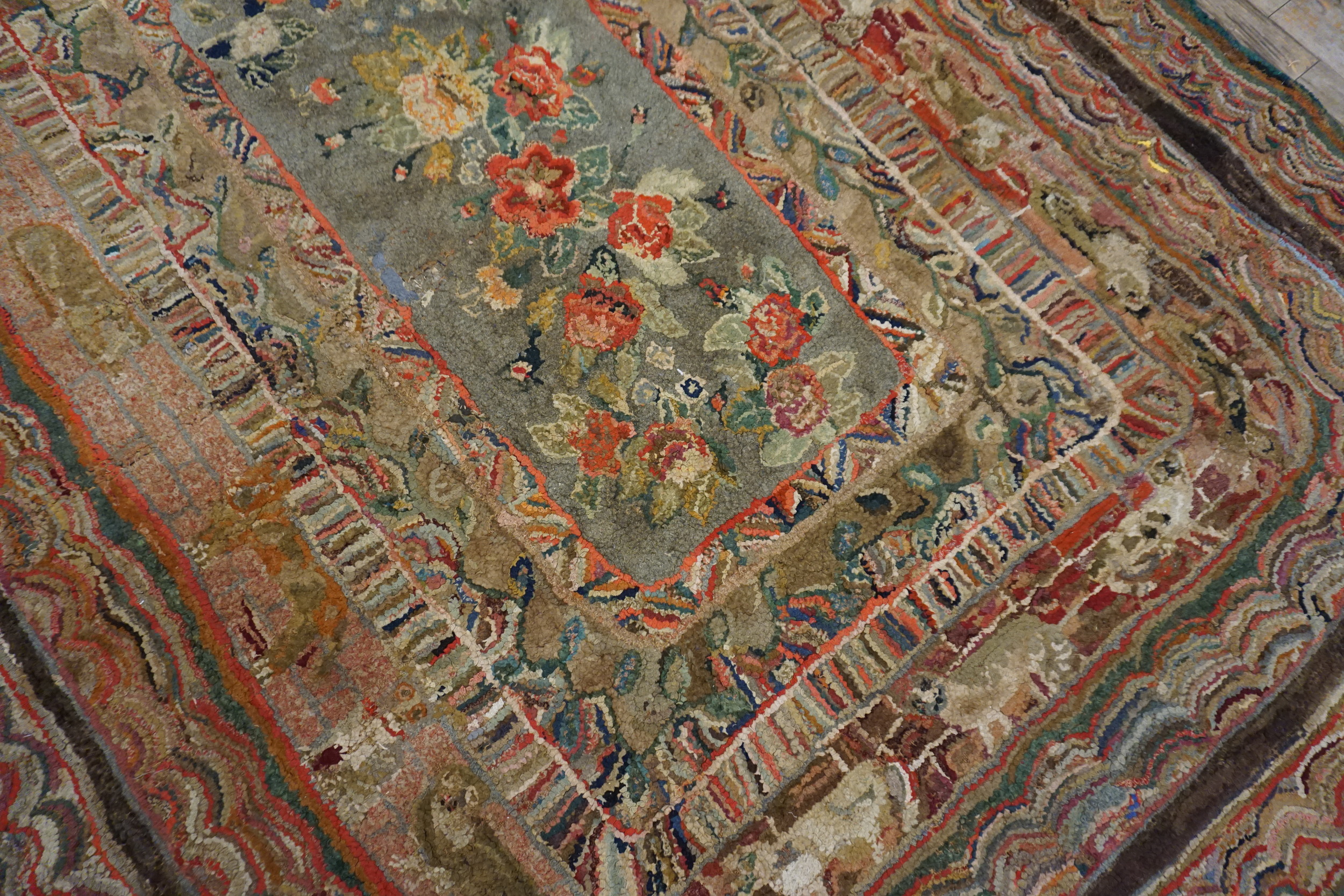 The palette is a masterful compilation of rich, earthy tones, featuring deep crimsons, moss greens, and ochres set against a variegated ground. This complex layering of hues establishes it as a striking example of multicolor jewel tone rugs, where the subtle fading of the natural dyes enhances the textural, three-dimensional quality inherent to the hooking process.