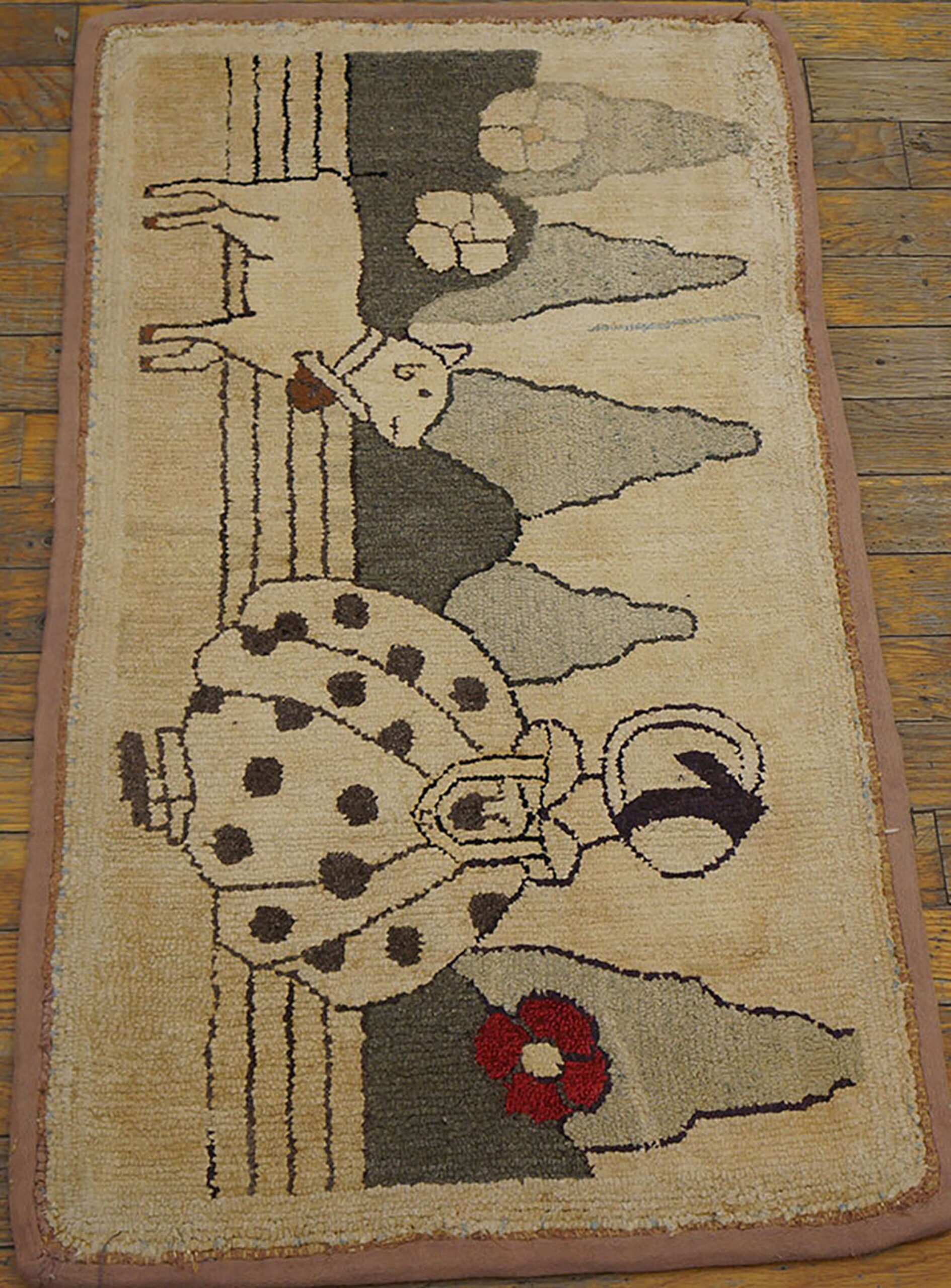 Antique American Hooked Ivory Wool 1920s Small Scatter Size Rug, Circa Date: 1920s. This delightful textile represents the enduring folk-art tradition of the American Hooked rug, a craft that flourished in the early 20th century, often utilizing recycled materials to create charming, domestic scenes. The piece reflects a uniquely American aesthetic, characterized by its textural depth and naive, pictorial composition.