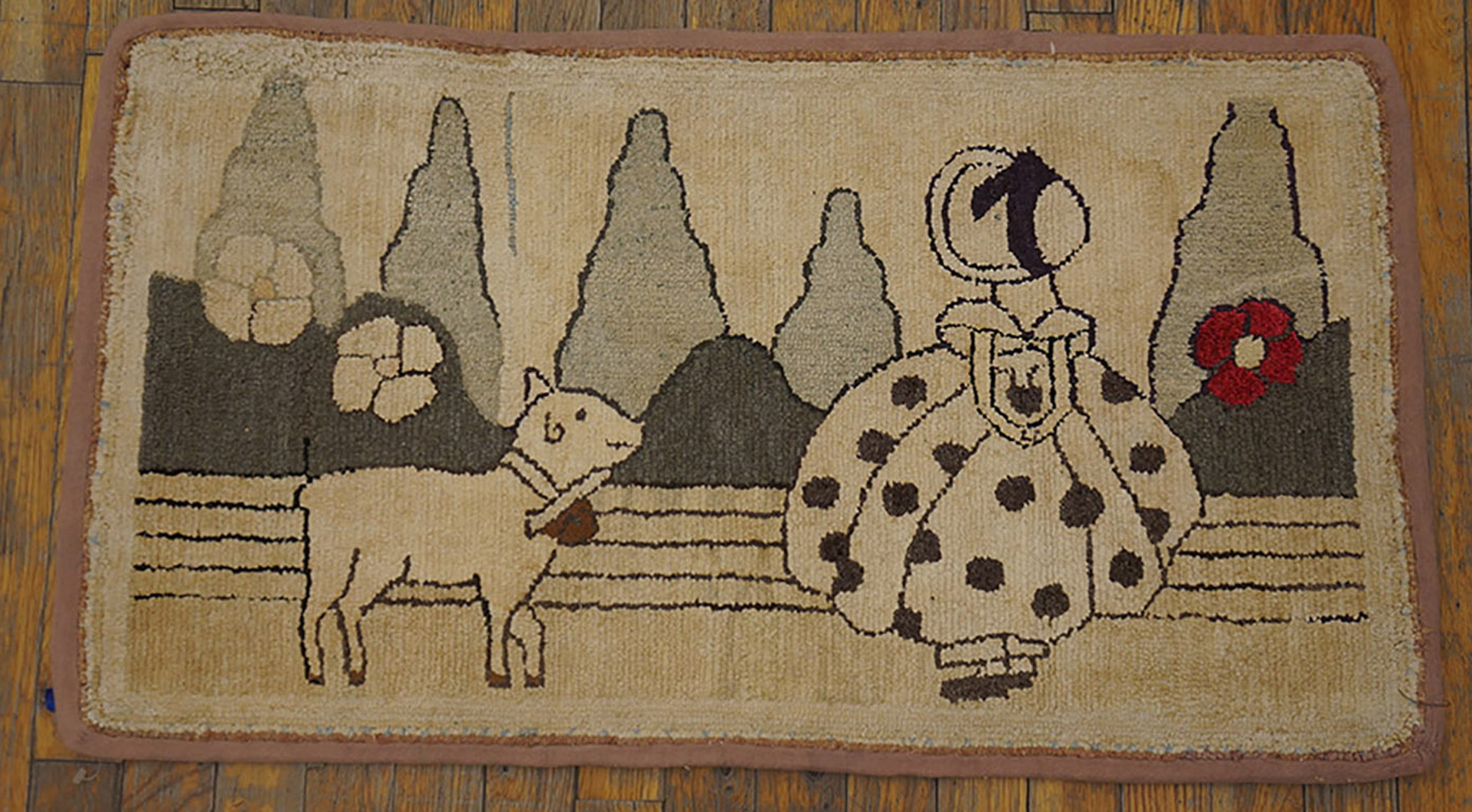 This piece is more than a floor covering; it is a captivating piece of Americana, reflecting the charm and simplicity of the 1920s aesthetic. Its naive artistry and enduring condition make it a highly desirable acquisition for collectors of textile history or those seeking exceptional antique rugs with character and provenance.