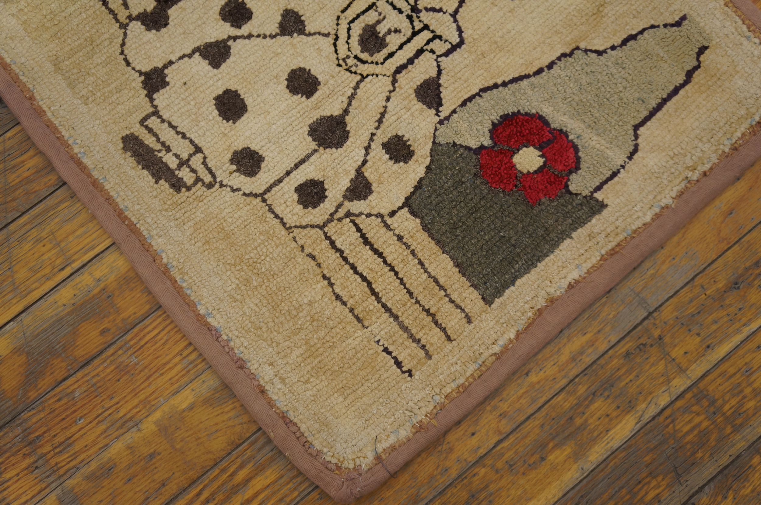 Executed in durable, textured wool, the hooked technique gives the surface a robust, slightly shaggy pile, characteristic of period American domestic textiles. Its construction speaks to a tradition of skilled, utilitarian artistry. Given its modest dimensions, this small scatter size rug is perfectly suited for placement in a hallway, nursery, or as an accent piece beneath a small table, offering a unique focal point without overwhelming a space.
