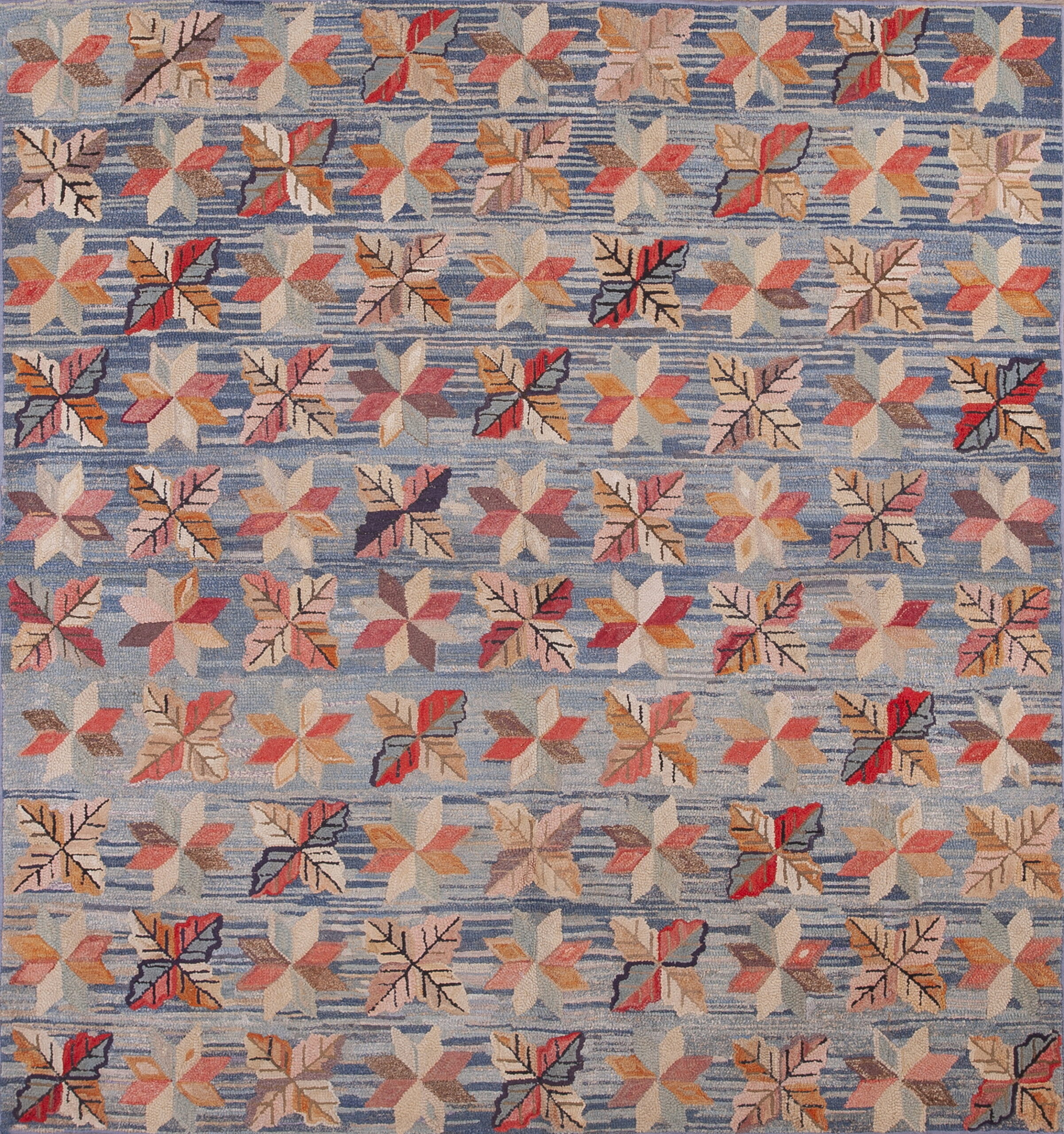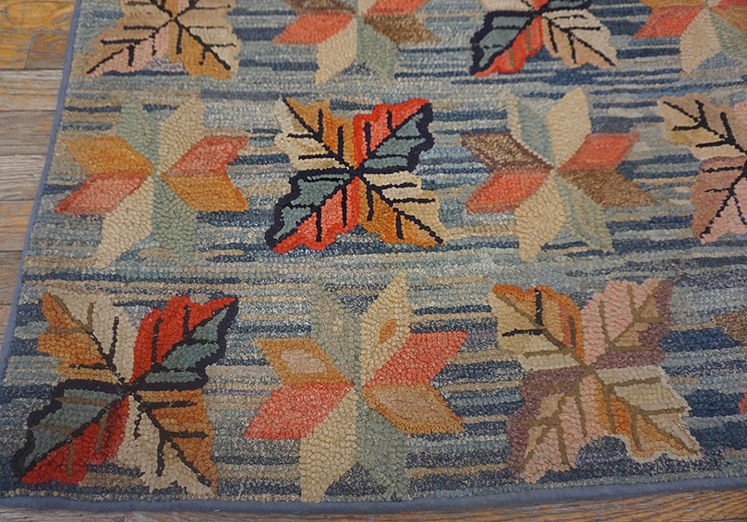Antique Allover Floral Wool & Cotton Hooked – Loop Pile Blue 1890s Rug, Circa Date: 1890s. This exceptional textile represents a fascinating period in the history of antique rugs, showcasing the domestic artistry achieved through the hooked, loop-pile technique. The combination of durable wool and cotton provides a substantial yet soft foundation, characteristic of high-quality American folk art textiles from the late 19th century.