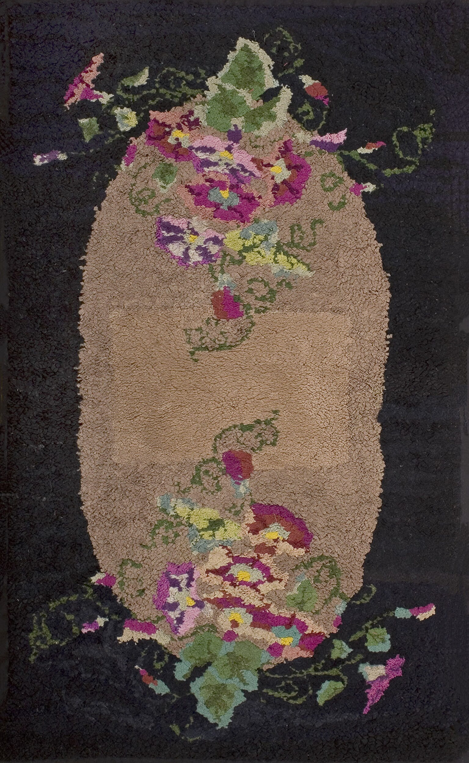 The design features a striking contrast between the deep, near-black ground and the central tan field, which is framed by robust, stylized blossoms. The composition utilizes bright magenta, pale lavender, and sage green, making it an excellent example of mid-century floral rugs that eschewed traditional formality for domestic charm.