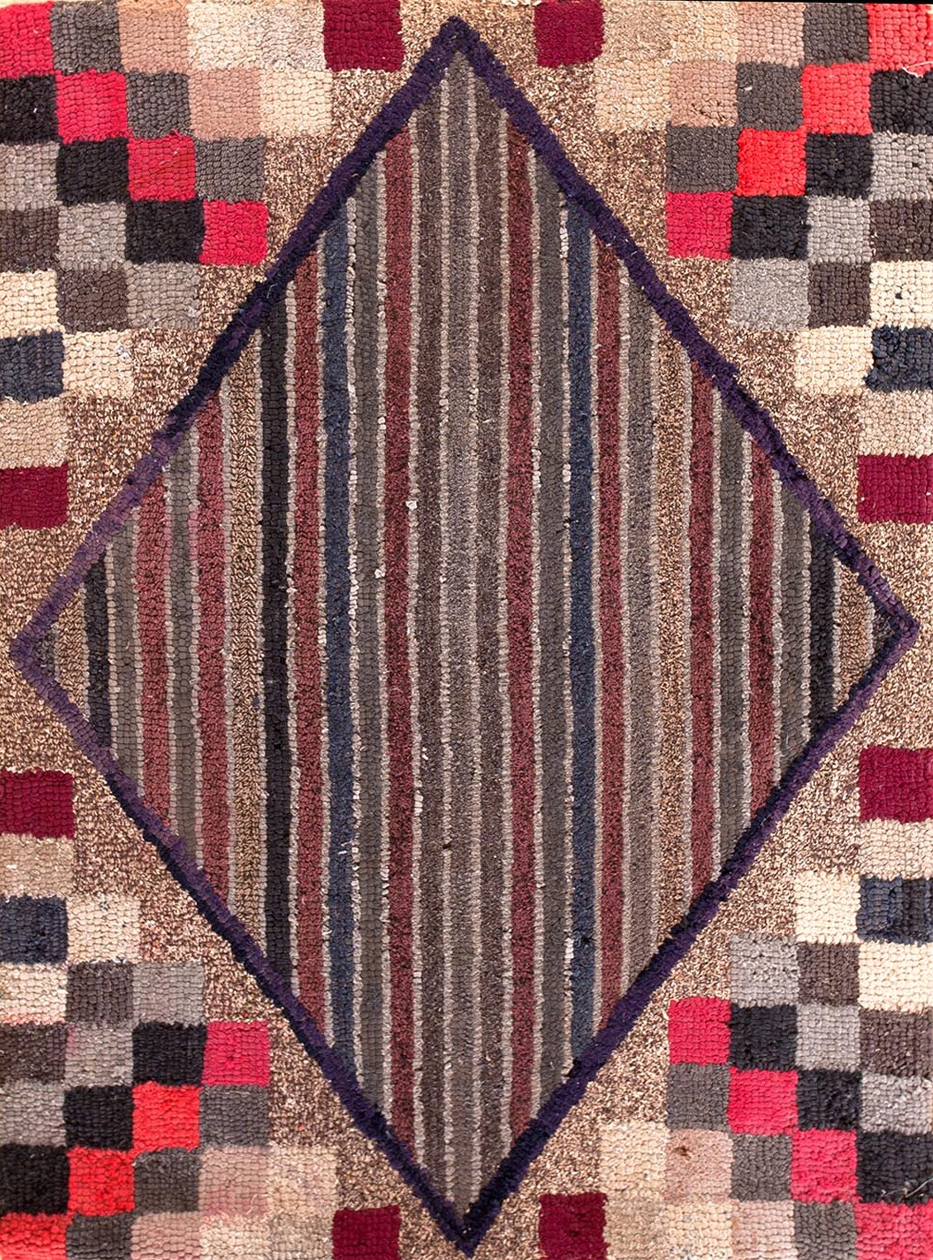 The design is a sophisticated study in contrast, utilizing strong, defined lines to create a dynamic composition. A large central diamond, filled with dense vertical stripes in varying shades of maroon, gray, and blue, dominates the field. This central motif is framed by a border of alternating squares, demonstrating a mastery of geometric rugs that elevates the piece beyond simple utility. Such pieces are highly sought after by collectors of fine antique rugs.