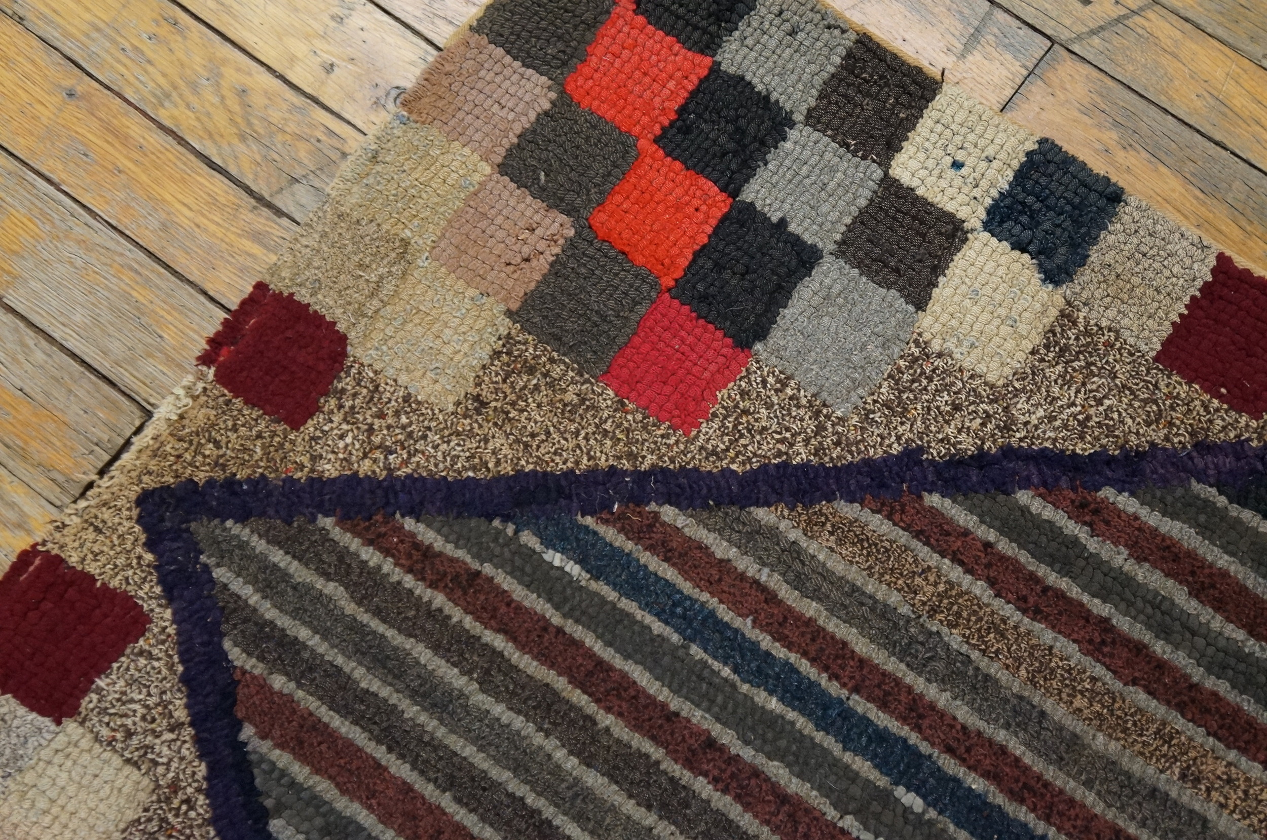 The palette is rich yet grounded, featuring deep maroons, navy blues, and charcoal grays set against a warm, speckled beige background. While rooted in traditional early American materials, the vibrancy of the accents allows this piece to function beautifully among contemporary furnishings, offering a unique blend of historical texture and modern color appeal, fitting perfectly within the category of multicolor jewel tone rugs.